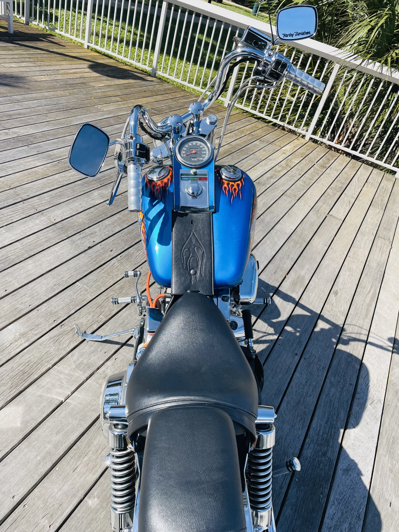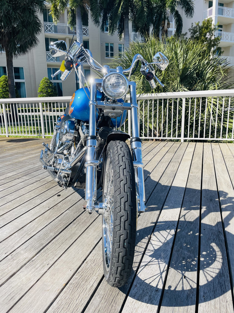 This bike has original 20,906 miles. The Florida title still shows the mileage as “actual”. The speedometer does not appear tampered with and with the title being original miles we have to assume this is the correct mileage on the bike. This is the Wide Glide version with slim front tire and wide front forks. The chrome on this bike is exceptional well conditioned. The wheels do not show rust etc. Just an exceptional find.