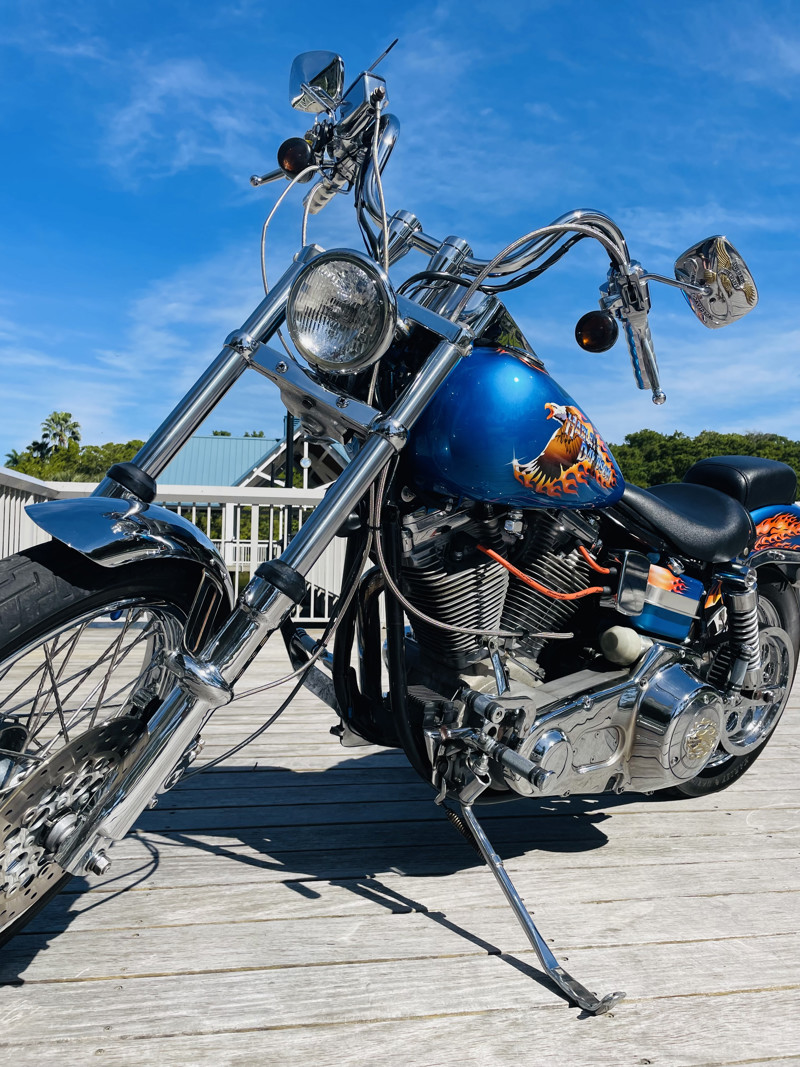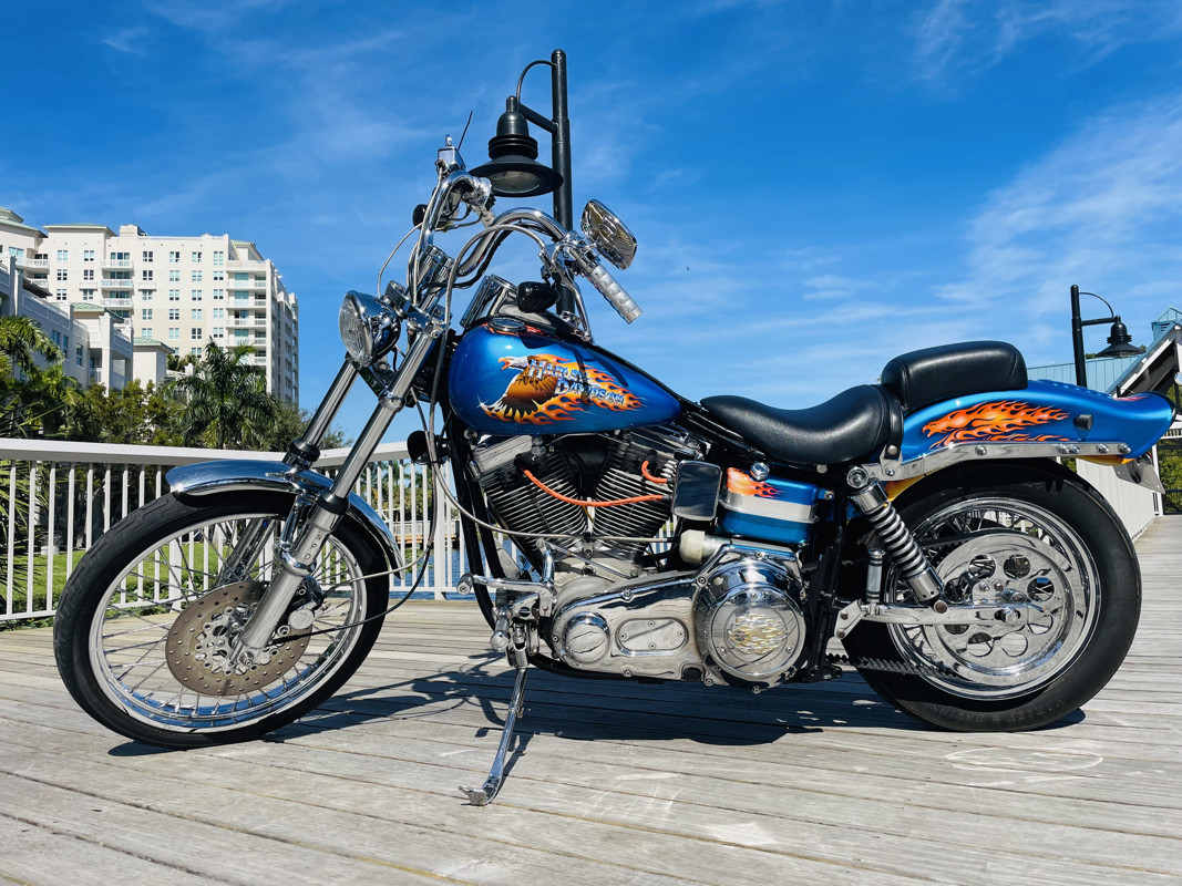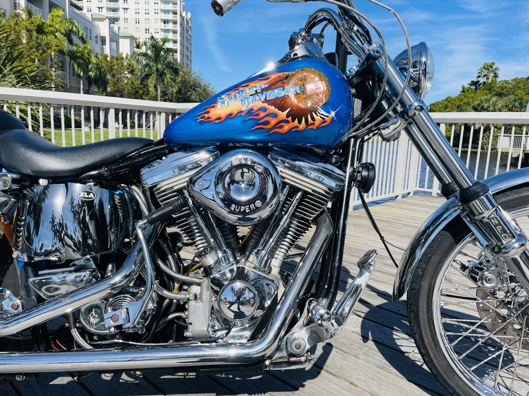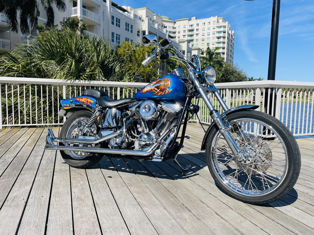 This classic bike has it all. The unique old-school look and feel of the Harleys post WWII and the brand new engine technology of the EVO motor, arguably the best motor Harley has produced to date. The blend of old and new makes this now classic Wide Glide an exceptional find. Custom painted the bike still shows exceptional on the tins with the tank having two dents on the right side. One if covered almost expertly by a decal that blends into the custom paint job and disguises the dent the other is barely visible unless you look for it. Pointed out in the Walk-Around-Video on our website.