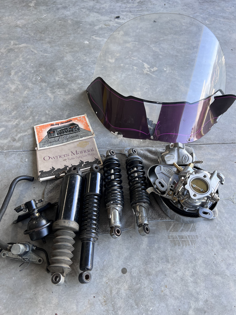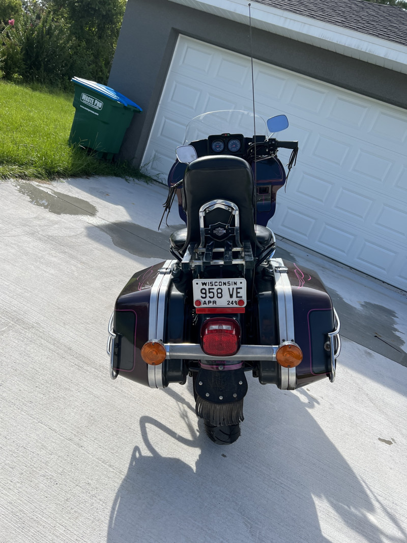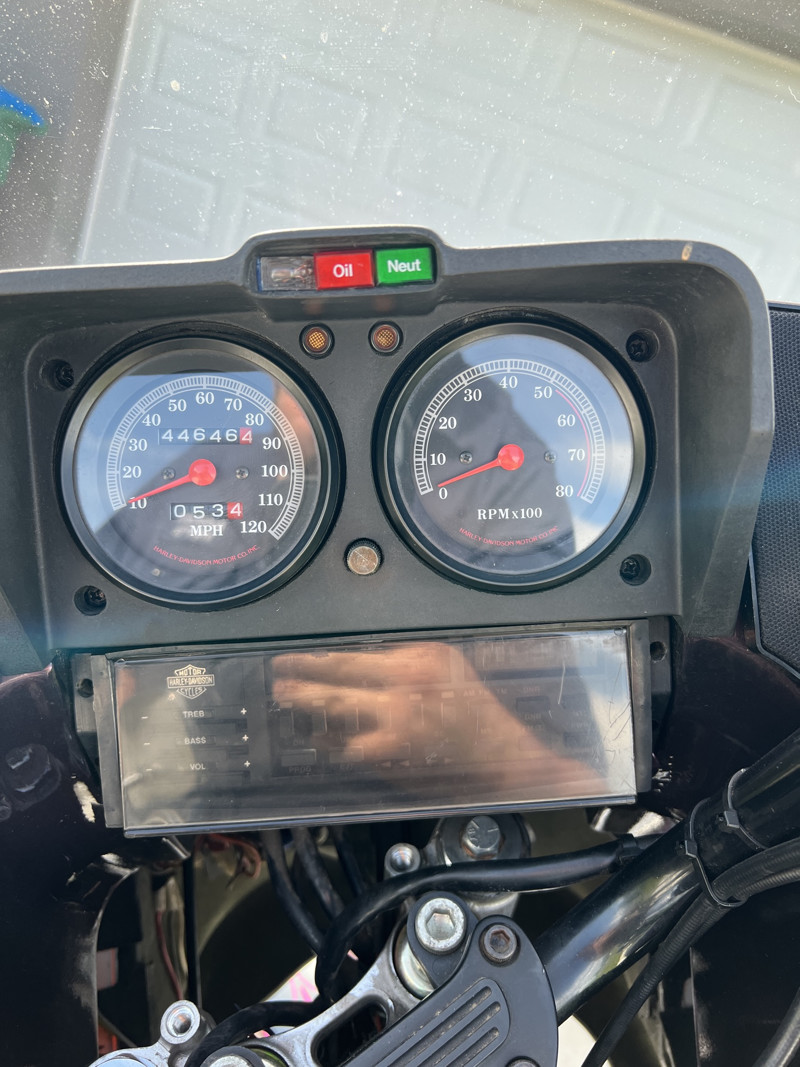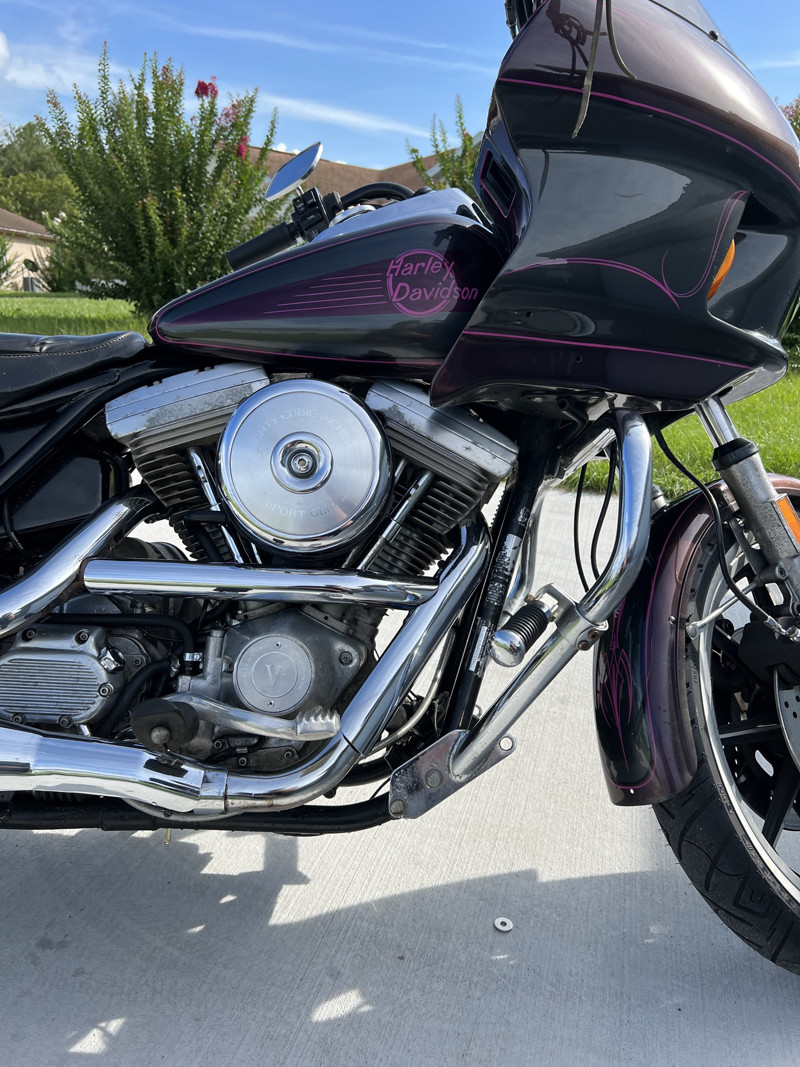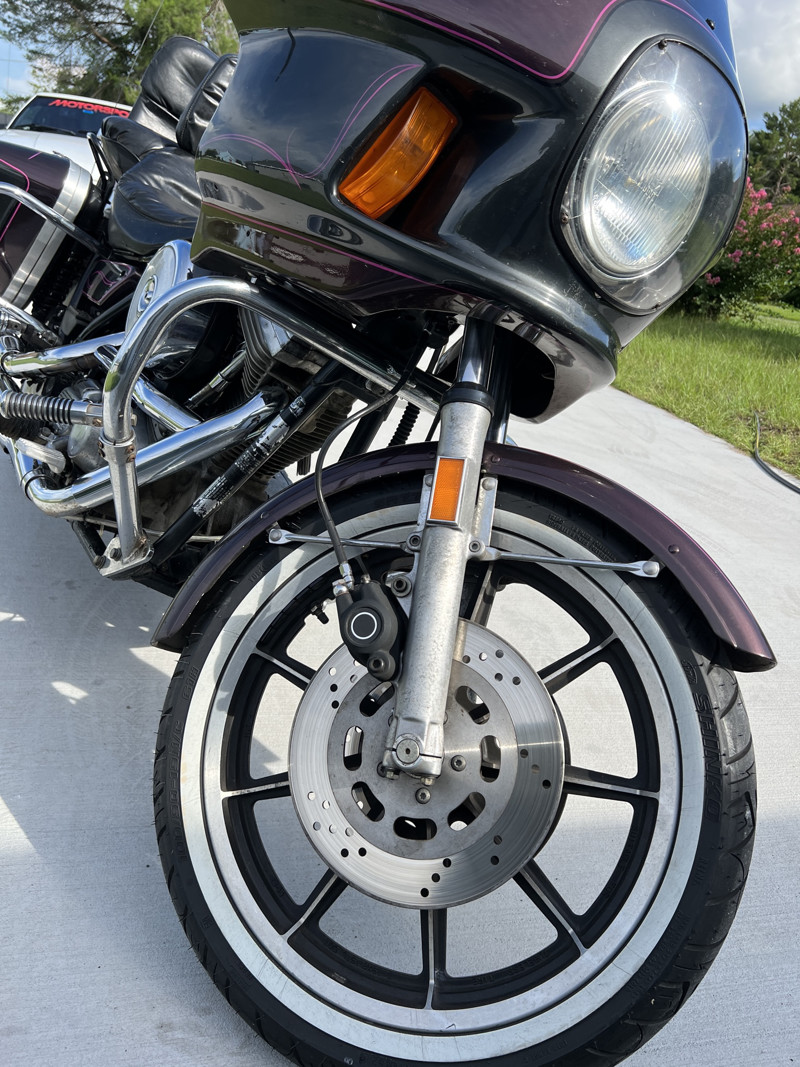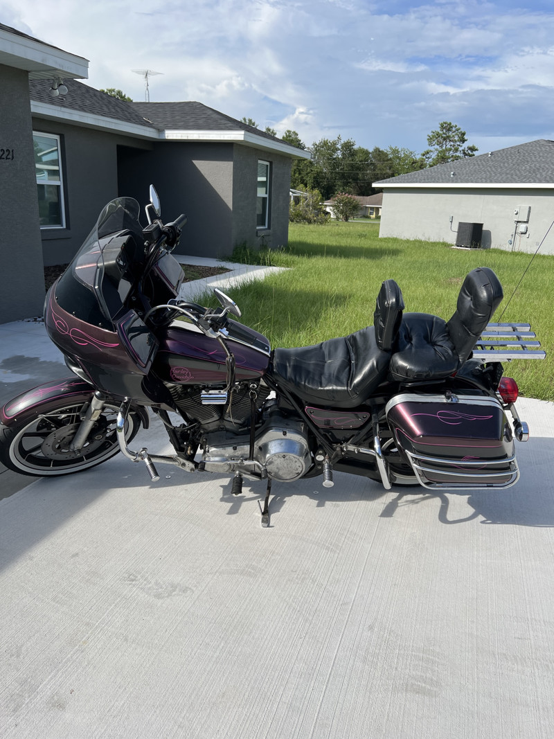 Details - 1987 Harley FXRT. 44k miles. Factory Harley Radio that works great. 90% original and the engine and transmission are 100% bone stock. No leaks anywhere. New parts include: S&S drive belt and all applicable seals regarding a belt change, new swingarm bushings, all fluids changed, new progressive springs in the front 35mm forks with a rebuild kit, new progressive 412 rear shocks, stainless steel front and rear brake hoses with rebuilt master cylinders, rebuilt all 3 calipers, with new pads. Rotors are in great condition. New whitewall tires with less than 1000 miles on them, wheel bearings replaced in the front and rear when tires installed. New exhaust gaskets (factory exhaust). Harley keihin butterfly carb rebuilt with CV performance kit and idle screw with new intake manifold boots/compliance fittings. New oil lines on the engine. Freshly installed Kinetic front motor mount. I’m certain I’m forgetting a few things. I have put 3-4k miles on this bike absolutely problem free. Comes with a complete S&S super e carb kit with an intake manifold, the factory air ride components, the factory rear air shocks, the owners manual and radio manual, a Harley branded outdoor weather cover, and the original paint damaged windshield. The fairing is original however my grandpa modified it to relocate the turn signals back in the 90s when the paint was done. Please ask any questions and feel free to call/text - 7one5-37one-08nine8. Located in Ocala, FL. Thanks!