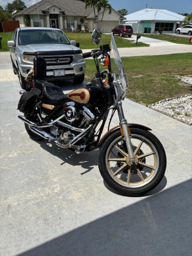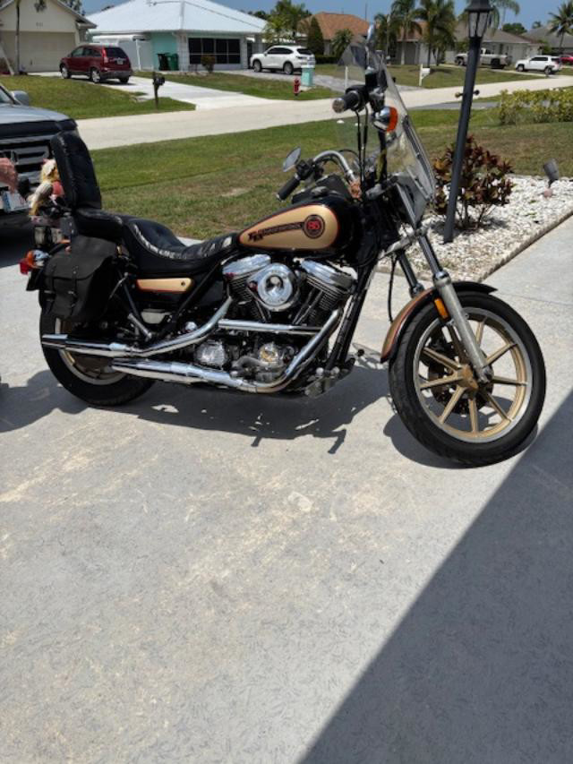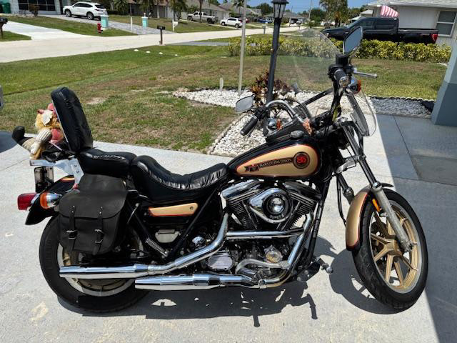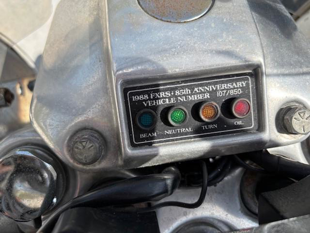 1988 HD FXRS Low Rider 85th Anniversary Edition, Black and Gold original paint and tank, lots of chrome, 24000 miles, clean title, original one owner (Willie G certificate ownership) and garage kept, S&S Carb, full windshield, king/queen seat, leather saddle bags (weathered but leakproof), new Dunlop tires, new battery, new clutch cable, and recent fully serviced. This is a sharp looking classic bike, and runs like a champ, no issues. Contact me for any further info reqired.