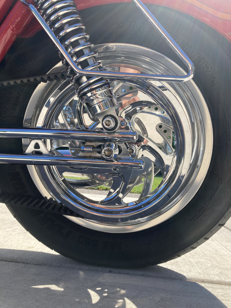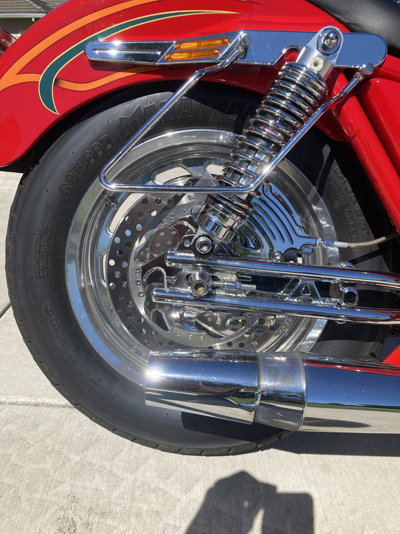Lowered suspension, stretched frame, raked, stretched tank. Frenched in taillight. Polished engine, transmission and engine cases, polished rims. Custom rear fender struts with turn signals inside.