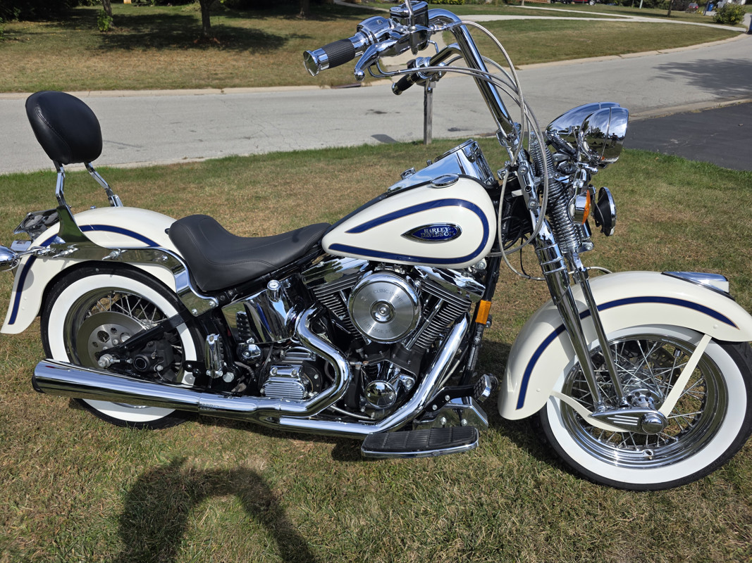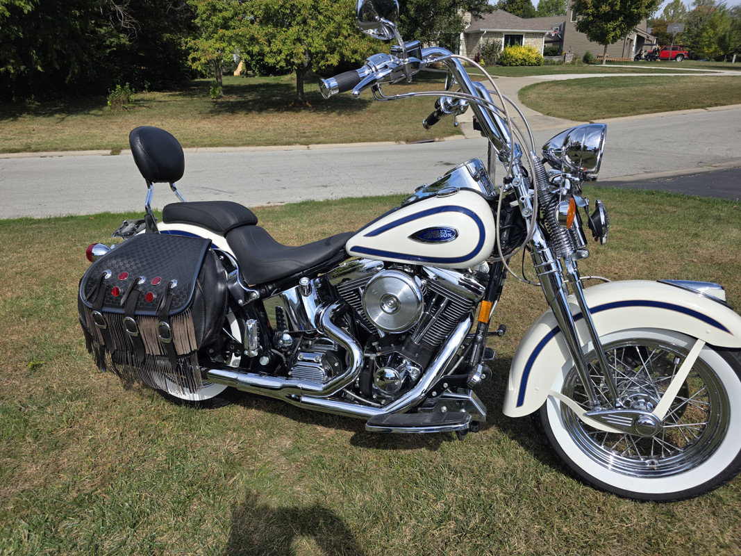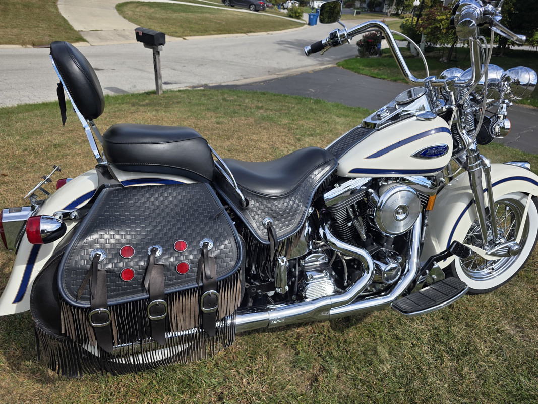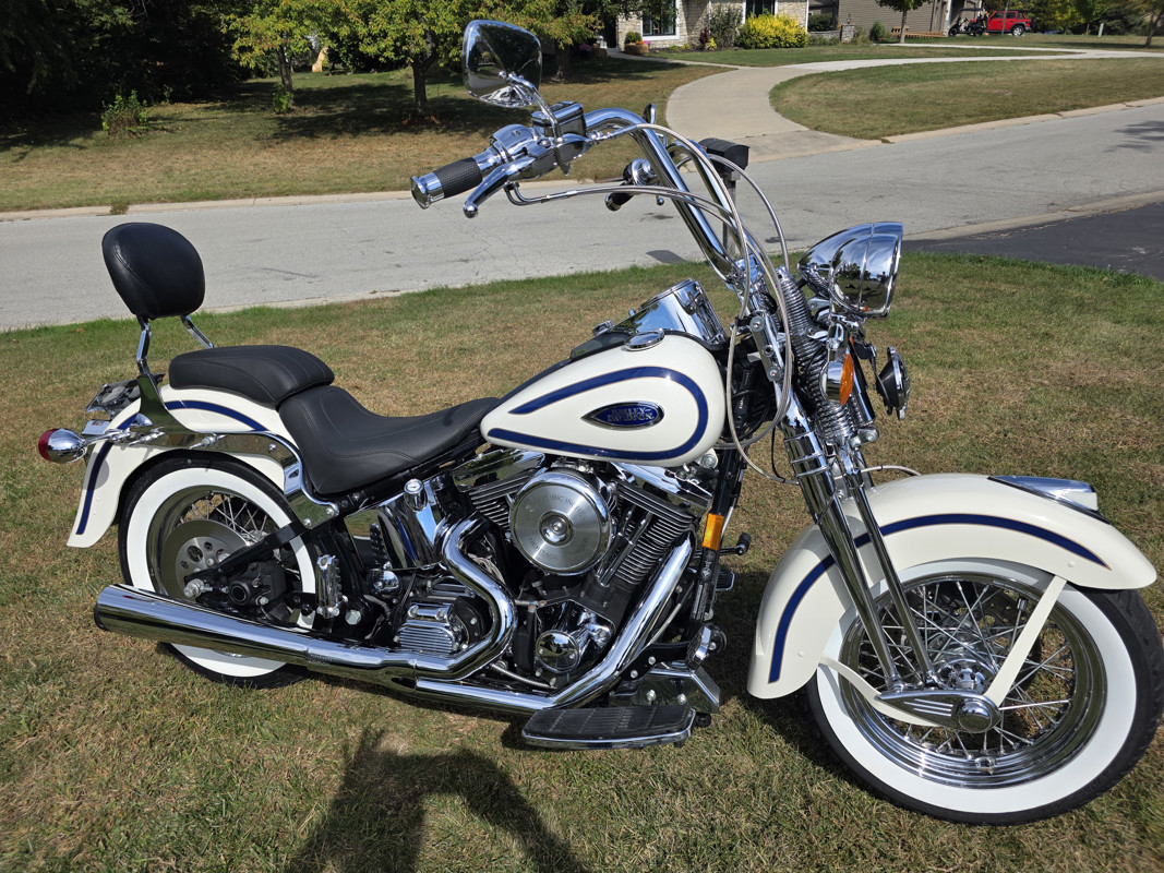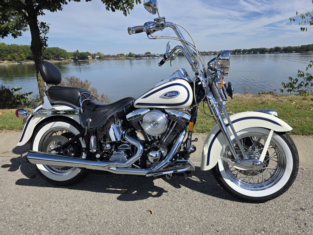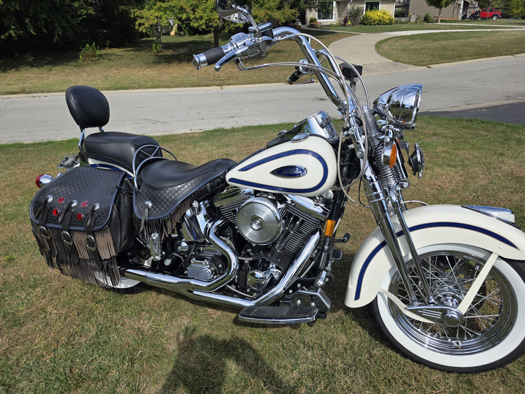 OMG!!! Look at this first year Heritage Springer finished off in birch white and blue. Nic named the "Ol Boy" Considered by many to be the most beautiful springer produced by the Motor Company. Best running EVO I've ever owned. Equipped with quick remove windshield, sissy bar, 12 inch Chubbys, chrome switch housings, extended controls and more. Also has extra Mustang low profile seat for solo or 2 up riding. Performance upgrades include Andrews EV27 cam, Mikuni 42mm carb and more. This bike looks and runs like new