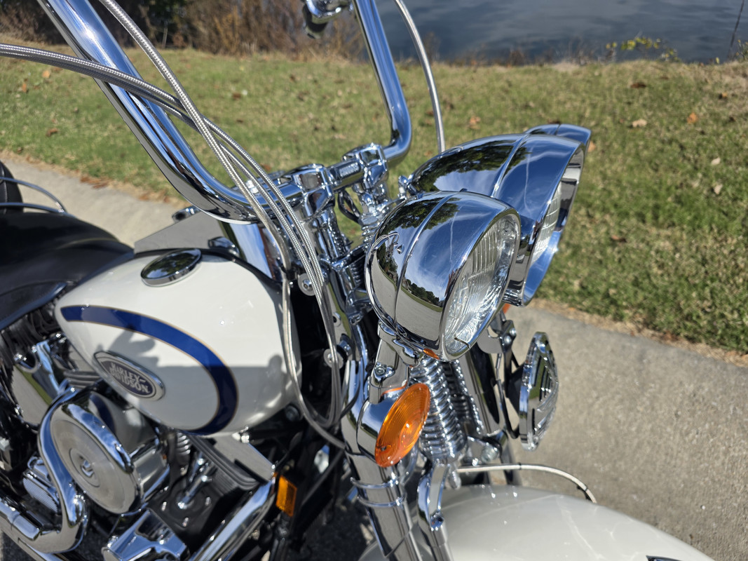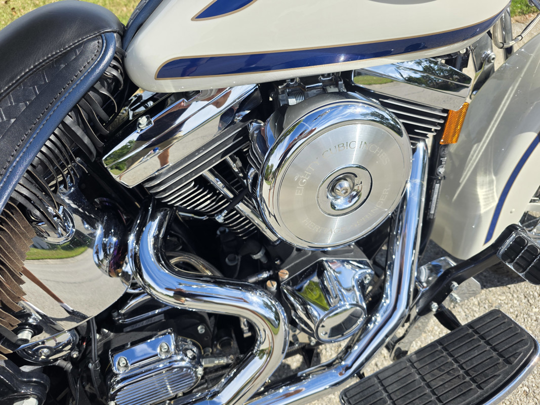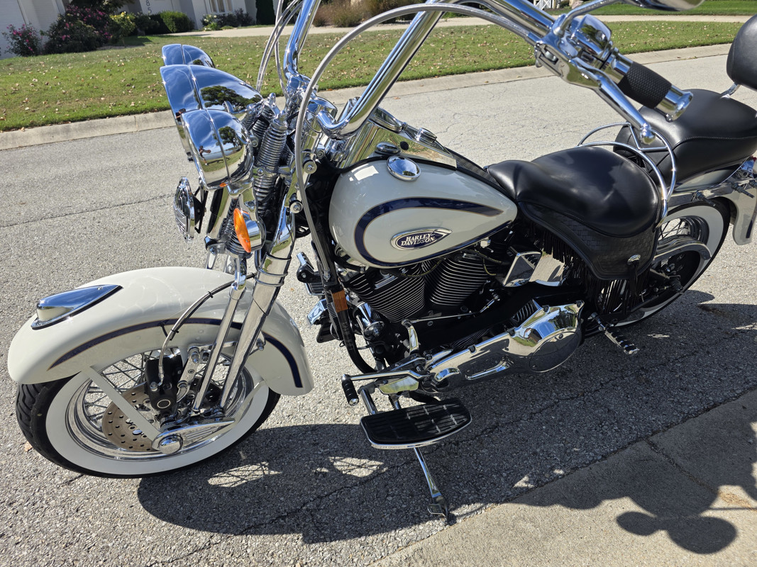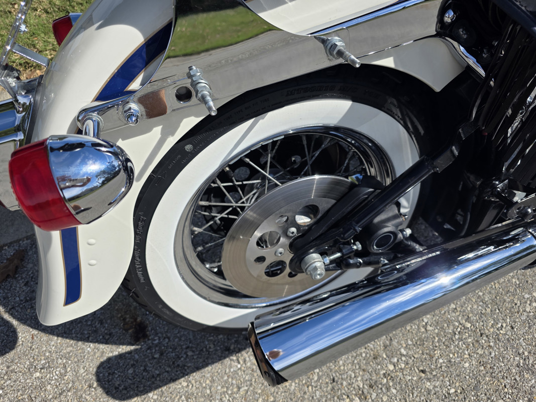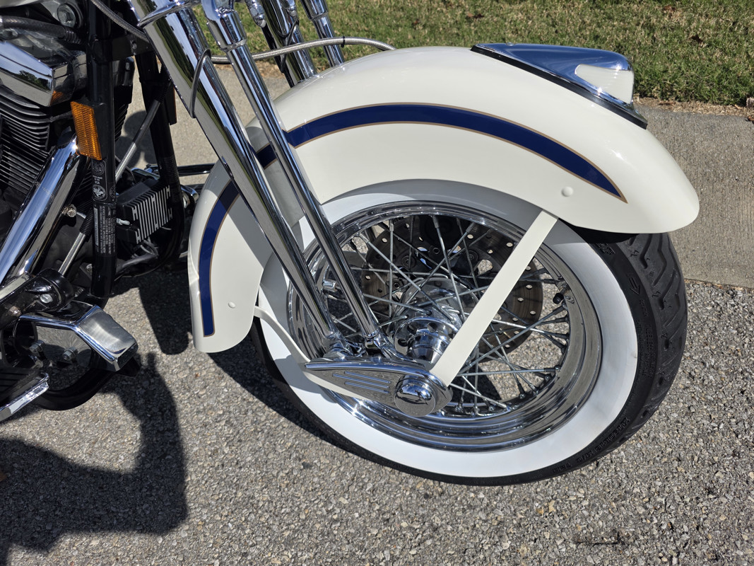 OMG!!! Look at this first year Heritage Springer finished off in birch white and blue. Nic named the "Ol Boy" Considered by many to be the most beautiful springer produced by the Motor Company. Best running EVO I've ever owned. Equipped with quick remove windshield, sissy bar, 12 inch Chubbys, chrome switch housings, extended controls and more. Also has extra Mustang low profile seat for solo or 2 up riding. Performance upgrades include Andrews EV27 cam, Mikuni 42mm carb and more. This bike looks and runs like new