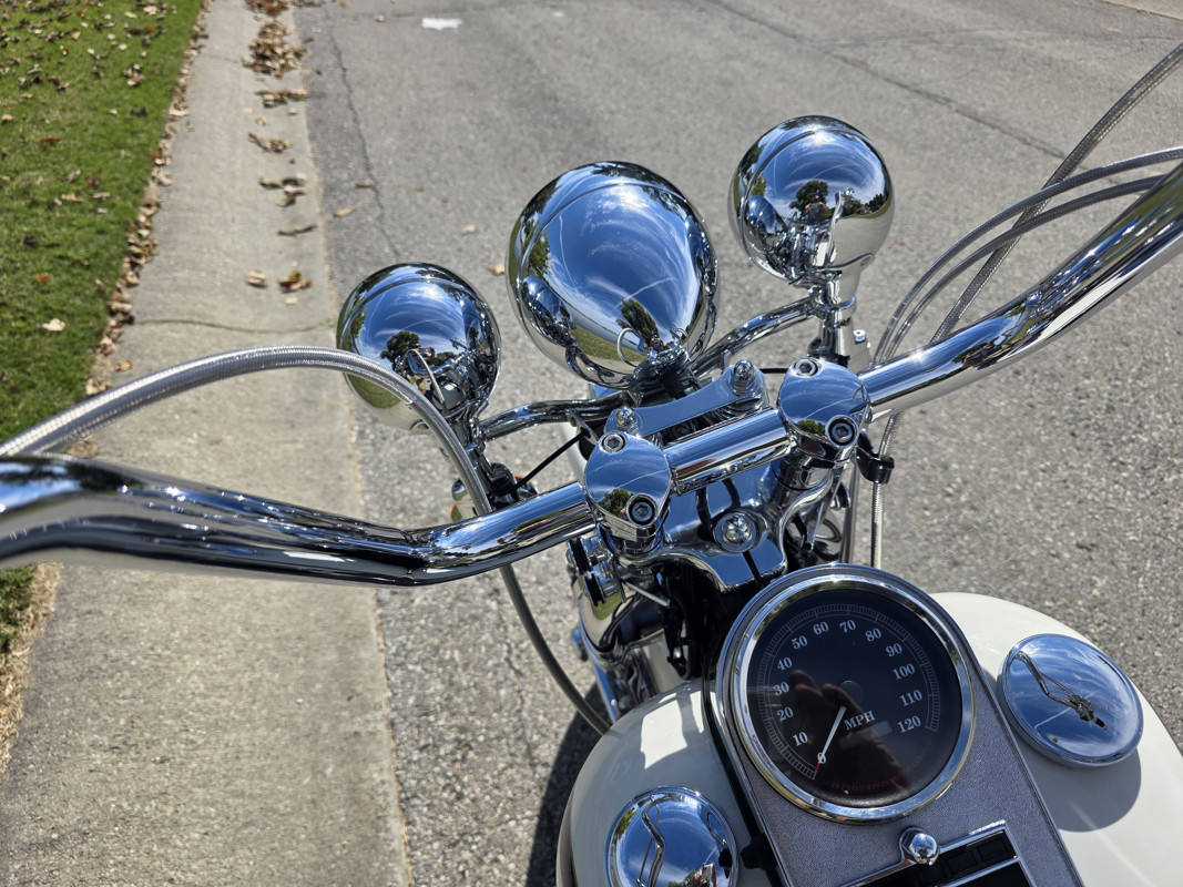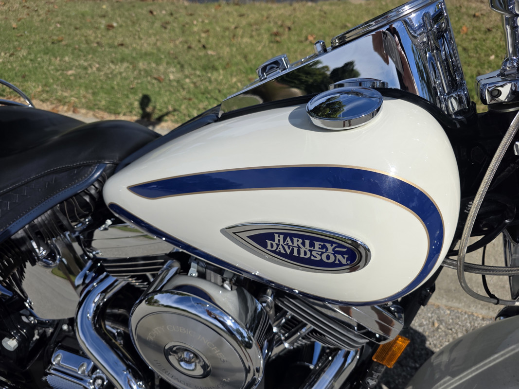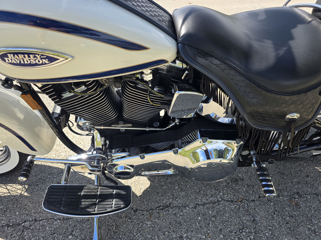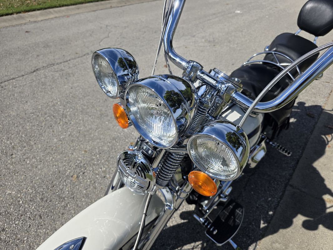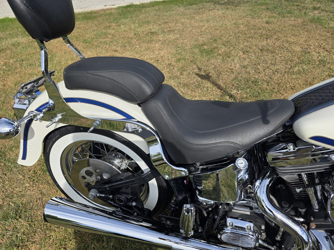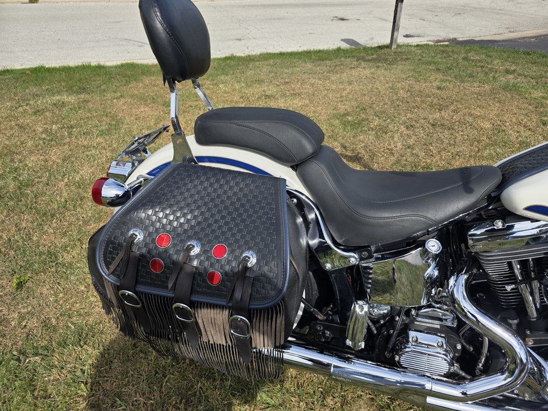 OMG!!! Look at this first year Heritage Springer finished off in birch white and blue. Nic named the "Ol Boy" Considered by many to be the most beautiful springer produced by the Motor Company. Best running EVO I've ever owned. Equipped with quick remove windshield, sissy bar, 12 inch Chubbys, chrome switch housings, extended controls and more. Also has extra Mustang low profile seat for solo or 2 up riding. Performance upgrades include Andrews EV27 cam, Mikuni 42mm carb and more. This bike looks and runs like new