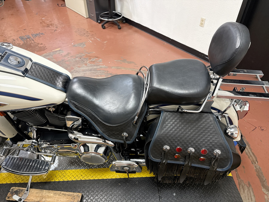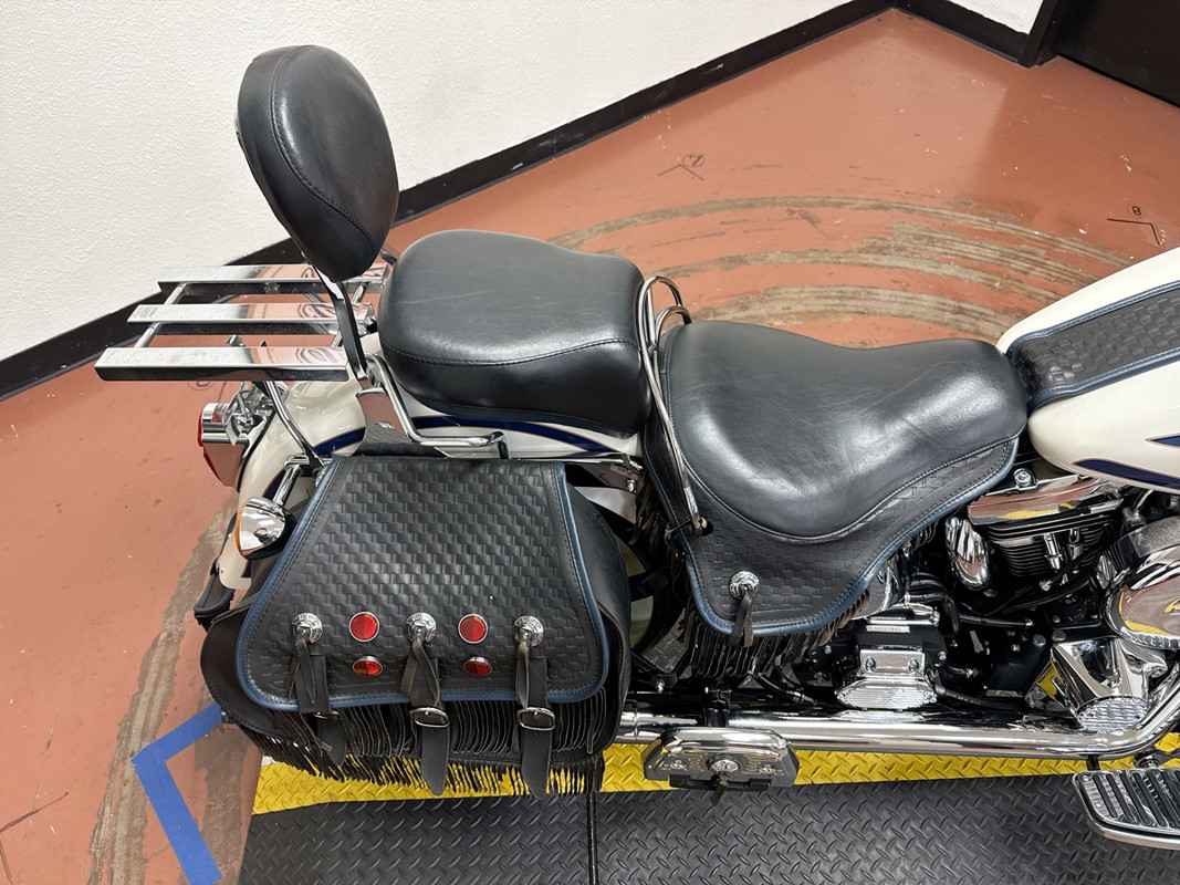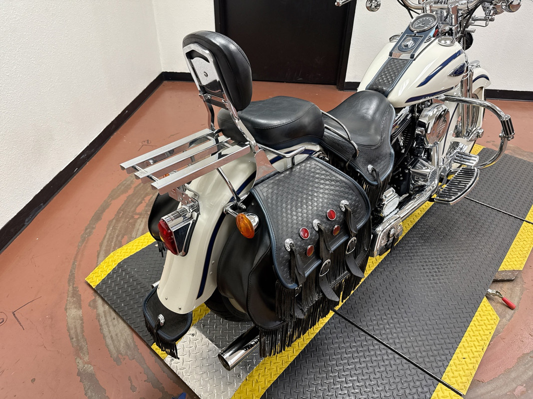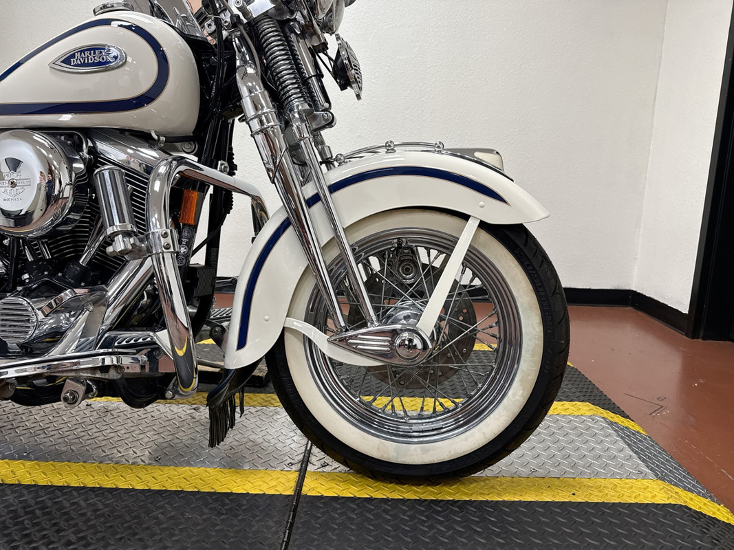 Crafted with attention to detail, this Harley-Davidson Heritage Springer features a powerful two-cylinder engine, providing an exhilarating and smooth riding experience. The distinctive **WHITE/BLUE** color scheme enhances its striking vintage look while it cruises down the highway.