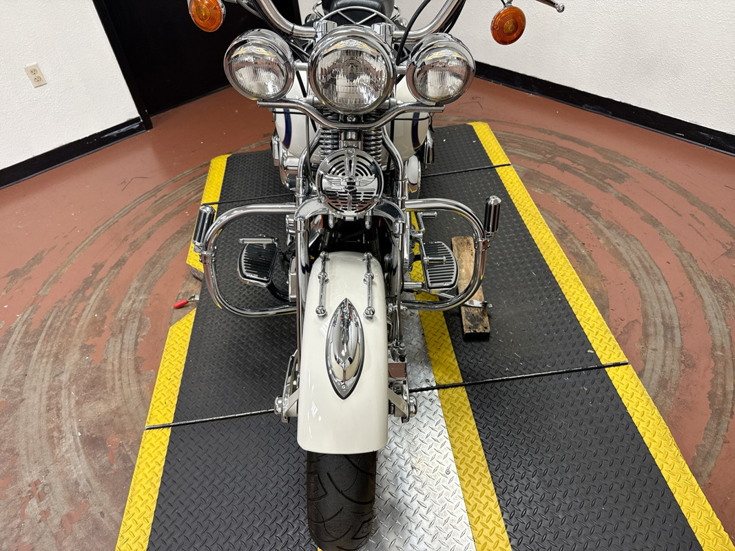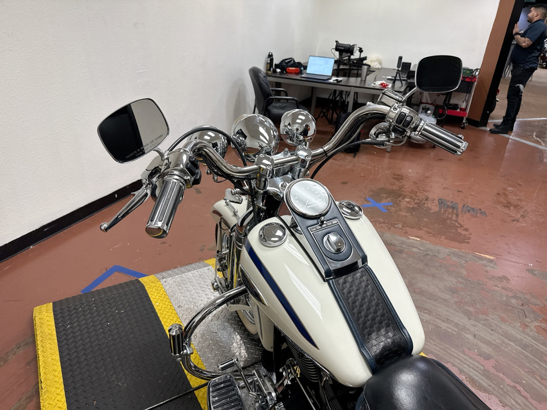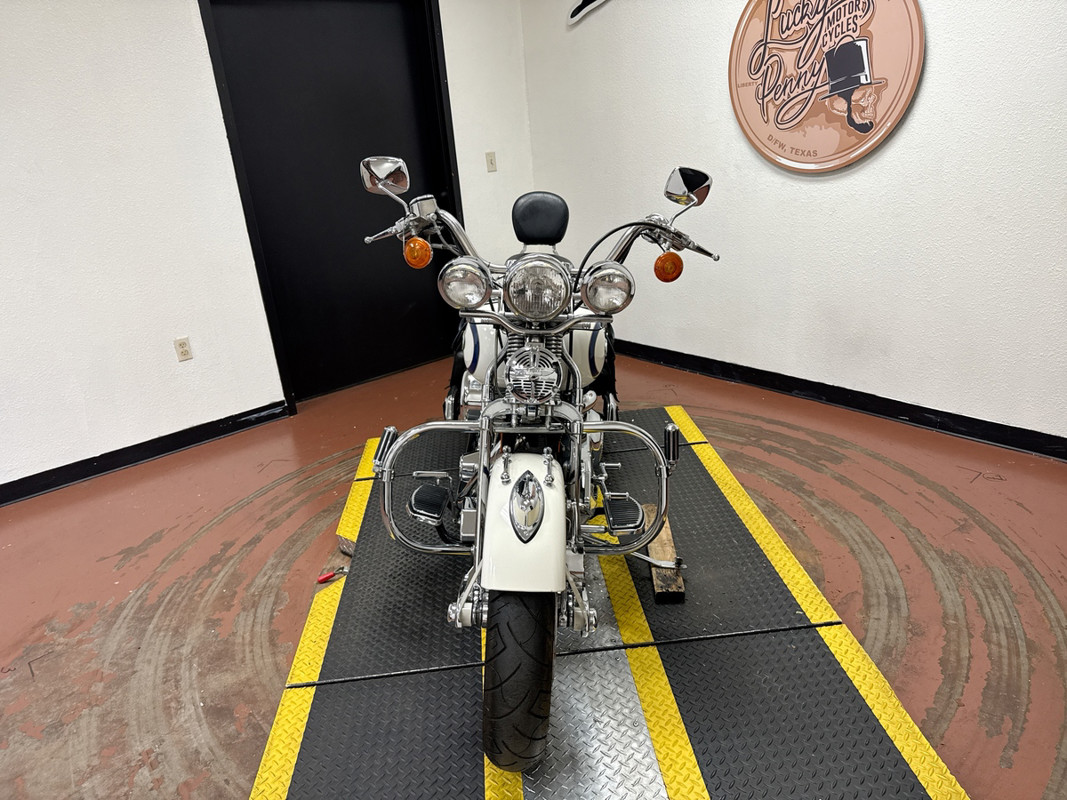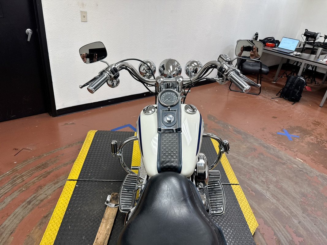 Crafted with attention to detail, this Harley-Davidson Heritage Springer features a powerful two-cylinder engine, providing an exhilarating and smooth riding experience. The distinctive **WHITE/BLUE** color scheme enhances its striking vintage look while it cruises down the highway.
