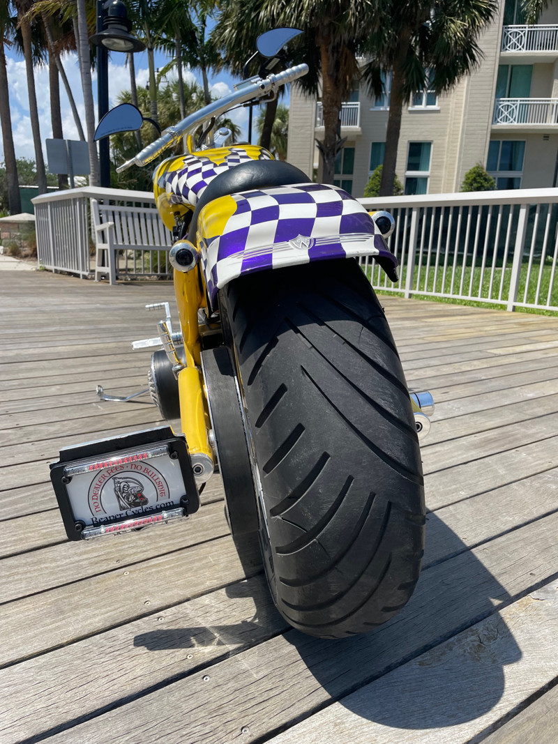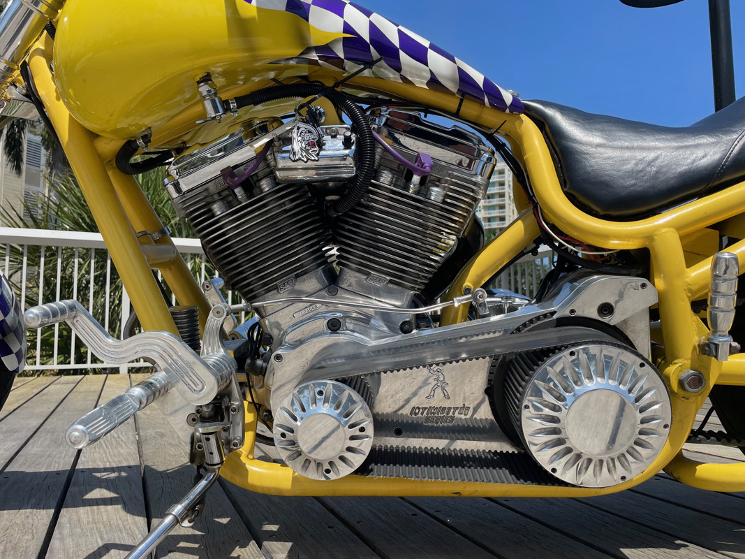 Bourget is the Rolls Royce of the custom motorcycles with low production numbered bikes that were both great to look at as well as amazing engineered. This Low Blow model uses part of the main frame as the oil reservoir giving the entire bike a much cleaner look. Powered with an S&S 113ci motor it is vastly overpowered. It took Harley another 20 years to come out with an equivalent 114ci motor. An amazing machine with good original paint and very few flaws on the paint or frame. 200mm rear end that is driven through a 3in open primary by a 6-speed transmission.