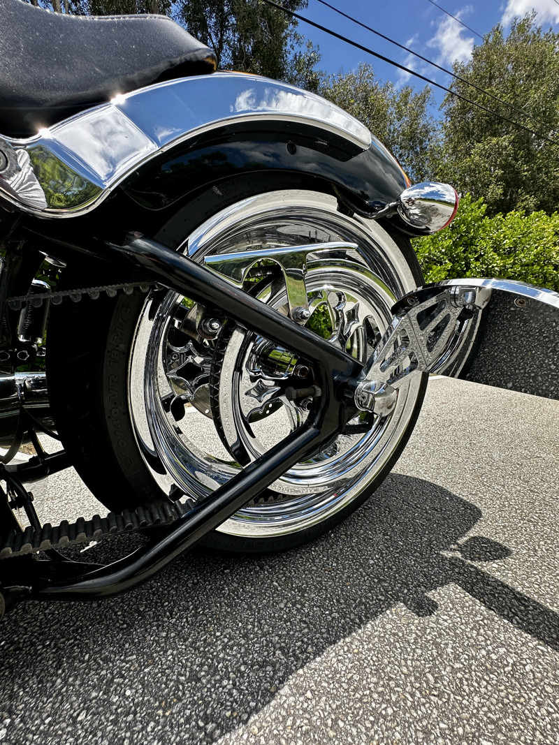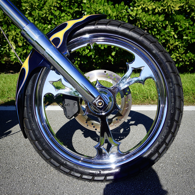 * Billet chrome wheels (front 21X3.25 rear 18X8.5 with a 240 tire) as well as matching billet front and rear brake rotors and matching billet belt drive.