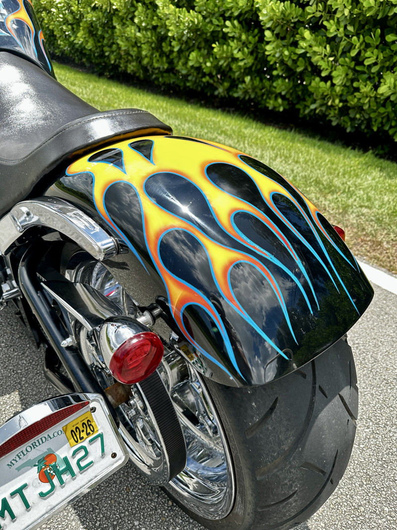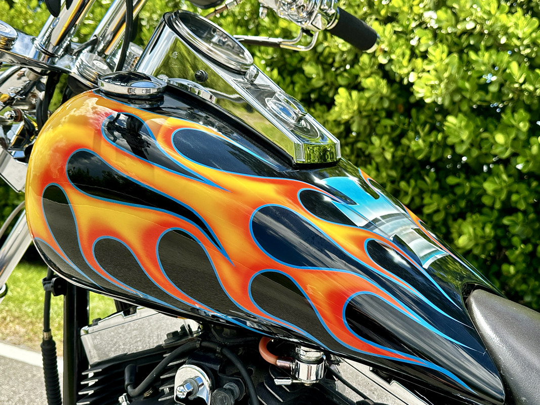 * Custom, one-off flame paint job covering the front fender, gas tank and rear fender