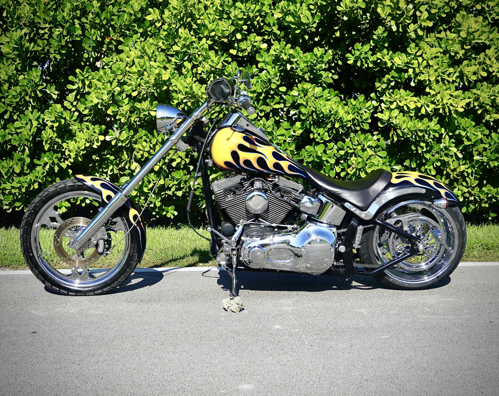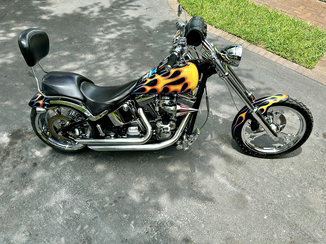 Custom Harley Davidson / Thunder Mountain (Blackhawk 240) softail chopper. 100% Harley Davidson drivetrain, 90% of this bike is OEM Harley Davidson. The chopper has a carbureted Twin Cam 88 that has been built with big bore pistons and Stage 2 cams making it a 96ci with around 100hp! The carb has been jetted to match the build and she absolutely screams! Mated to a Harley Davidson 5spd transmission with an upgraded clutch and Harley brakes on both the front and rear, making this bike super easy to maintain and get part if needed! Here is some of the details of this bike: