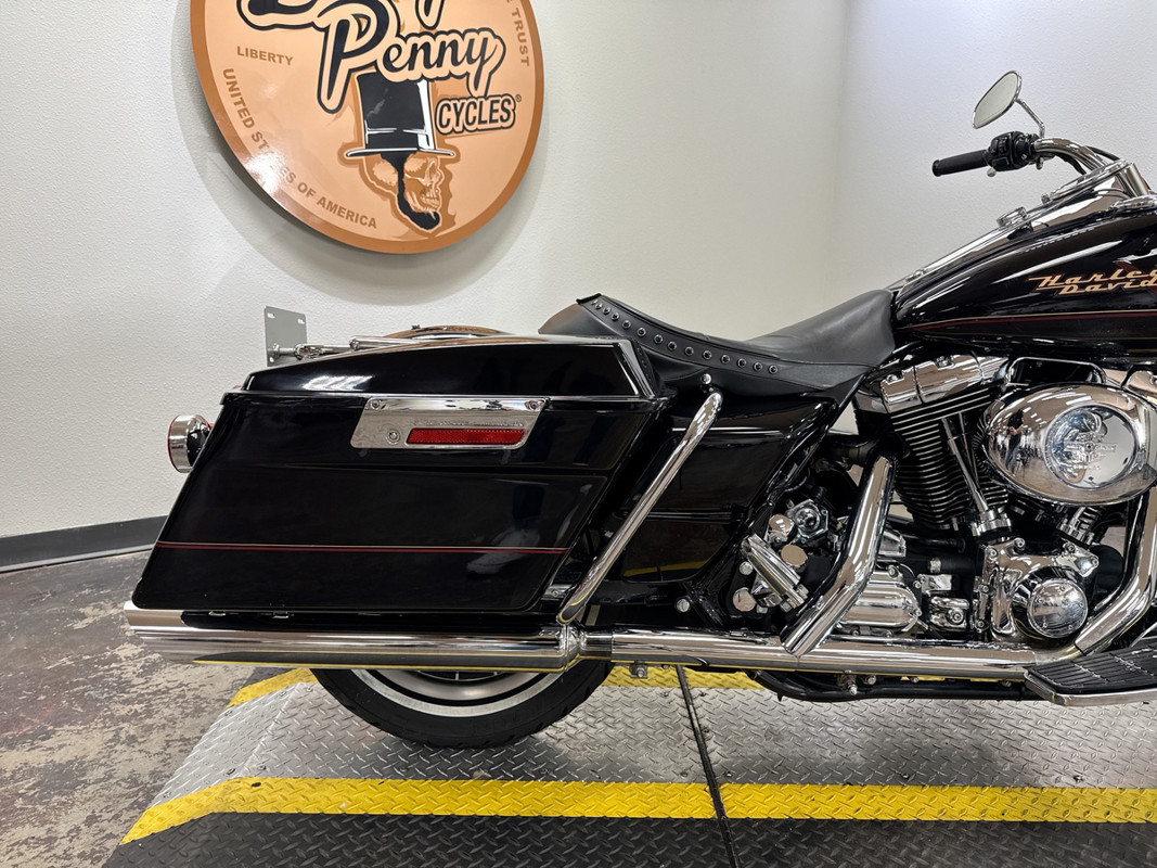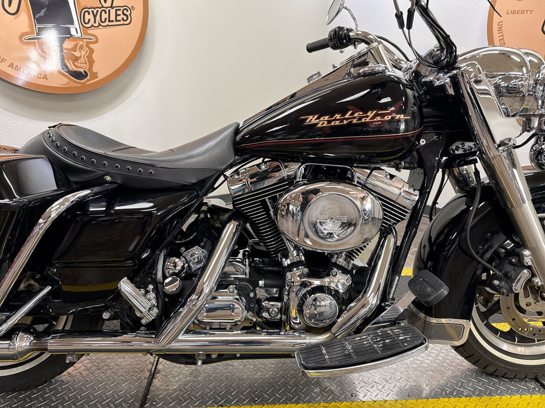 Priced at just $6,995 — this is an affordable way into a true Harley-Davidson bagger. With 49,665 miles, this blacked on chrome boulevard cruiser has clearly been ridden and enjoyed the way a Road King should be. This 2001 Harley-Davidson Road King EFI or FLHRI in Vivid Black with factory pinstripe is powered by the fuel-injected 88ci Twin Cam engine, giving you smoother cold starts and consistent throttle response compared to the earlier carb models.