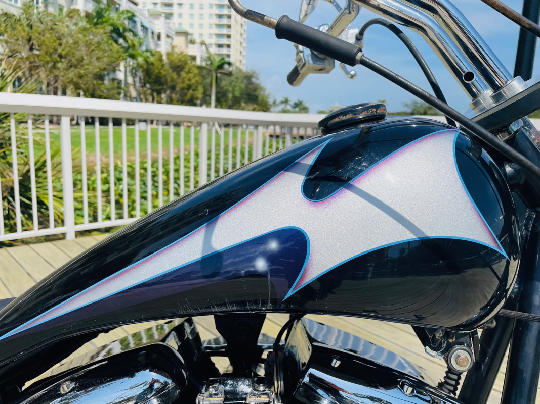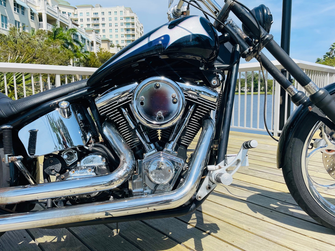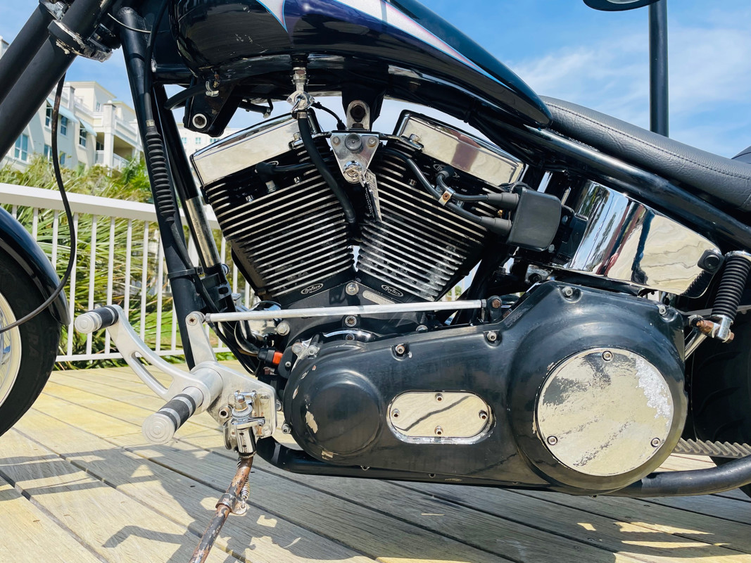 A Rev-Tech powered custom chopper that, as you can see by the pictures, needs some love and care. A perfect project or turn this into a “Rat Chopper”, old-school style. The bike runs excellent now. So mechanically there is nothing to be done. It is a fully functioning bike that was brought back to life after sitting for several years. We re-lined the tank, did a full carb rebuilt and got this bike back on the road. Now either go all the way in the “rat” department or start making things pretty again. See the walk around video on our website that shows the condition in detail.