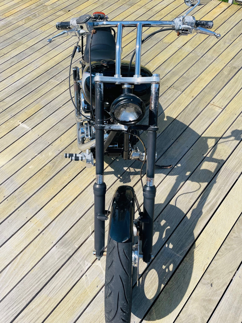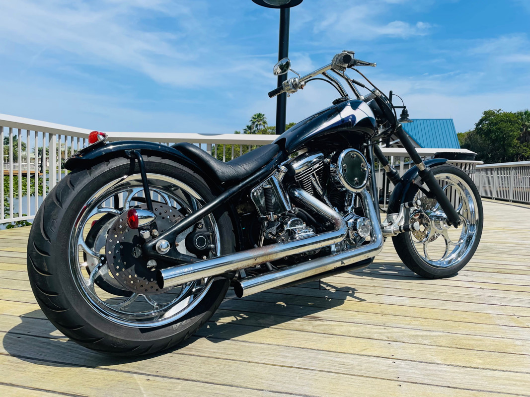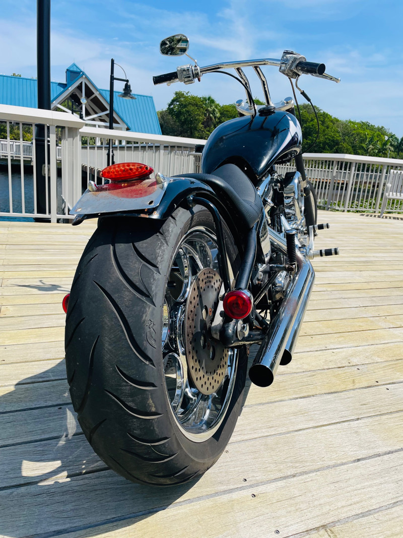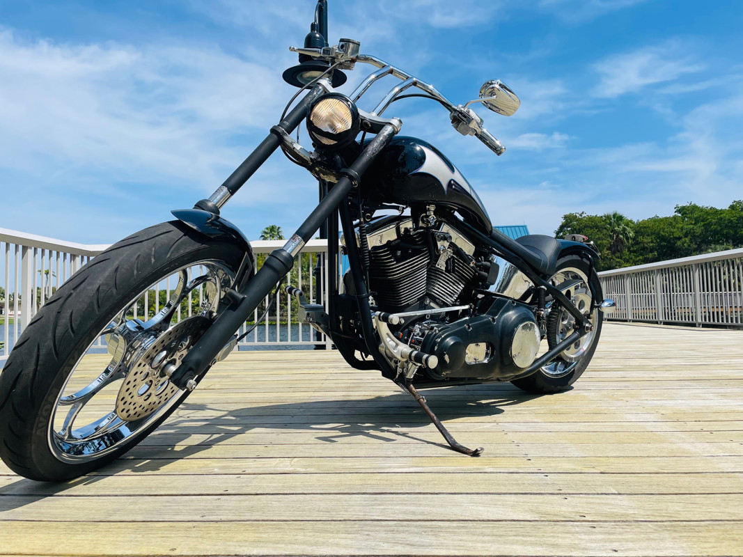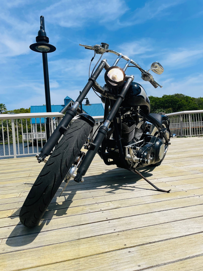 Surprisingly this bike is a very easy handling ride and despite being a hardtail chopper it actually does not rattle your brains out. The 200 rear tire has enough meat to take a good punch instead of your spine. Handles easy over railroad tracks and turns in nicely.
