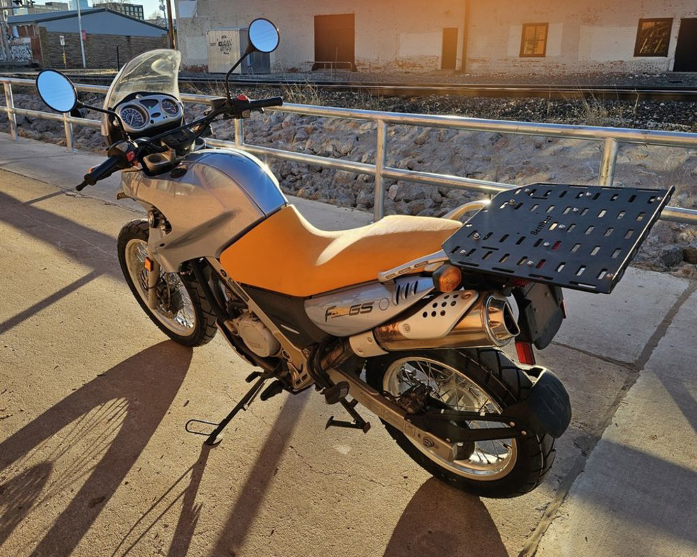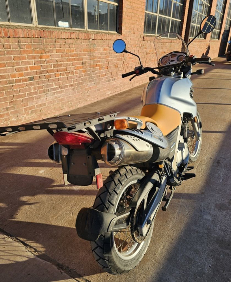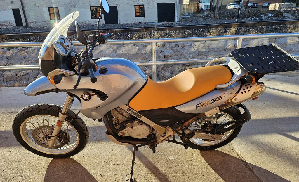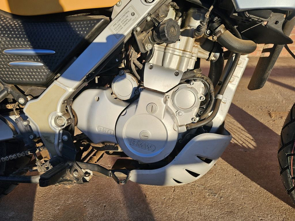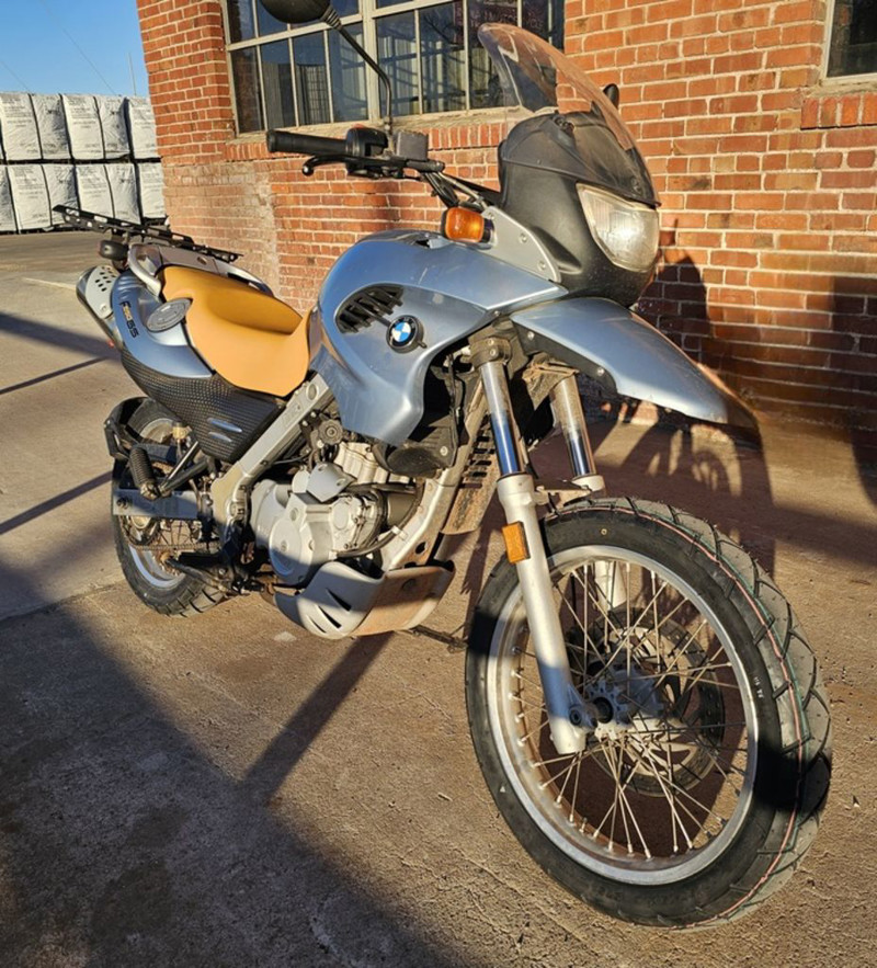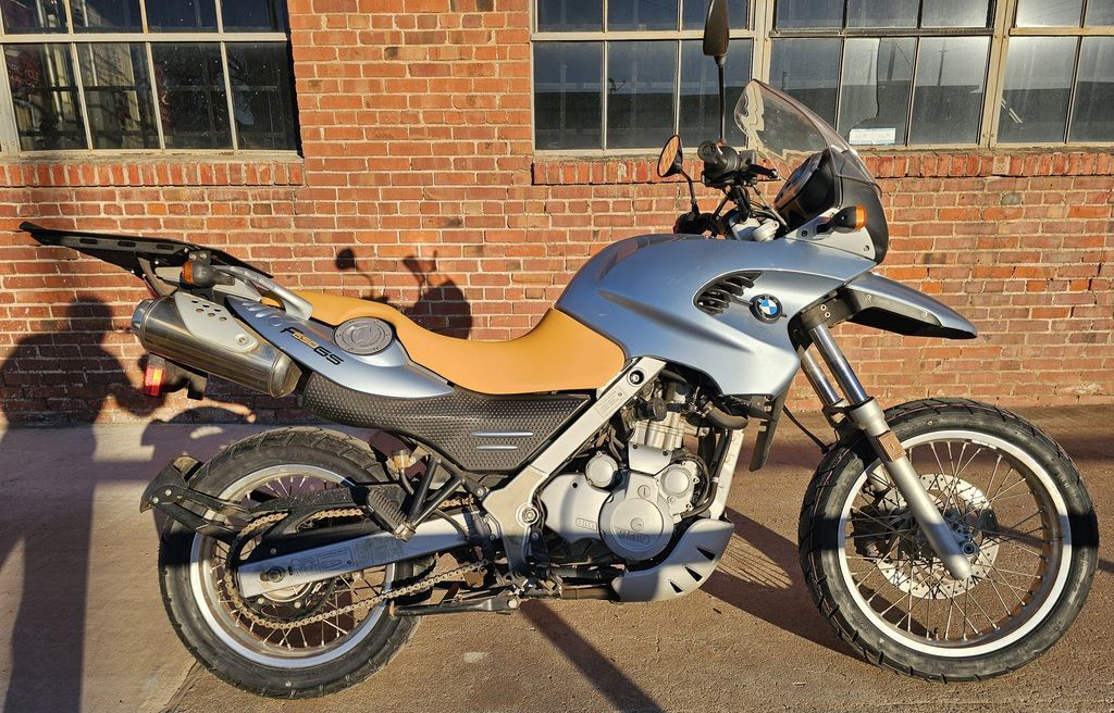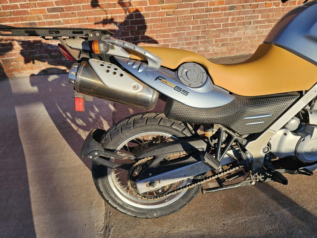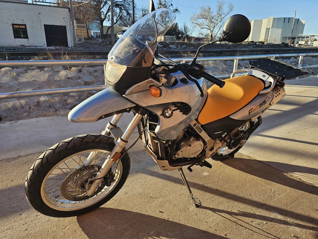 2003 BMW F650 GS. Only 11,032 miles! 652cc Single cylinder 4 stroke engine with 5 speed transmission. Engine and transmissionEngine size 652.0 ccm (39.79 cubic inches)Type of engine Single cylinder, four-strokeEffect 50.0 HP (36.5 kW)) @ 6500 RPMTorque 59.7 Nm (6.1 kgf-m or 44.0 ft.lbs) @ 5000 RPMChassis, suspension, brakes and wheelsPhysical measures and capacitiesDry weight 193.0 kg (425.5 pounds)Power/weight ratio 0.2591 HP/kgSeat height 780 mm (30.7 inches) If adjustable, lowest setting.Wheelbase 1479 mm (58.2 inches)Fuel capacity 17.30 litres (4.57 US gallons)Reserve fuel capacity 4.50 litres (1.19 US gallons)Other specificationsColor options Black, Red, Orange, Blue