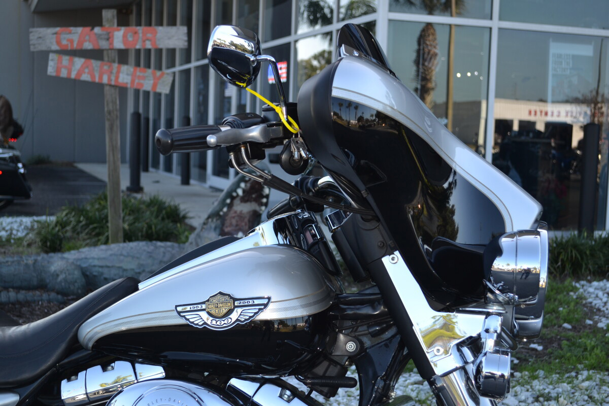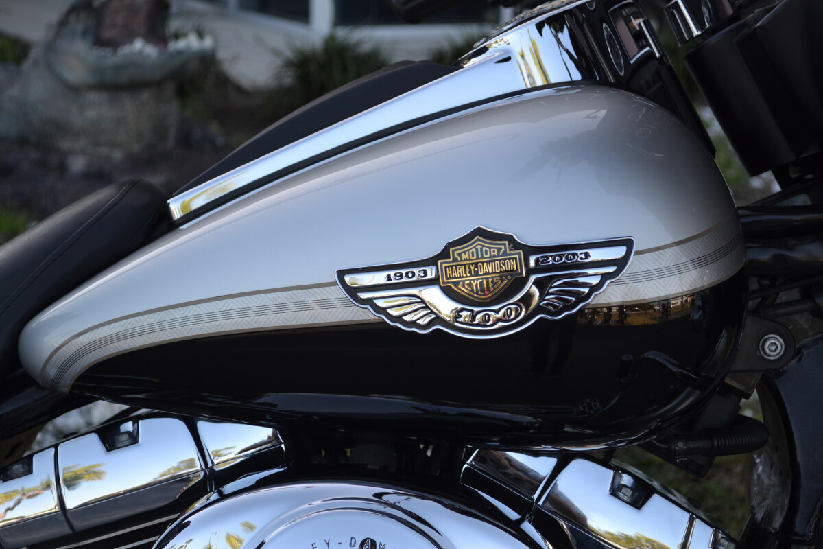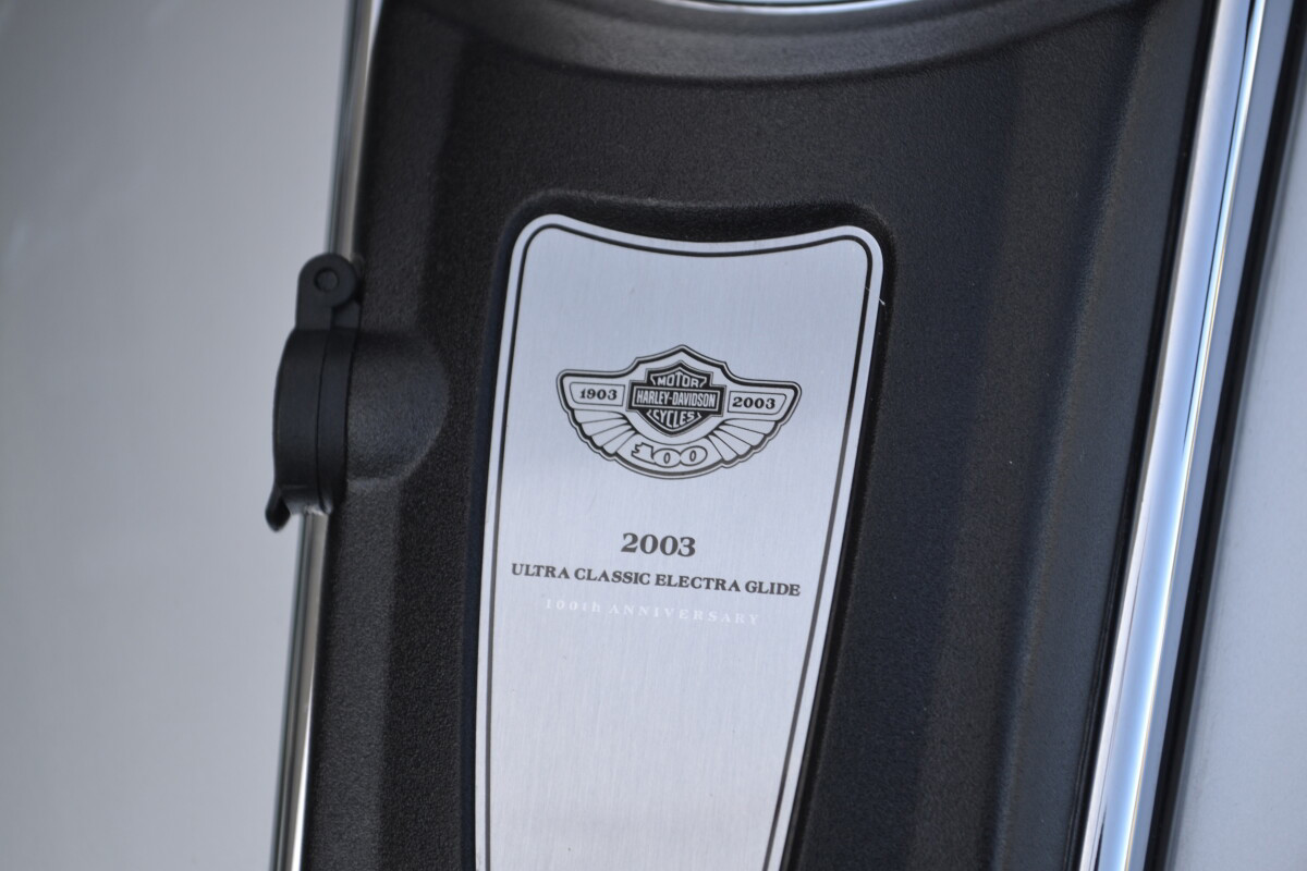 The 2003 Harley-Davidson Electra Glide Ultra Classic 100th Anniversary (FLHTCUI) is a top-tier touring bike, distinguished by special silver/black paint, unique badging, and loaded with premium features like a Twin Cam 88 engine, cruise control, a 4-speaker stereo with CD player, intercom, CB radio, lower fairings with storage, and plush seating for two, representing the peak of luxury touring for Harley's centennial year.