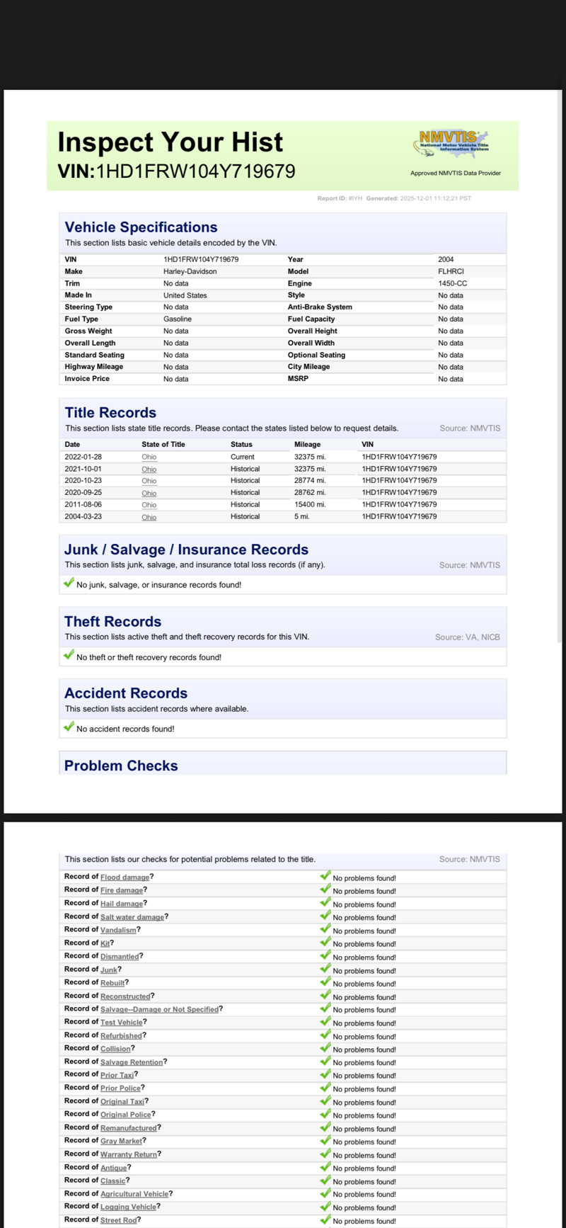 Sell price is payoff. I am the 2nd owner of this, I’ve posted the history report with the pictures. No I will not purchase any other history reports. Only selling due to not ever being able to ride anymore due to time and also I had to move and no longer can store in a garage. There is nothing wrong with this harley