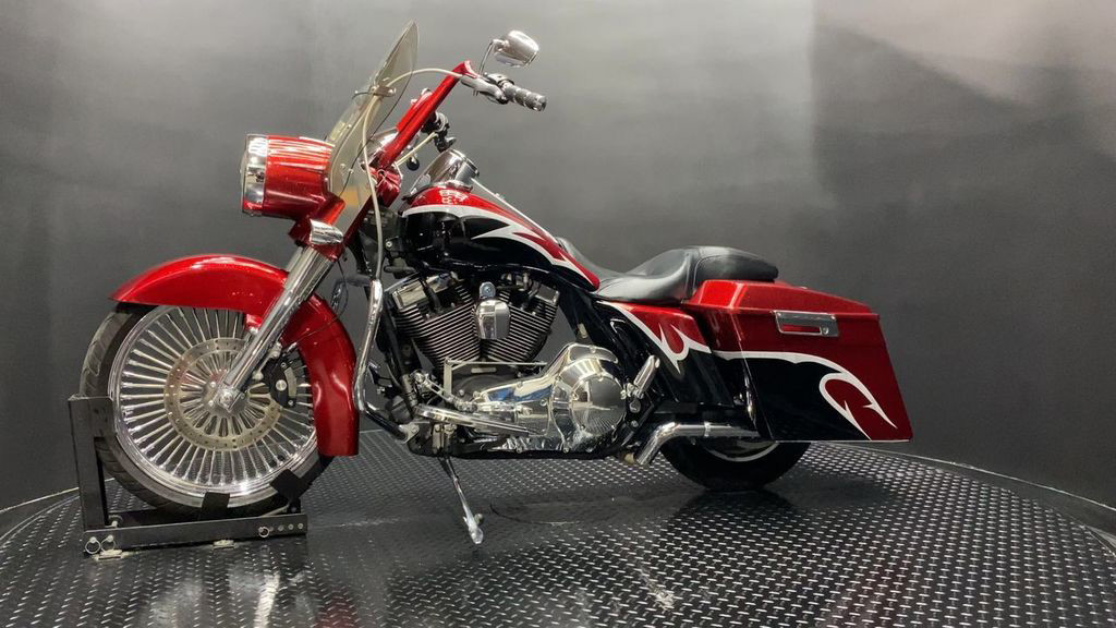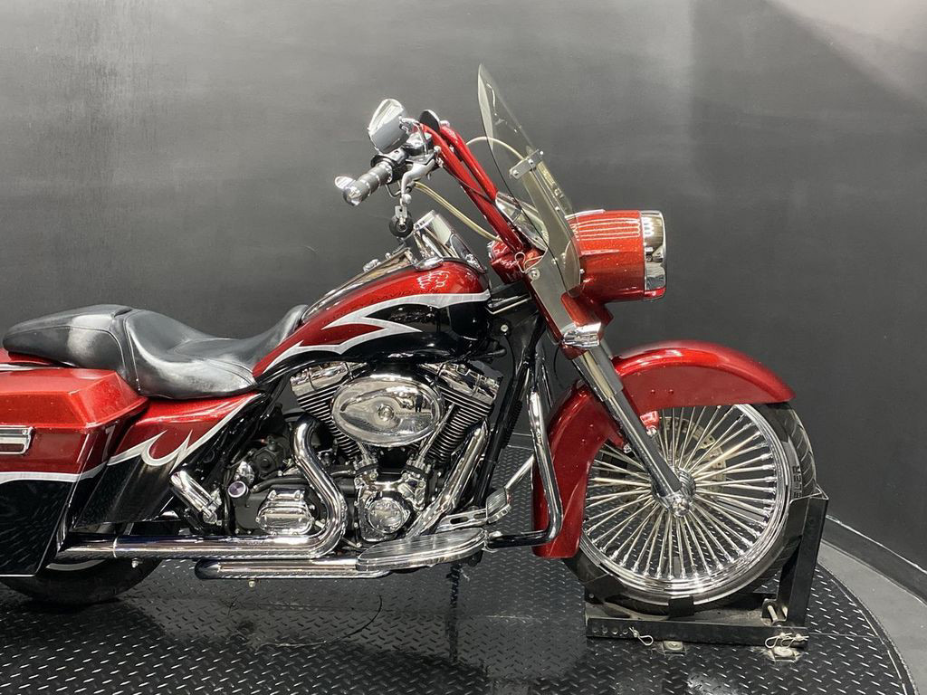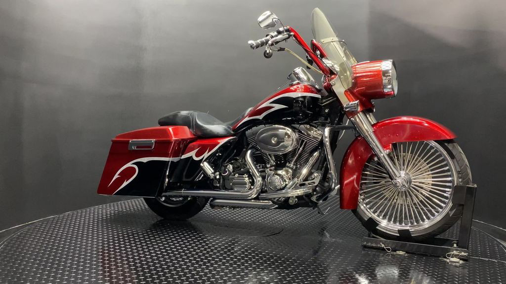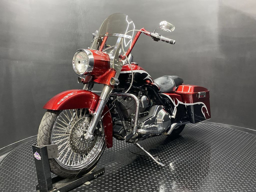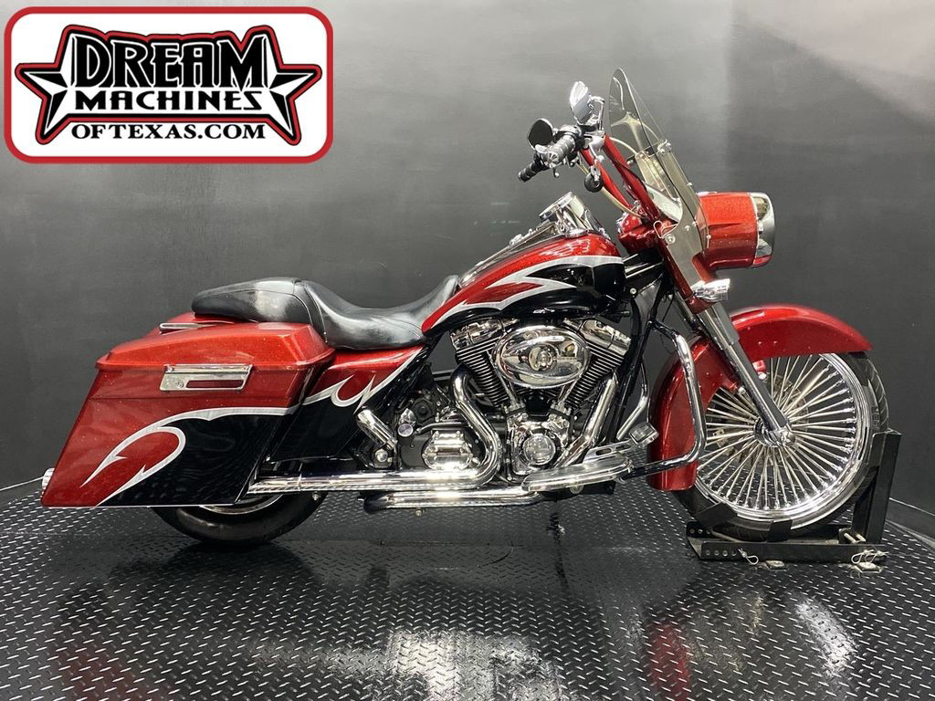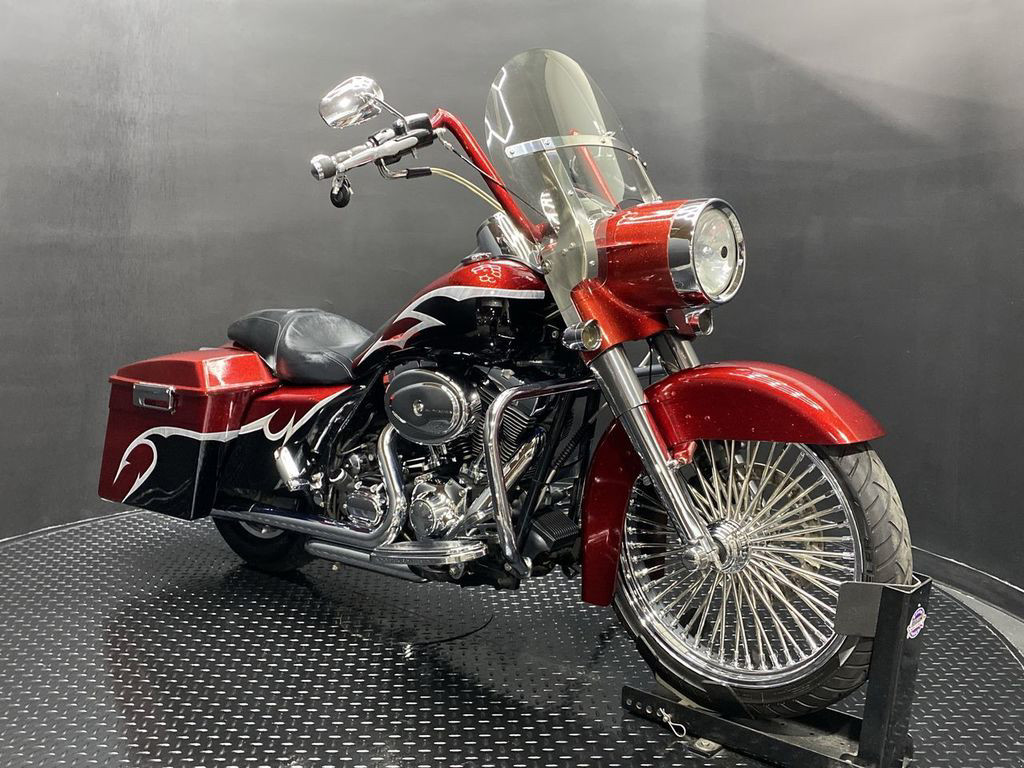 YOU ARE LOOKING AT A 2004 HARLEY DAVIDSON ROAD KING CUSTOM (FLHRSI) WITH 82,272 MILES ON IT. IT IS CUSTOM CANDY RED AND BLACK IN COLOR AND POWERED BY A 1450CC (88") FUEL INJECTED ENGINE AND 5 SPEED TRANSMISSION. THE BIKE COMES WITH 2 KEYS, 1 FOB, AND FACTORY SECURITY SYSTEM. THERE ARE SOME EXTRAS ON THE BIKE WHICH INCLUDE CFR SLIP-ON MUFFLERS ($834.95), DUAL HEADERS ($449.95), STAGE 1 AIR INTAKE ($139.95), STRETCHED REAR FENDER ($357.95), STRETCHED SADDLEBAGS ($693.95), STRETCHED TANK ($519.95), STRETCHED NACELLE ($325.95), STRETCHES SIDE COVER ($218.95), BIG SPOKE FRONT WHEEL ($659.95), FRONT END ($549.95), APE HANGER BARS ($399.95), AND GRIPS ($79.95). THERE ARE NO SCRATCHES, DENTS, OR DINGS THAT I CAN FIND WITH THE EXCEPTION OF TOUCHUPS ON THE REAR FENDER AND SADDLEBAGS. THE CHROME AND ALUMINUM ARE IN GOOD CONDITION WITH THE EXCEPTION OF SCRATCHES ON THE LEFT SADDLEBAG LATCH AND PRIMARY. THE TIRES HAVE GOOD TREAD LEFT ON THEM.