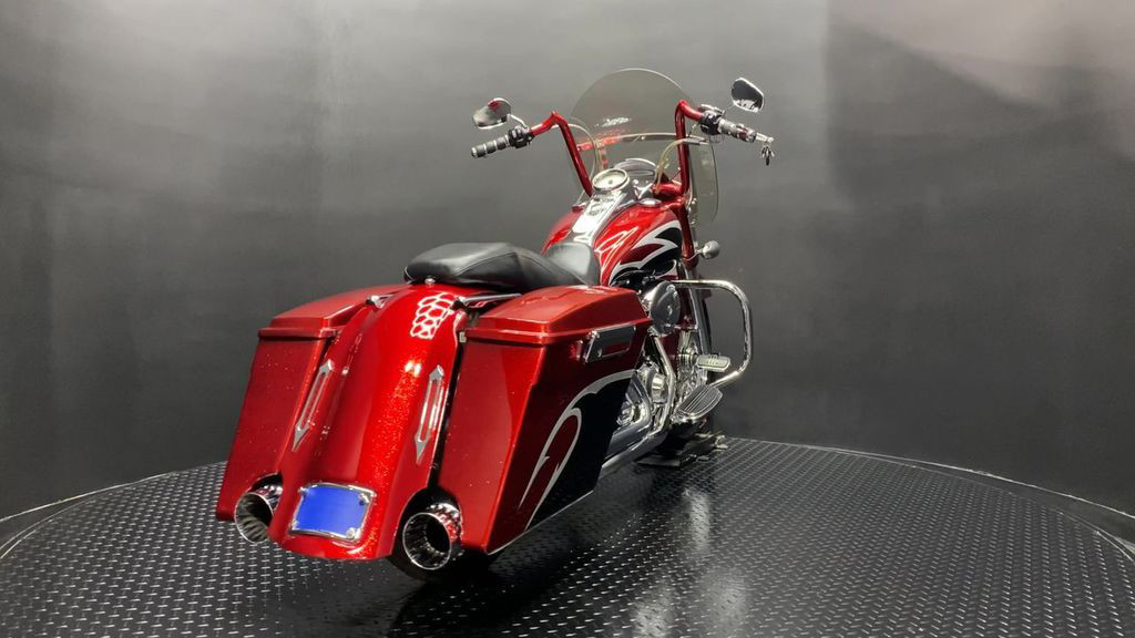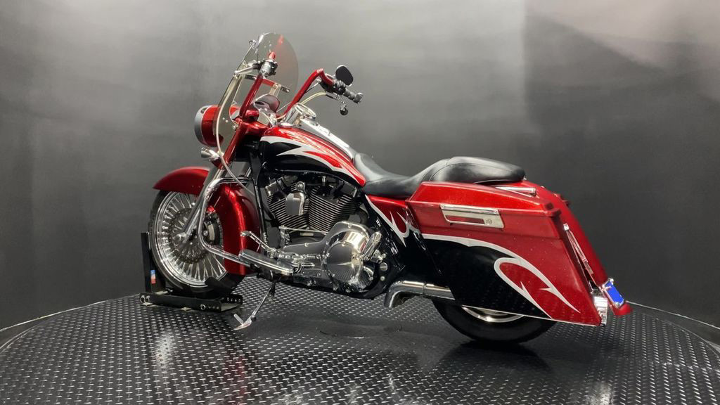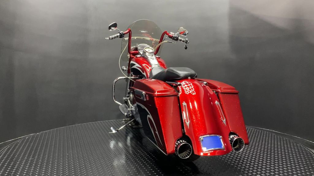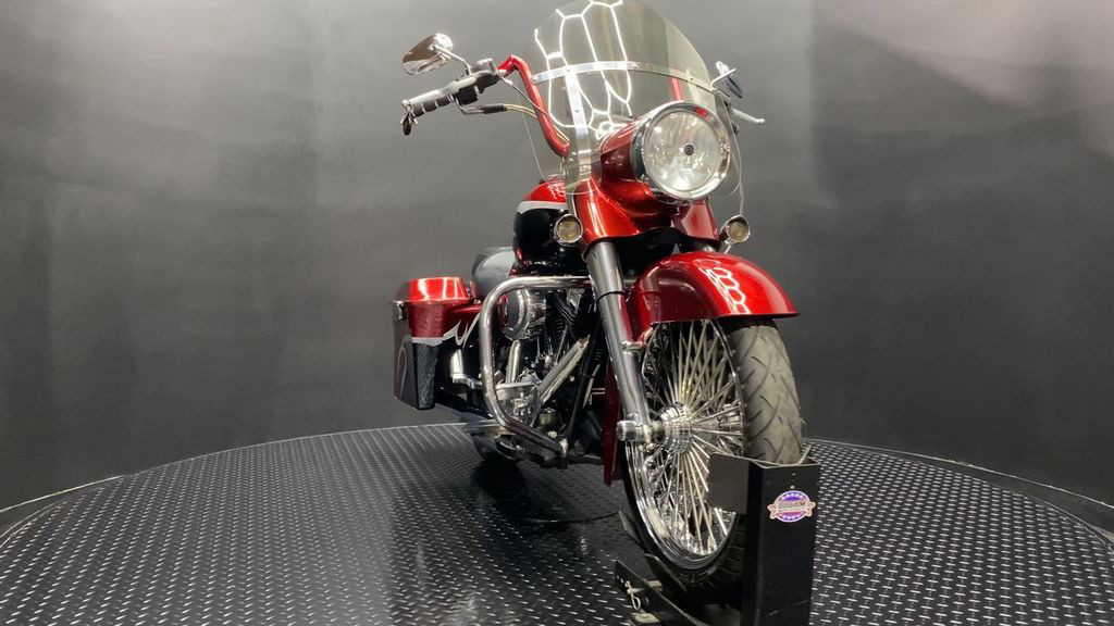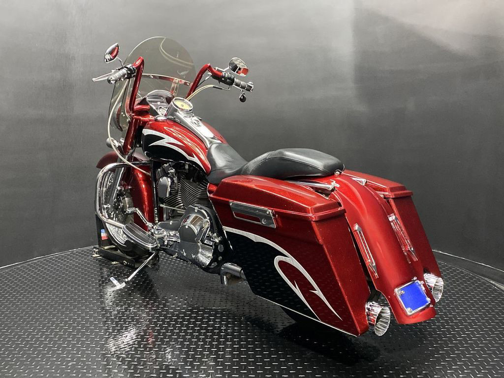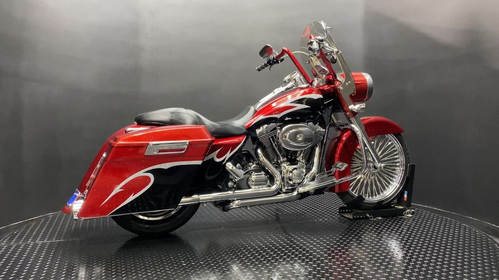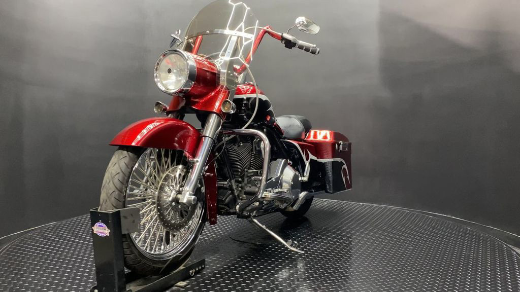 YOU ARE LOOKING AT A 2004 HARLEY DAVIDSON ROAD KING CUSTOM (FLHRSI) WITH 82,272 MILES ON IT. IT IS CUSTOM CANDY RED AND BLACK IN COLOR AND POWERED BY A 1450CC (88") FUEL INJECTED ENGINE AND 5 SPEED TRANSMISSION. THE BIKE COMES WITH 2 KEYS, 1 FOB, AND FACTORY SECURITY SYSTEM. THERE ARE SOME EXTRAS ON THE BIKE WHICH INCLUDE CFR SLIP-ON MUFFLERS ($834.95), DUAL HEADERS ($449.95), STAGE 1 AIR INTAKE ($139.95), STRETCHED REAR FENDER ($357.95), STRETCHED SADDLEBAGS ($693.95), STRETCHED TANK ($519.95), STRETCHED NACELLE ($325.95), STRETCHES SIDE COVER ($218.95), BIG SPOKE FRONT WHEEL ($659.95), FRONT END ($549.95), APE HANGER BARS ($399.95), AND GRIPS ($79.95). THERE ARE NO SCRATCHES, DENTS, OR DINGS THAT I CAN FIND WITH THE EXCEPTION OF TOUCHUPS ON THE REAR FENDER AND SADDLEBAGS. THE CHROME AND ALUMINUM ARE IN GOOD CONDITION WITH THE EXCEPTION OF SCRATCHES ON THE LEFT SADDLEBAG LATCH AND PRIMARY. THE TIRES HAVE GOOD TREAD LEFT ON THEM.