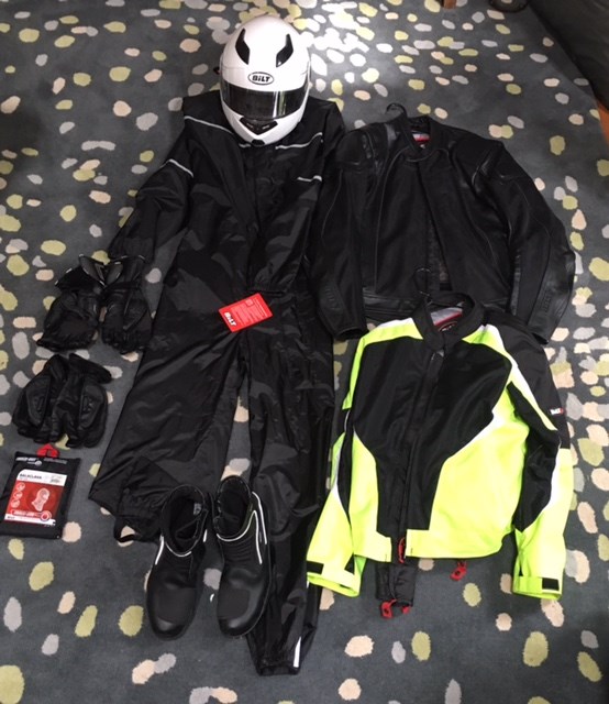 Helmet, size 12 motorcycle boots, 2 sets of leather gloves,