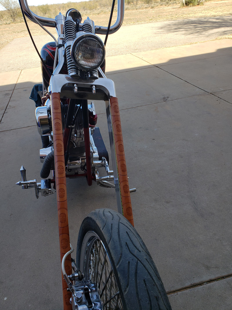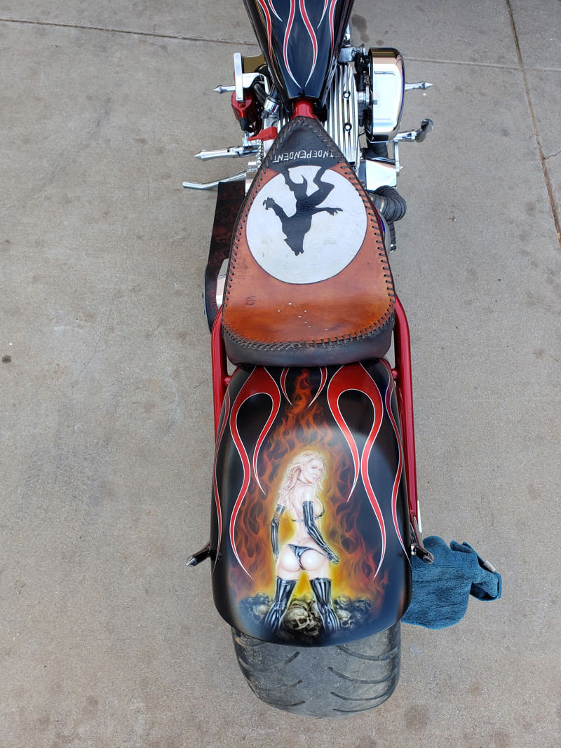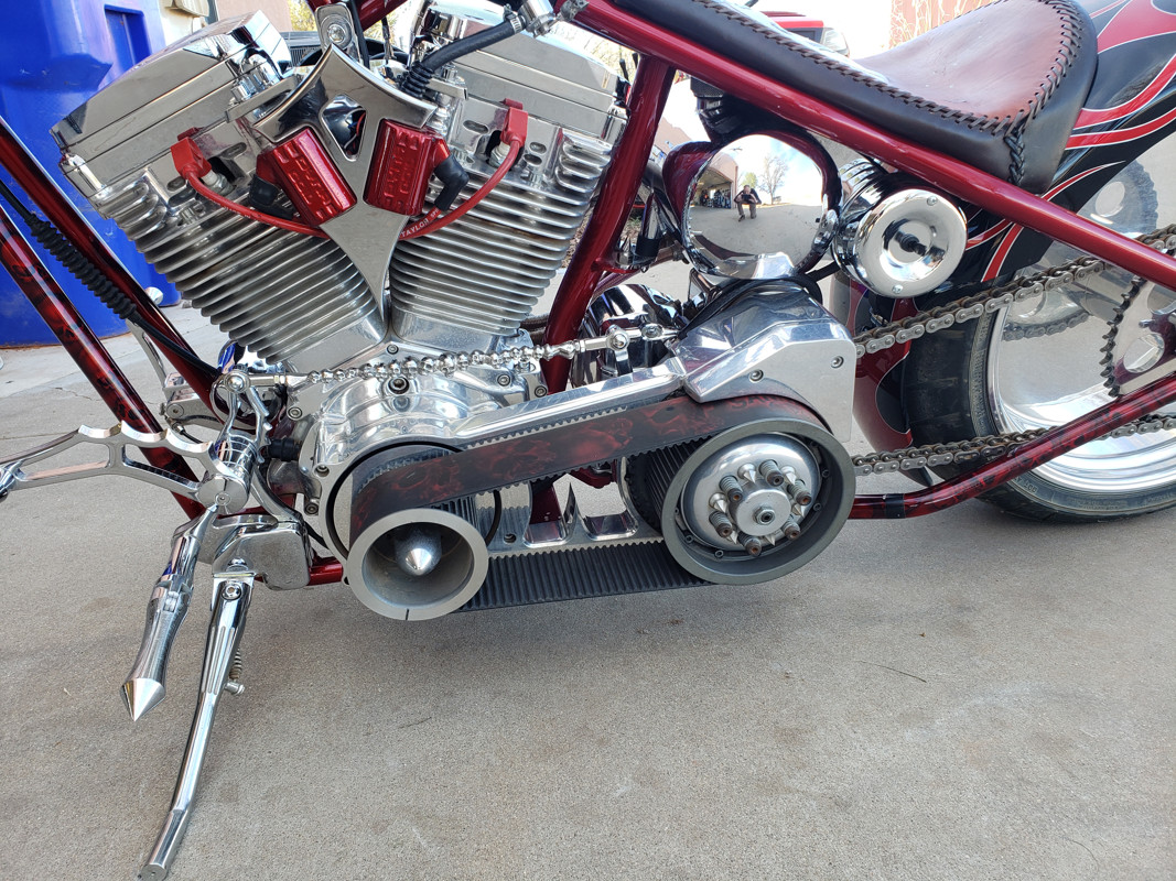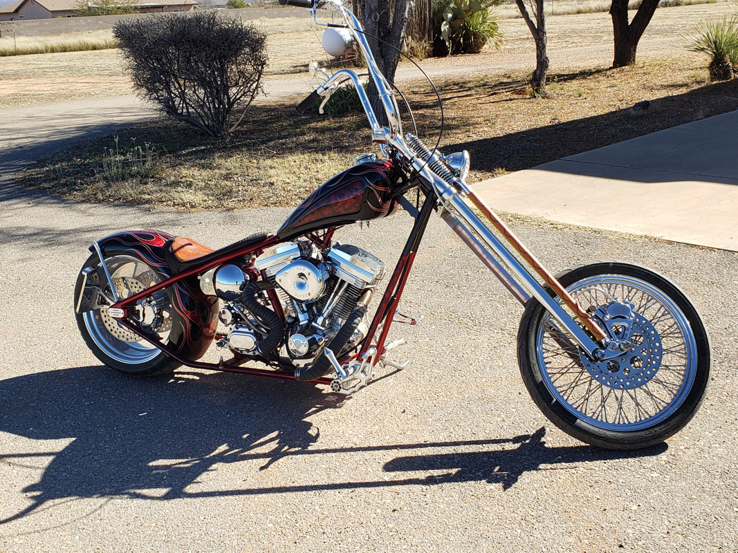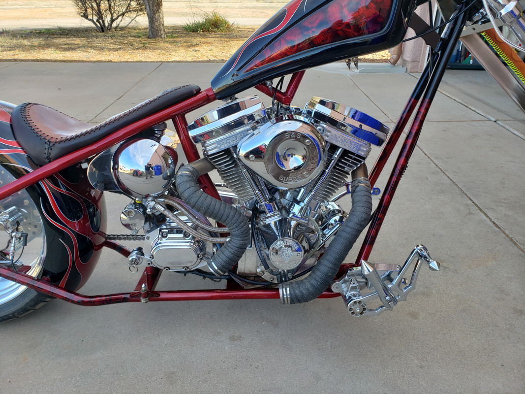 2006 custom chopper by Sanitarium Cycles in California. Skull theme throughout the bike. Amazing paint on gas tank and rear fender. Overall length is just over 9 feet. 96 cu in Ultima engine, 6-speed tranny and 3" open belt primary. Simple, clean old-school style hardtail. I installed a new S&S carb and intake since these photos.