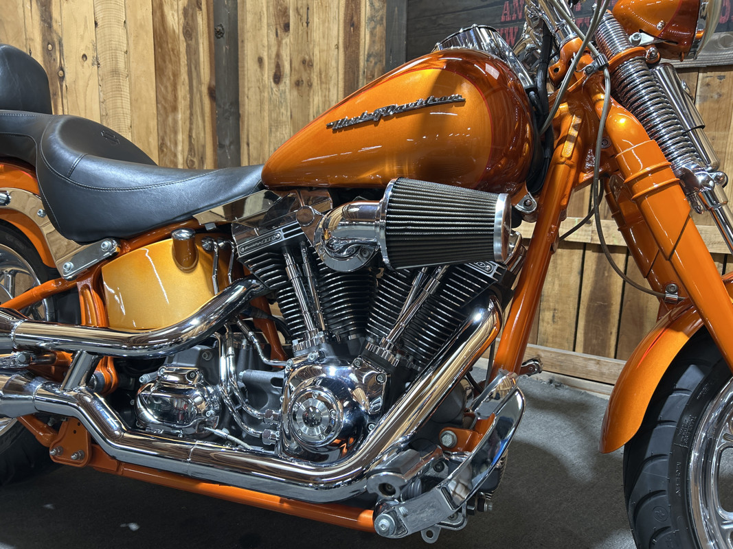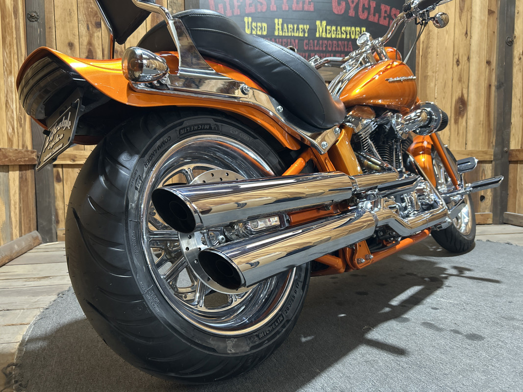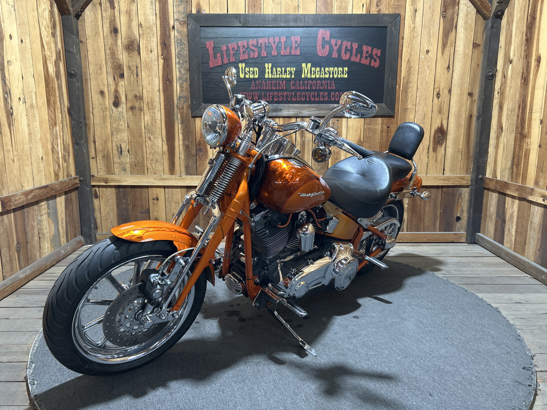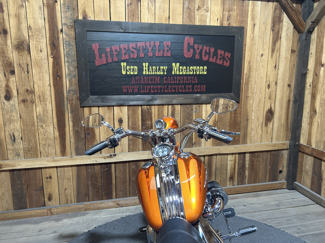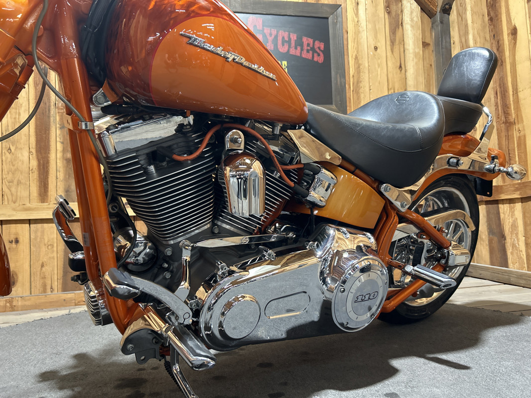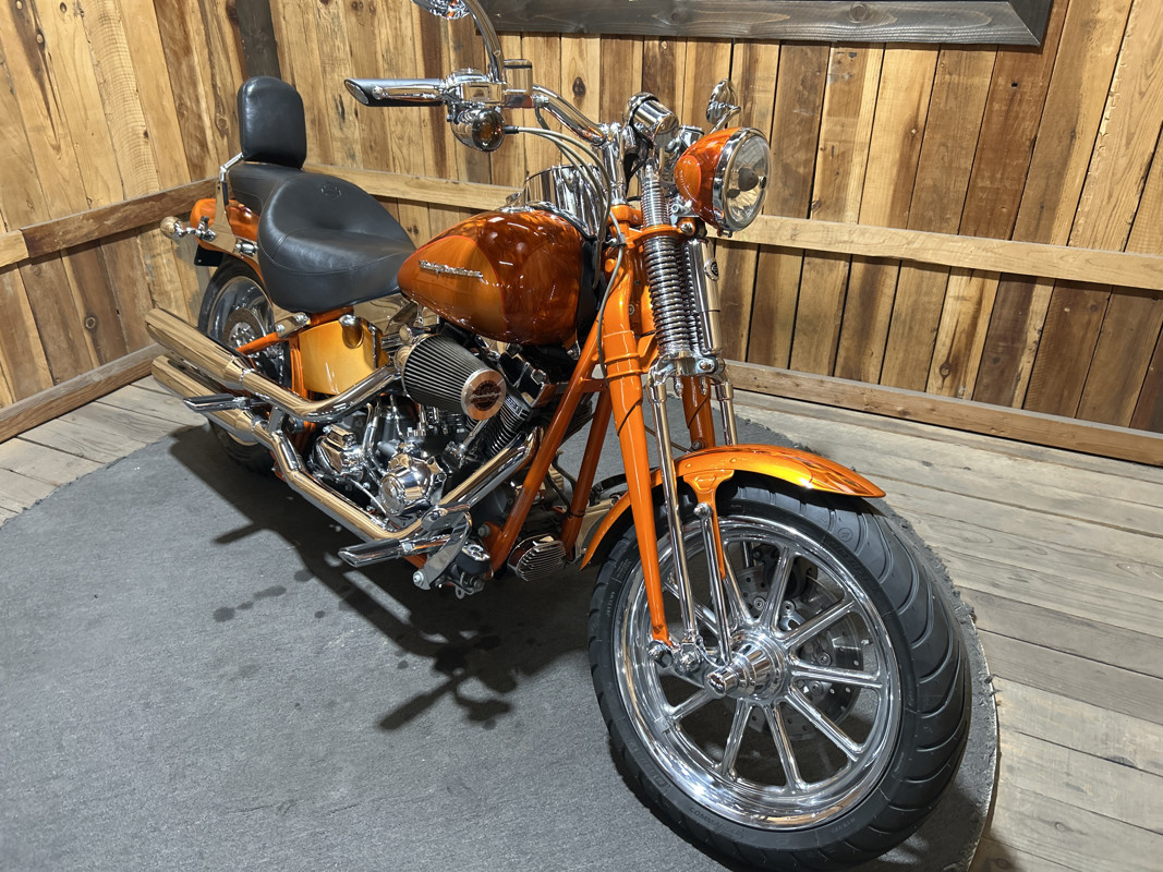 * Harley OEM Inferno Orange Paintjob * Two-Up Harley Seat * Chrome Sissy Bar Backrest * Screamin Eagle 110 Cubic Inch Harley Twin Cam Motor * Screamin Eagle Heavy Breather Air Cleaner * Forward Controls * Dual Chrome Harley Exhaust with Slash Cut Ends * Hydraulic Clutch