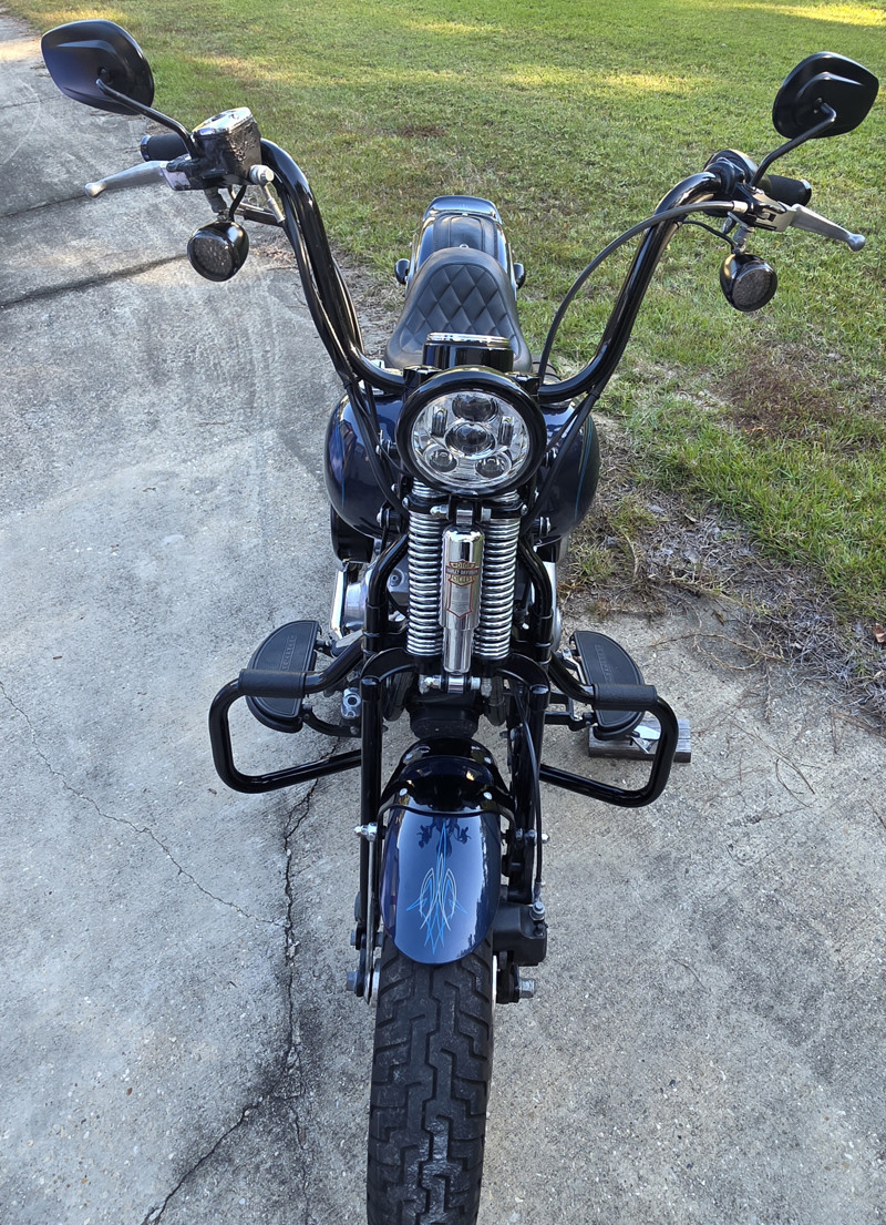 Crossbones with Supertrapp exhaust, SE air, led headlight and t/s, "get-a-grip" grips, Mustang solo seat with fender bib (also OEM spring seat), and solo side swingarm bag.