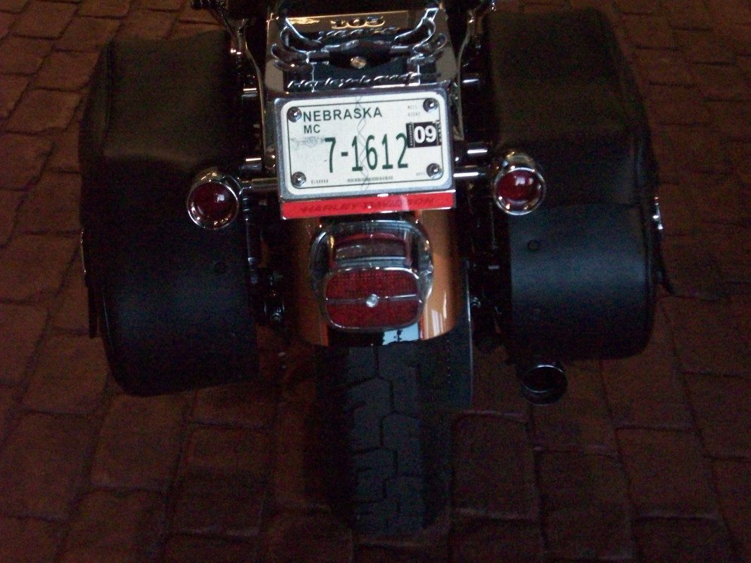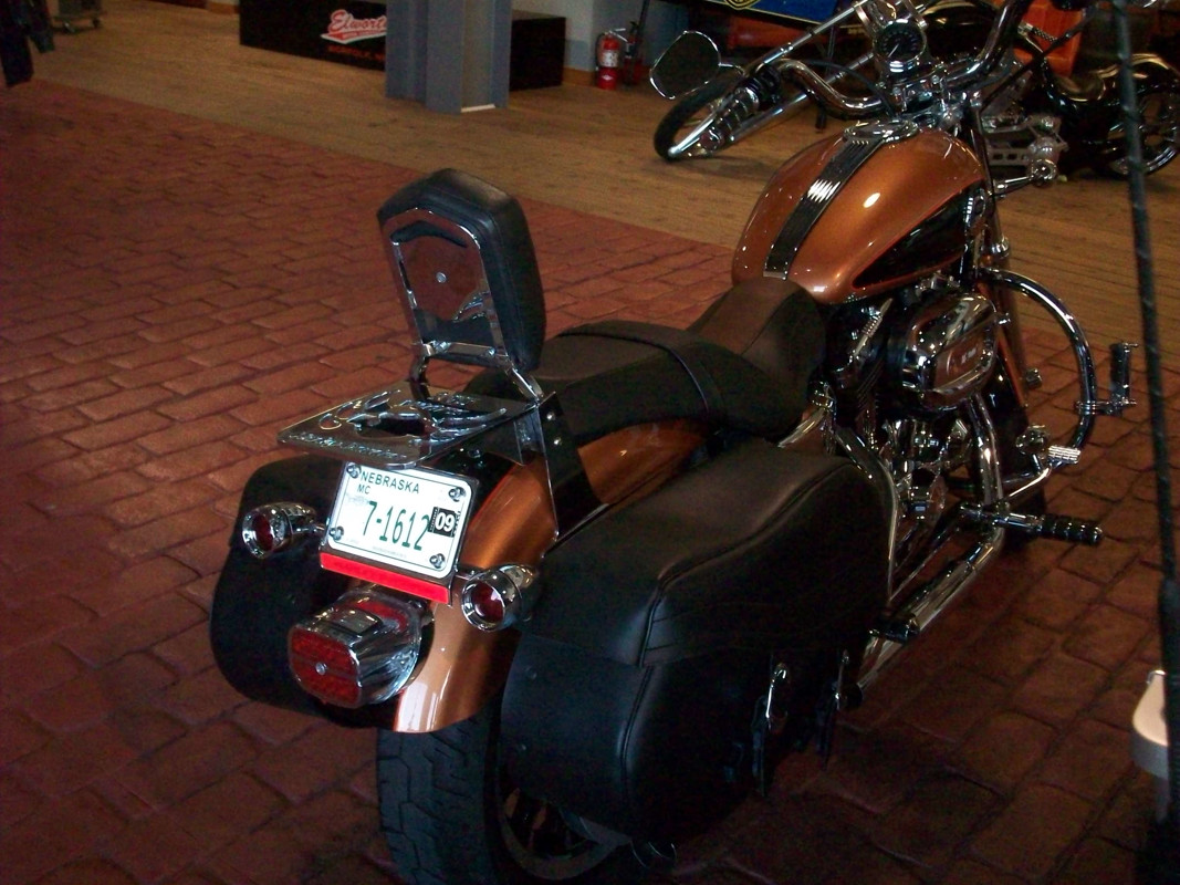 Saddle bags, crash bar in front, additional riding lights added, lay-back license plate mount. Vance & Hines mufflers.