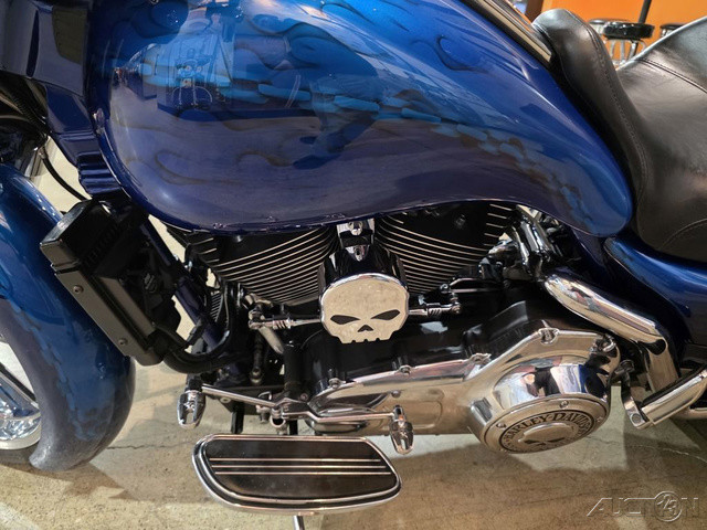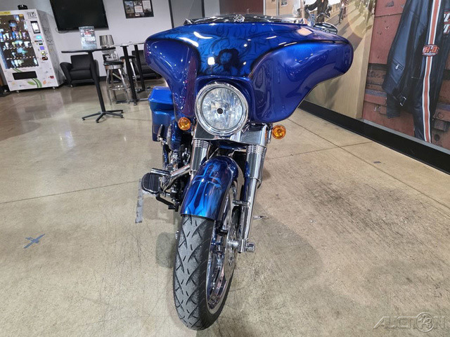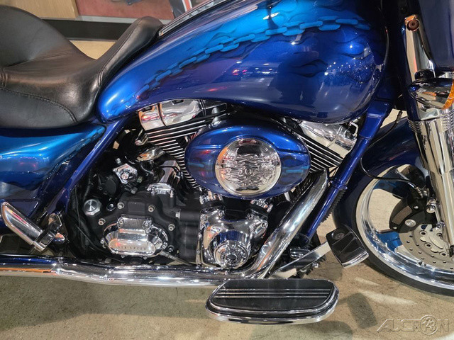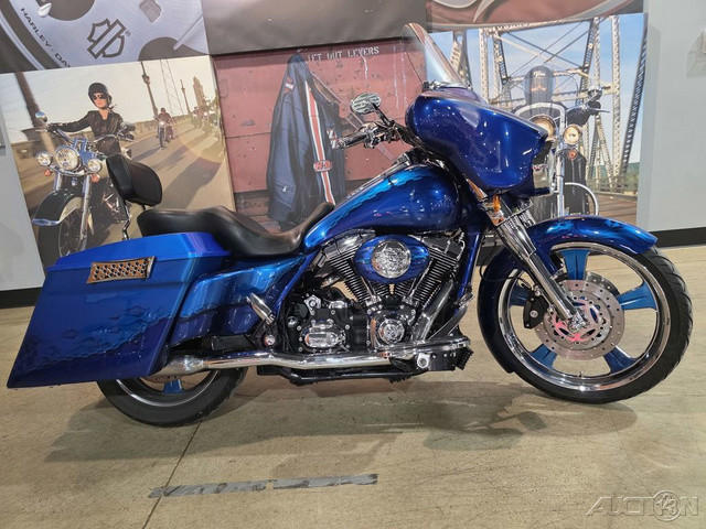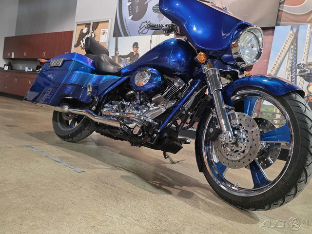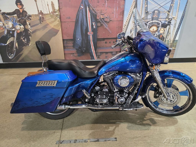 2008 Harley-Davidson® Street Glide®A custom for the long haul, the FLHX Street Glide® offers the comfort and function of a dresser with stripped-down styling. Lowered rear suspension, a smoked mini-wind deflector, and Tri-line LED lighting at the bottom of the rear fender gives the Street Glide® a low, lean profile. A traditional "bat wing" fairing holds a 40-watt Advanced Audio System by Harman/Kardon®, while a new, shorter antenna streamlines the look.