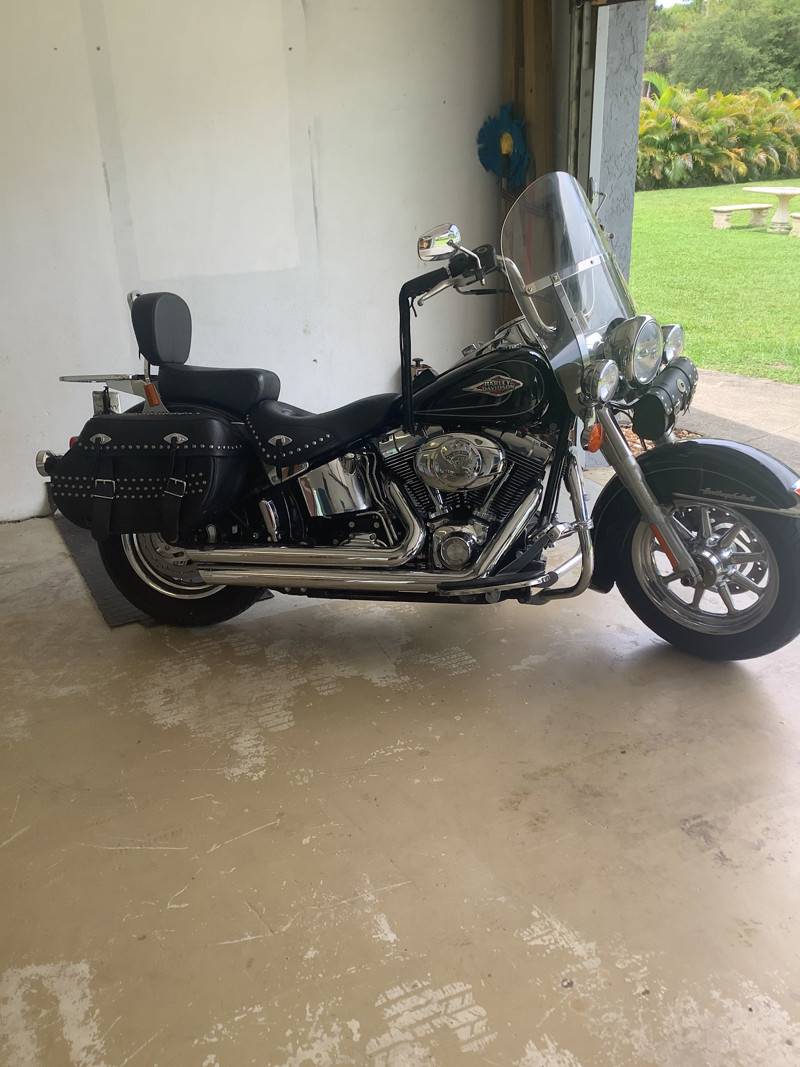 $3,500 in Extras! 2009 HARLEY DAVIDSON HERITAGE CLASSIC SOFTAIL FLSTC, Excellent Condition. Vivid Black and Smoke Silver Pin Striping, Only 15,633 miles. 1584cc Fuel-injected Big Twin 96ci Engine, 6 Speed Cruise Drive Transmission, EFI Electronic Fuel Injection, Optional Vance & Hines Exhaust Pipes, Live to Ride Chrome Air Cover, Screamin Eagle Air Breather, Optional Screamin Eagle Tuner installed with Pipes & Air Cleaner at Palm Beach Harley Davidson, Six Speed Cruise Drive Transmission, Optional Harley Davidson Cast Chrome 9 Spoke Wagon Wheels, Matching Chrome Pulley, New Dunlop Tires, CVO Comfort Hand Grips, Optional Chrome Luggage Rack, Chrome Horn Cover. Chrome Voltage Regulator Cover, Chrome HD Primary & Gear Covers, HD Leather Accessories Storage Tank Bib, Optional Chrome Engine Guard with Foot Rests, Black Powder-Coated Powertrain with Chrome Covers, Chrome Oil Cooler, Quick Release Clear Windshield. is Always Garage Kept, Only 15,633 miles, Runs Perfect, Never been dropped, No Issues, Excellent Condition. Cash only ,no low ballers