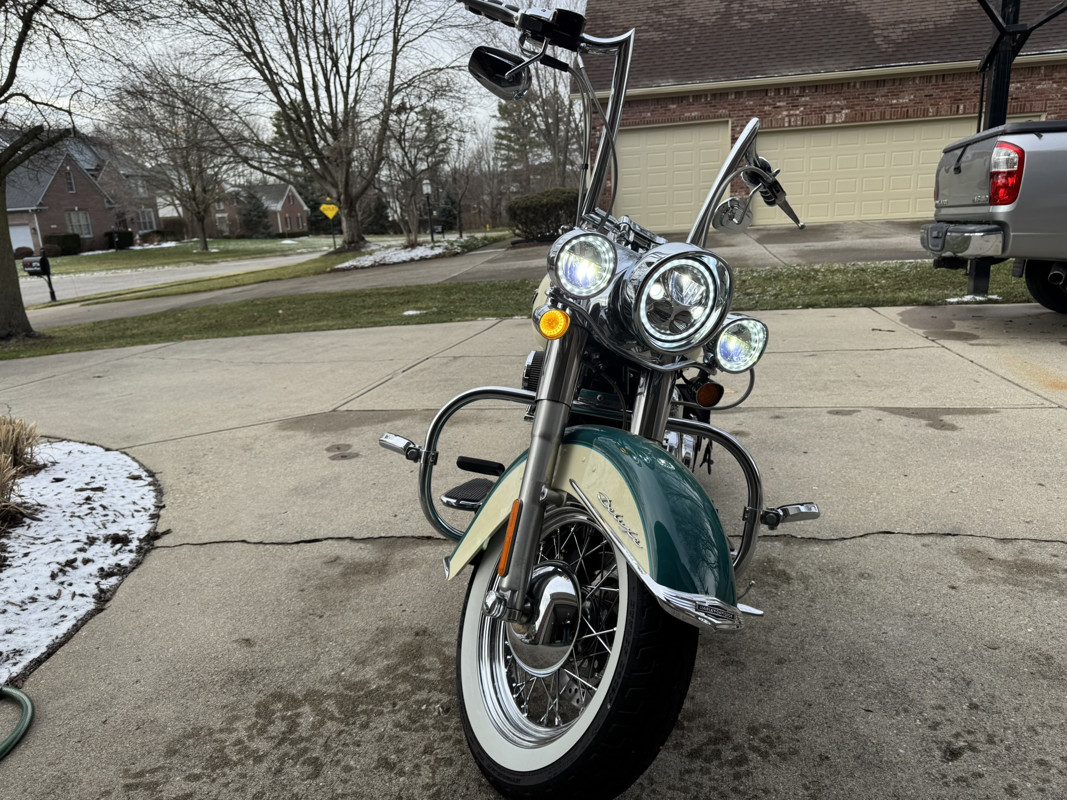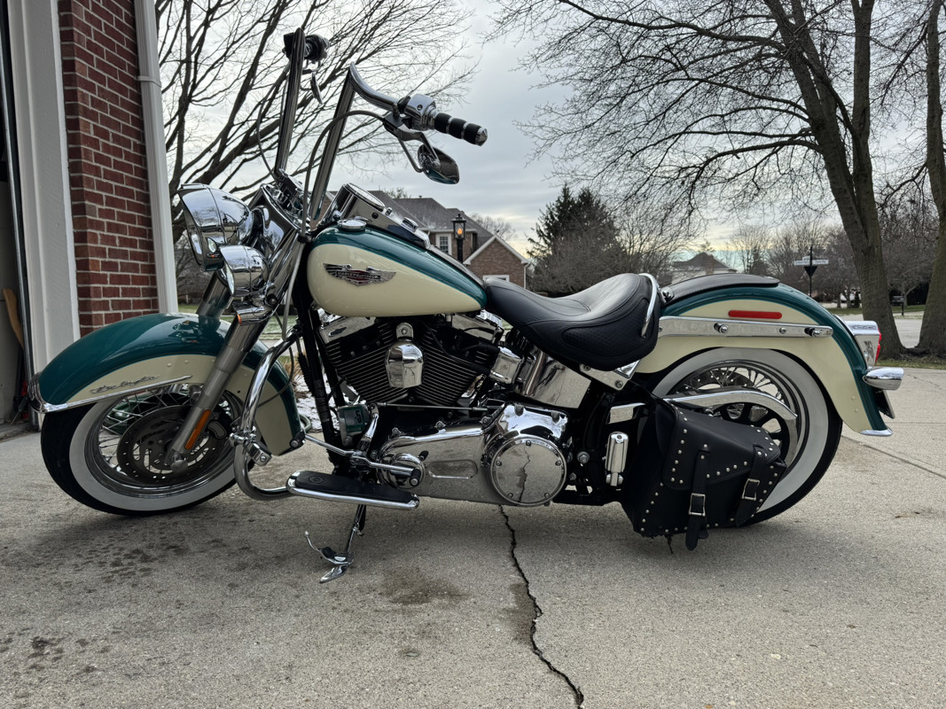 Rare turquoise and cream color combo that really stands out. Classic Softail Deluxe styling with tons of chrome and a great overall look.