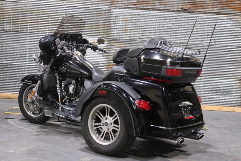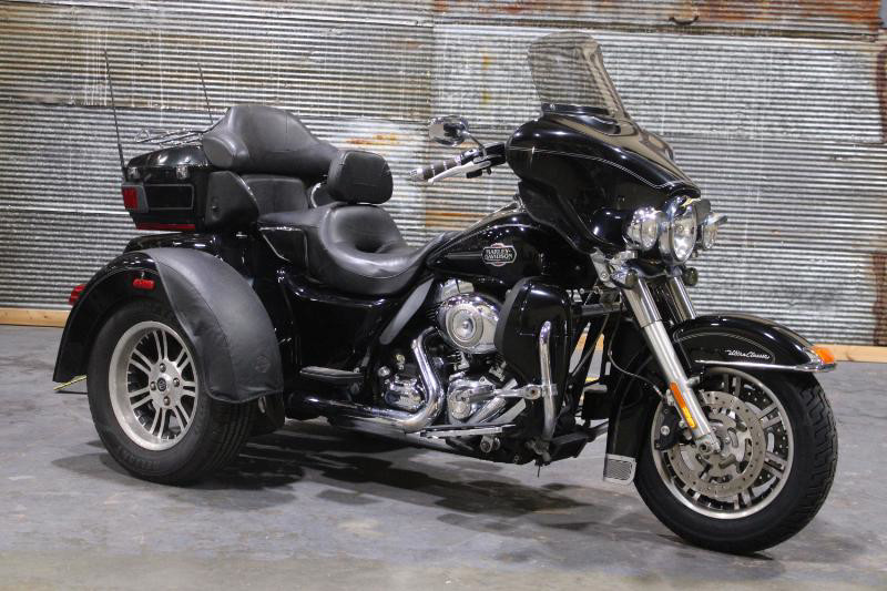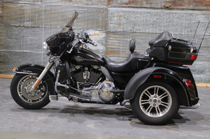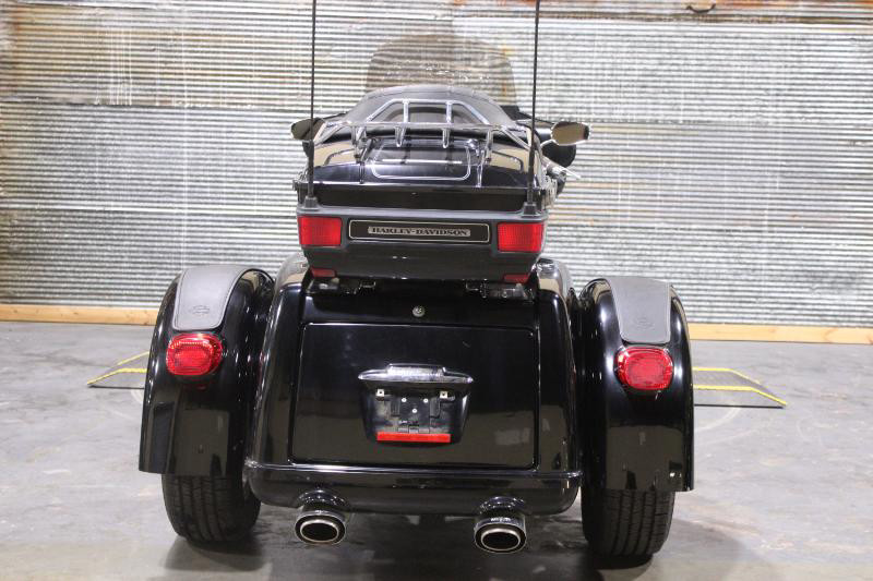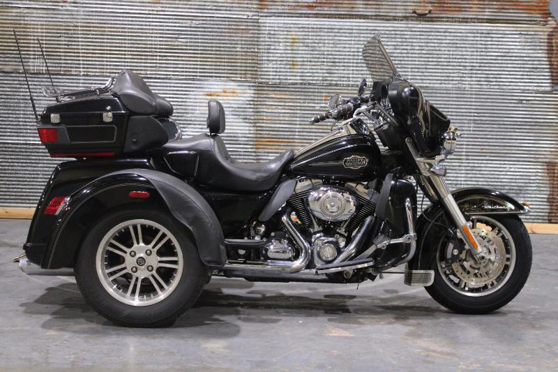 The 2009 Harley-Davidson Tri Glide Ultra Classic is a bold and distinctive three-wheeled touring motorcycle, designed to deliver exceptional comfort, style, and performance. This used model showcases a striking exterior in black with pinstripe detailing, offering a classic yet eye-catching appearance that stands out on the road. The black and pinstripe color scheme adds a touch of elegance and flair, perfectly complementing the rugged look of this trike.