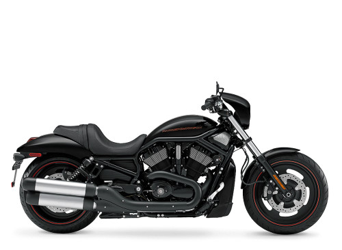 An all-black Revolution engine, fork legs, swingarm and other blacked-out components give the VRSCDX Night Rod Special a raw, street-tough attitude. A colour-matched nacelle surrounds a round reflector-optic headlight. The straight-shot dual mufflers have black end caps and heat shields. Drag handlebars and forward foot controls put the rider in an aggressive clam-shell riding posture. A contrasting racing stripe paint scheme traces the length of the bike. Black slotted cast aluminium wheels have a fine orange stripe on the rim. Available in Black Denim with Vivid Black Racing Stripe, Vivid Black with Pewter Pearl Racing Stripe, or Vivid Black with Mirage Orange Pearl Racing Stripe.