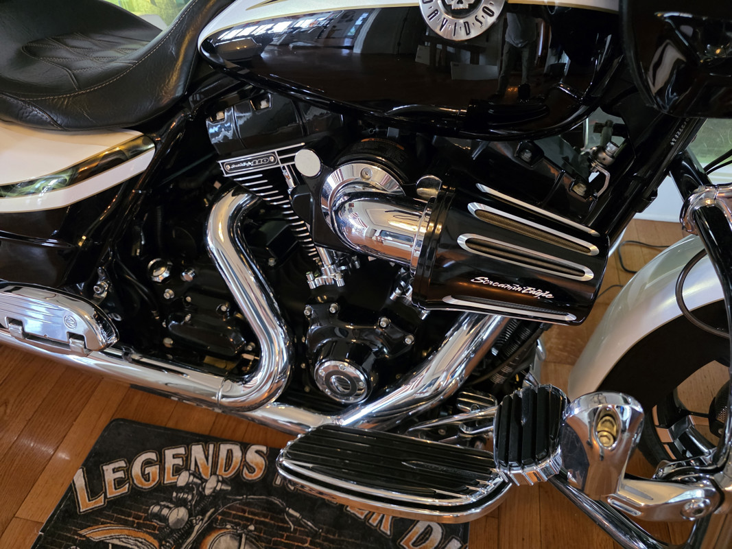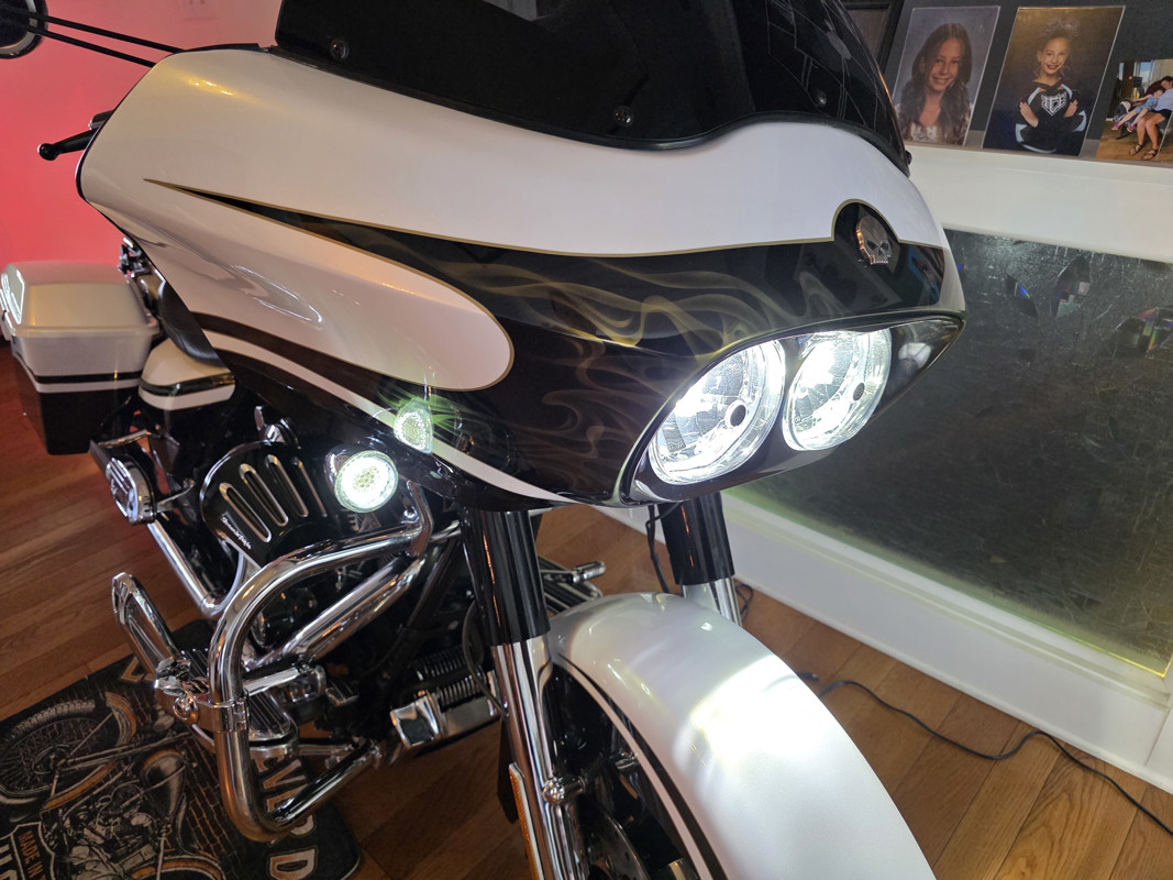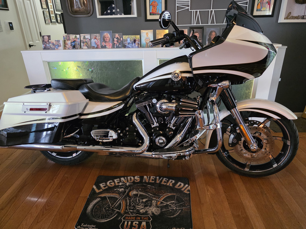 OMG!!!! L@@K at this stunning CVO Road Glide aptly name the "Skunk Glide " by the HD crowd. Same owner since 2012 you'll never find another this nice and as equipped. Finished off in white gold pearl and starfire black with smoke graffics the paint will knock your eyes out in the sun. Has Rhinehart exhaust, Stealth luggage rack, ABS brakes, cruise control, CD, air horns and more. Special ordered with the matching tour box. Other accessories include the CVO cover, riding pegs etc. Just serviced and has brand new tires. I've owned several Skunks over the years and this one is the finest. Not a destress sale, for the buyer that wants quality. And yes, it's sitting in my living room.
