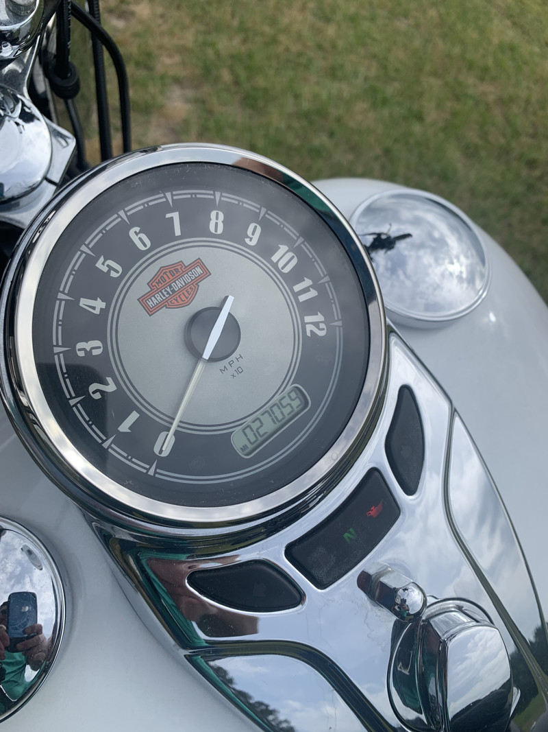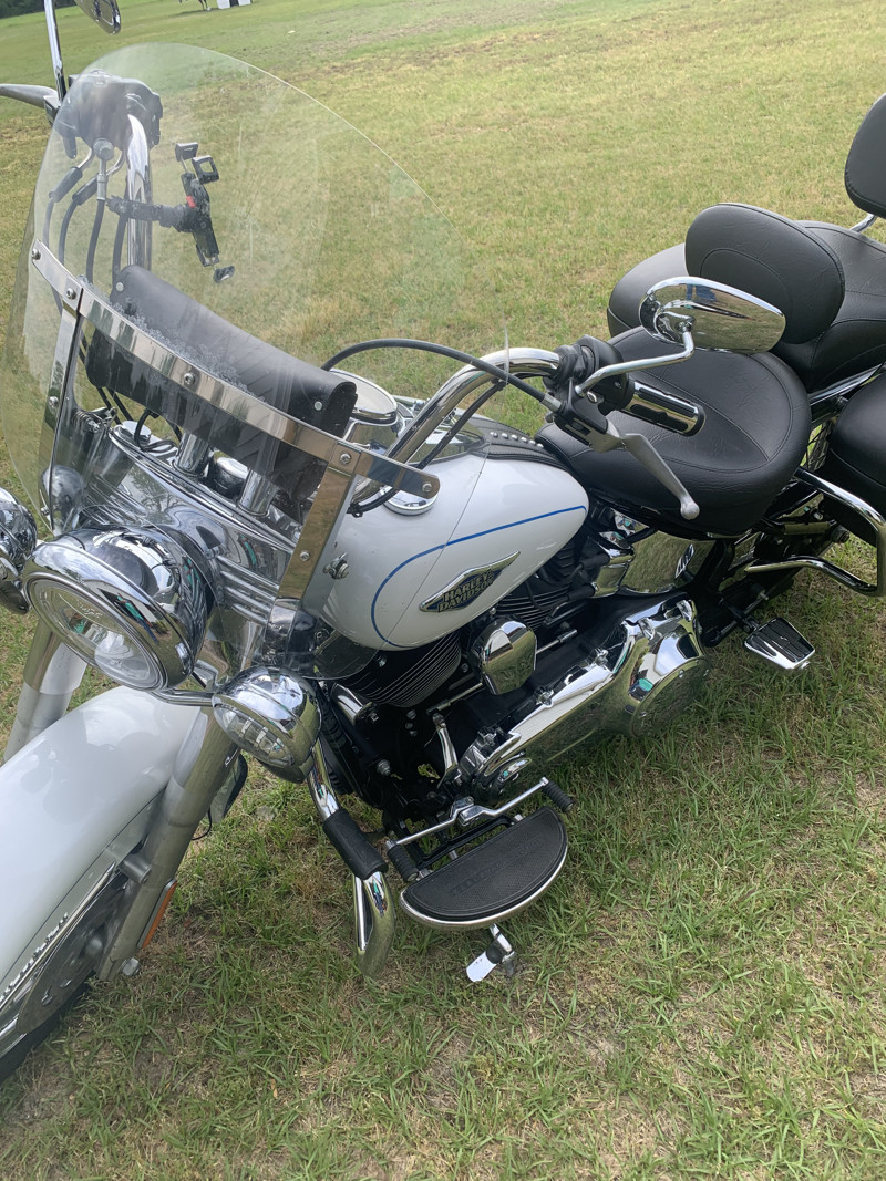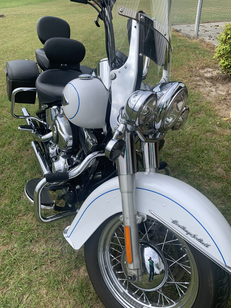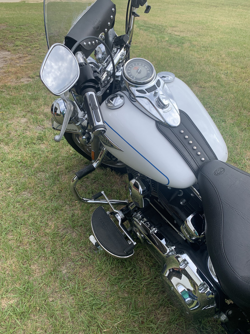 2012 Harley heritage classic in white metallic, blue trim stripe, mustang wide touring seat, Vans/Hines slip ons, Viking hard leather saddle bags, engine guard, saddlebag guards, LED headlight, passing lamps and turn signals and the original windshield