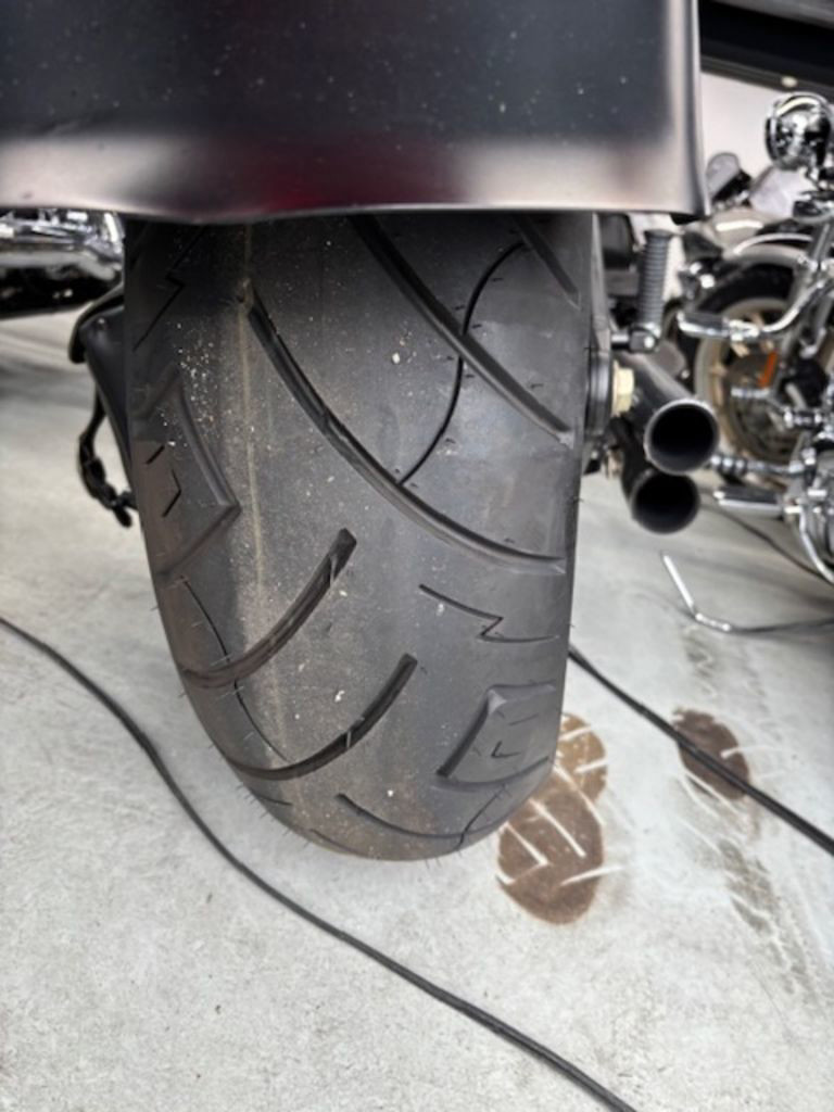 Big in all the right places. The 17-inch wheels of black, bullet-hole, disc-cast aluminum definitely make an impression—especially with rubber 140mm wide in front and a beefy 200mm in back. And check out the chopsticks up front—fat front fork behind the huge, gorgeous headlamp. The handlebars are wide, giant stainless steel with bare-knuckle satin chrome risers. It's a lot of fat in one tight bike. Definitely meaty. Wide. Big-boned. A bruiser. Call it what you want. Just admit that you want it.