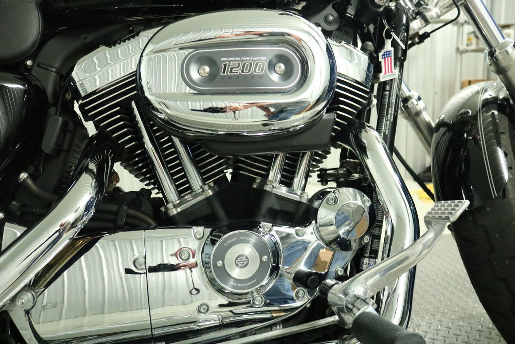 The 2012 Harley-Davidson® Sportster® 1200 Custom XL1200C is a true Harley® Sportster® custom motorcycle, just a little fatter and a little more custom than the other Sportsters. The fat front tire wrapped around a 16-inch wheel gives it a cool custom look and offers nimble handling. Stylistic components including new rear lighting, chrome 5-spoke cast wheels, and an old school looking pull-back handlebar give the Sportster® 1200 Custom motorcycle unique Harley-Davidson® style with modern motorcycle functions. A two-up custom seat gives you just enough room to bring a passenger along on your journey. The Harley® Sportster® 1200 Custom, like all H-D® bikes, comes ready to be modified and accessorized to fit your body and personal style. The black powder-coated Evolution® 1200cc engine is rubber-mounted and air-cooled, featuring aluminum heads and cylinders for a lighter load and electronic fuel injection.