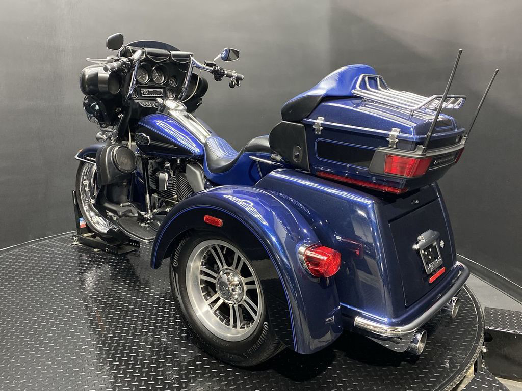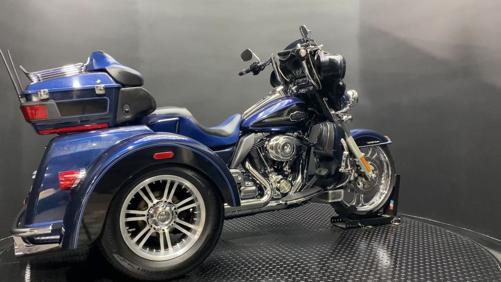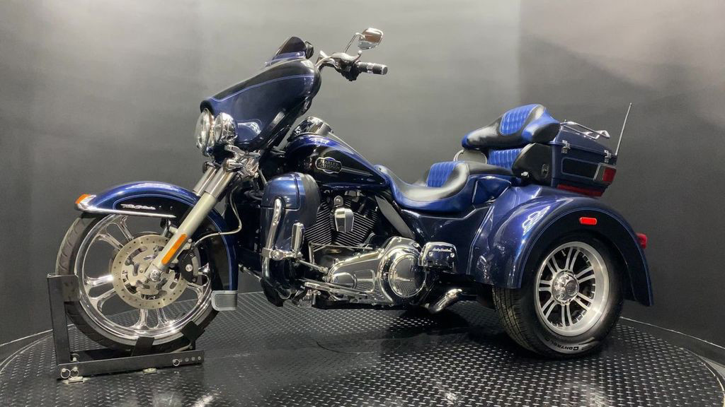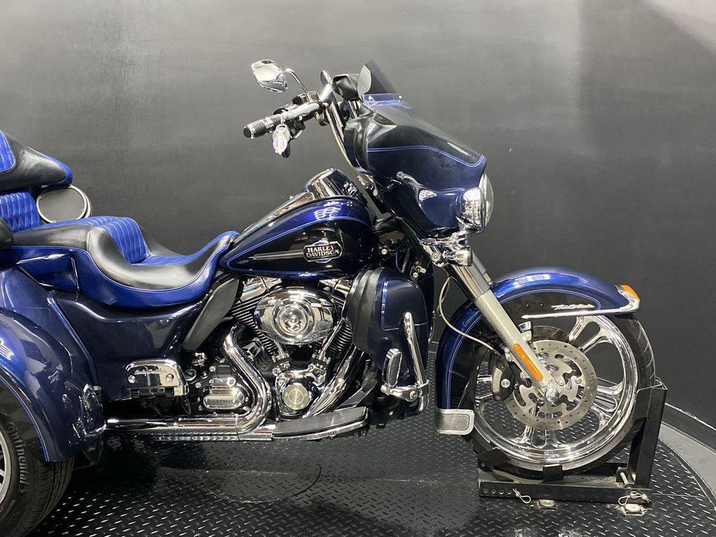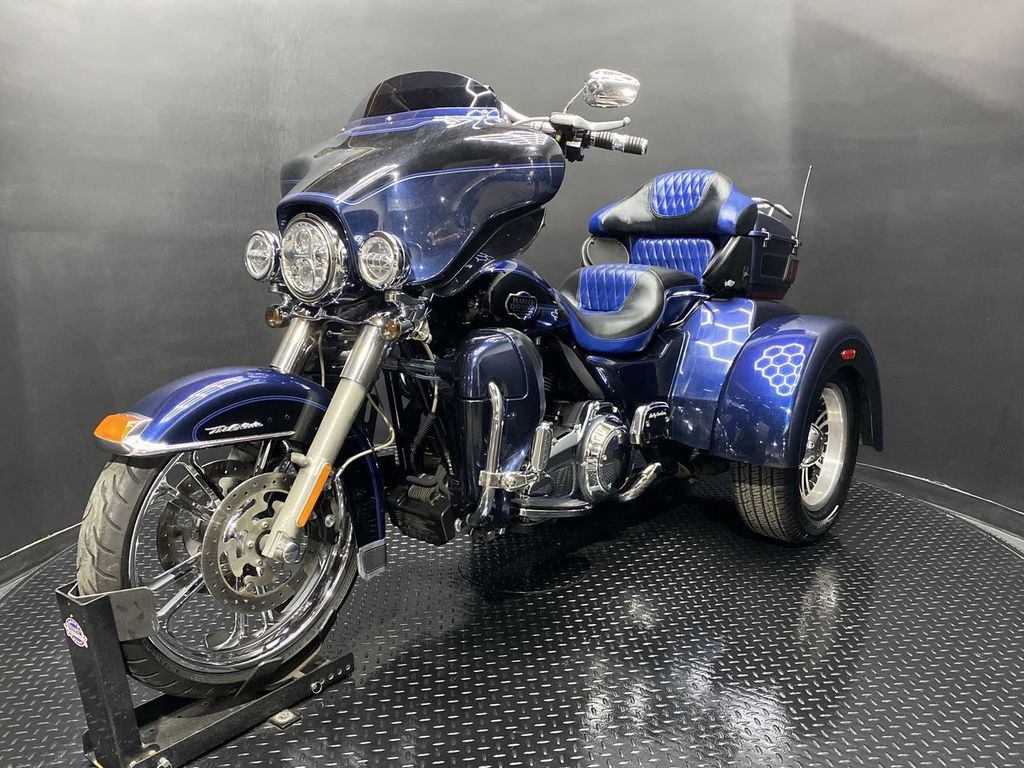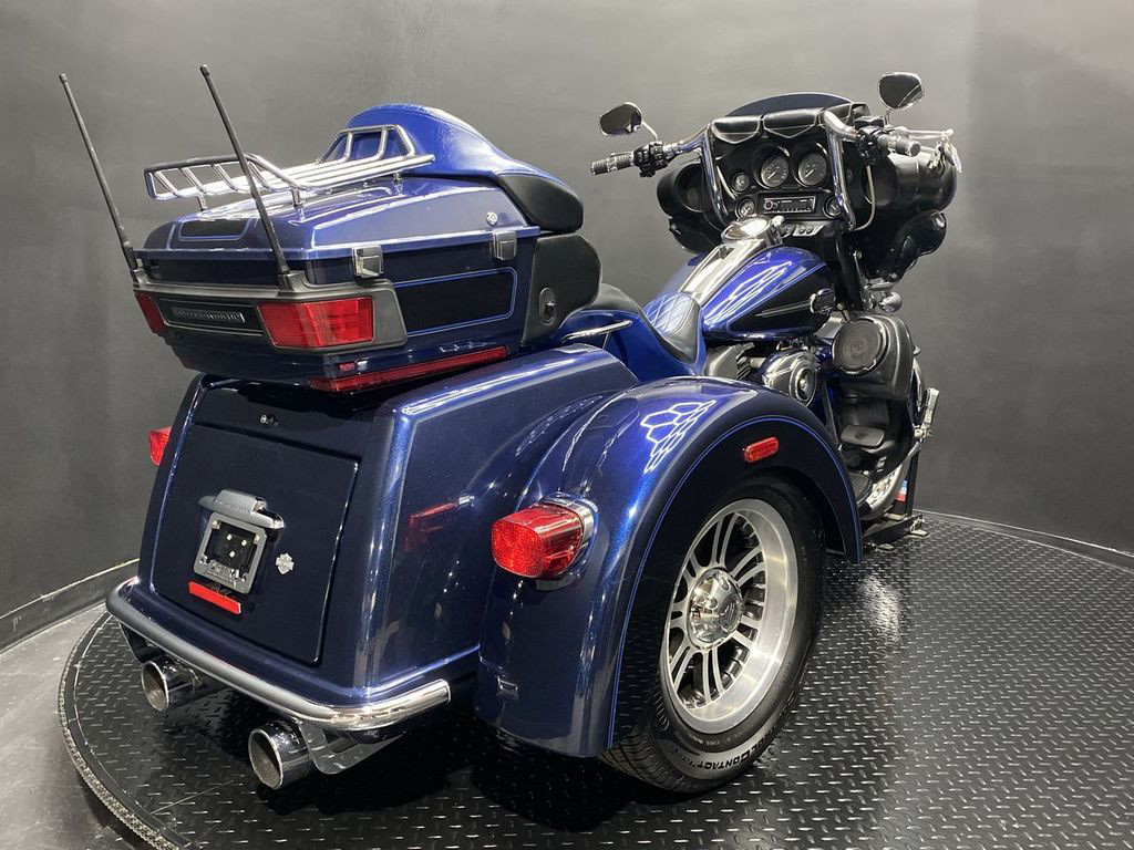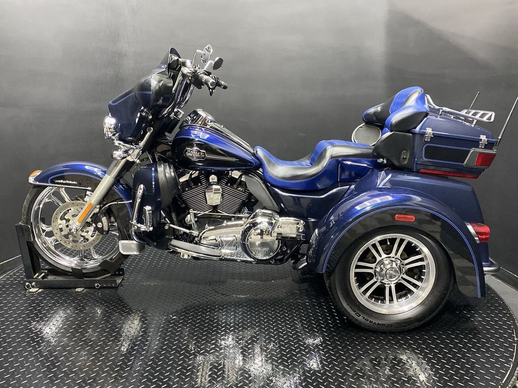 YOU ARE LOOKING AT A 2012 HARLEY DAVIDSON TRI-GLIDE ULTRA CLASSIC (FLHTCUTG) WITH 28,630 MILES ON IT. IT IS BIG BLUE PEARL AND VIVID BLACK IN COLOR AND POWERED BY A 1690CC (103") FUEL INJECTED ENGINE AND 6 SPEED TRANSMISSION WITH STARTER AIDED REVERSE. THE BIKE COMES WITH CRUISE CONTROL, 2 KEYS, 2 FOBS, AND FACTORY SECURITY SYSTEM. THERE ARE SOME EXTRAS ON THE BIKE WHICH INCLUDE RINEHART SLIP-ON MUFFLERS ($584.95), STAGE 1 AIR INTAKE ($139.95), LED HEADLIGHT ($399.95), LED PASSING LAMPS ($199.95), 3 POCKET WINDSHIELD POUCH ($67.95), CUSTOM UPHOLSTERED SEAT, 21" FRONT WHEELS ($999.95), FRONT AXLE BOLT COVER ($39.95), HIGHWAY PEGS ($179.95), TRUNK GUARD ($349.95), LUGGAGE RACK ($124.95), APE HANGER BARS ($1,500 INSTALLED), AND KAHUNA GRIPS ($139.95).THERE ARE NO DENTS OR DINGS THAT I CAN FIND. THERE ARE TOUCHUPS ON THE FRONT FENDER, REAR FENDERS, TOUR TRUNK, AND DISCOLORING ON THE FRONT FAIRING. THE CHROME AND ALUMINUM HAVE OXIDATION ON THE FORK LOWERS, RUST ON THE HEADLIGHT TRIM, AND SCRATCHES ON THE EXHAUST TIPS. THE TIRES HAVE GOOD TREAD LEFT ON THEM.