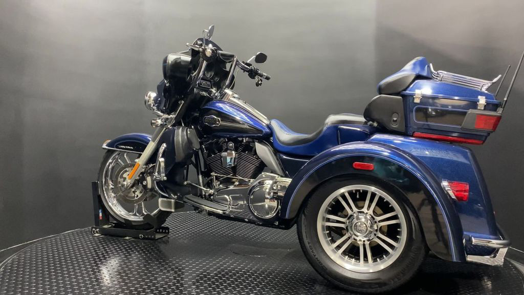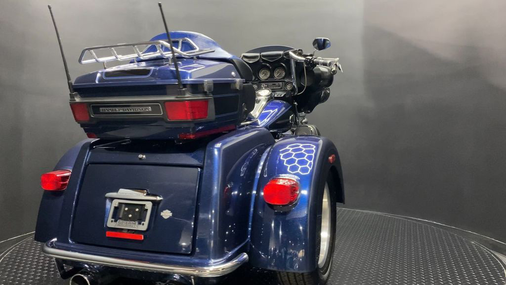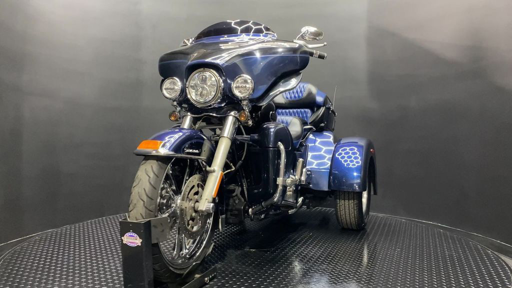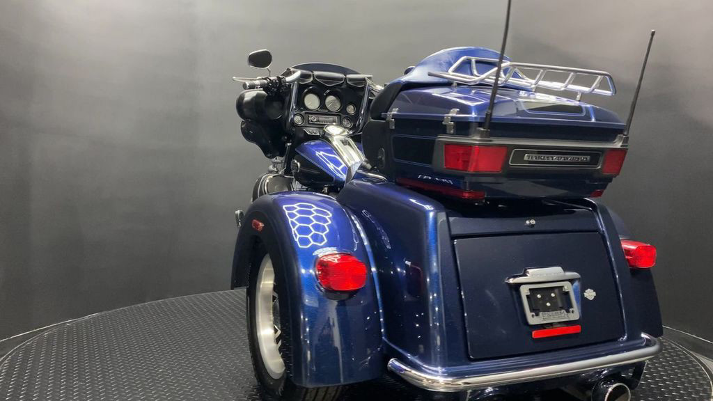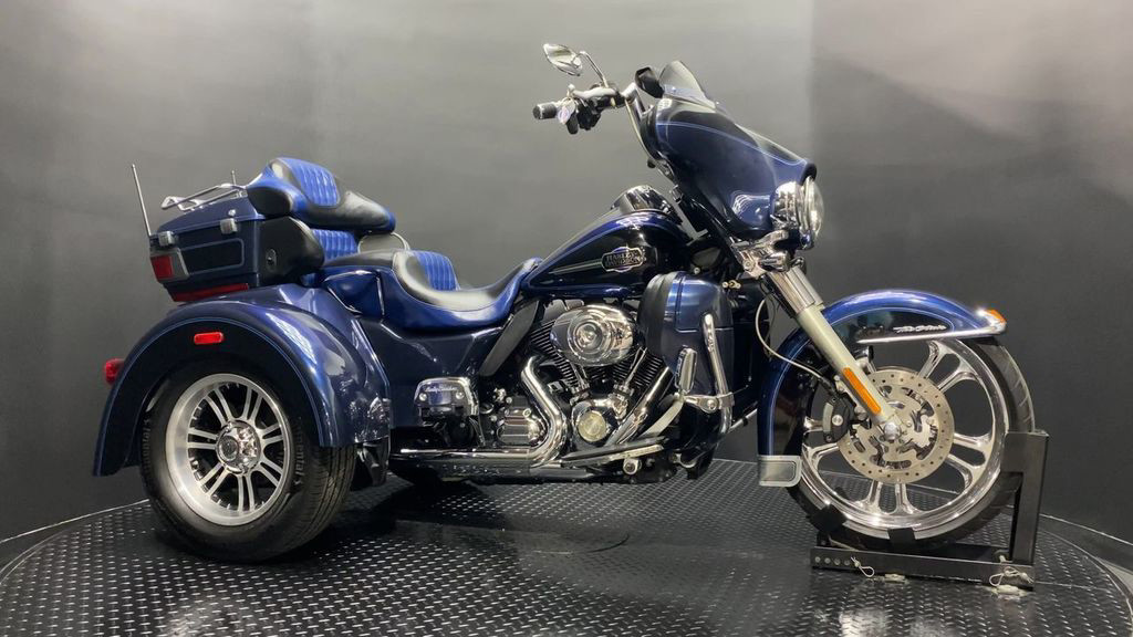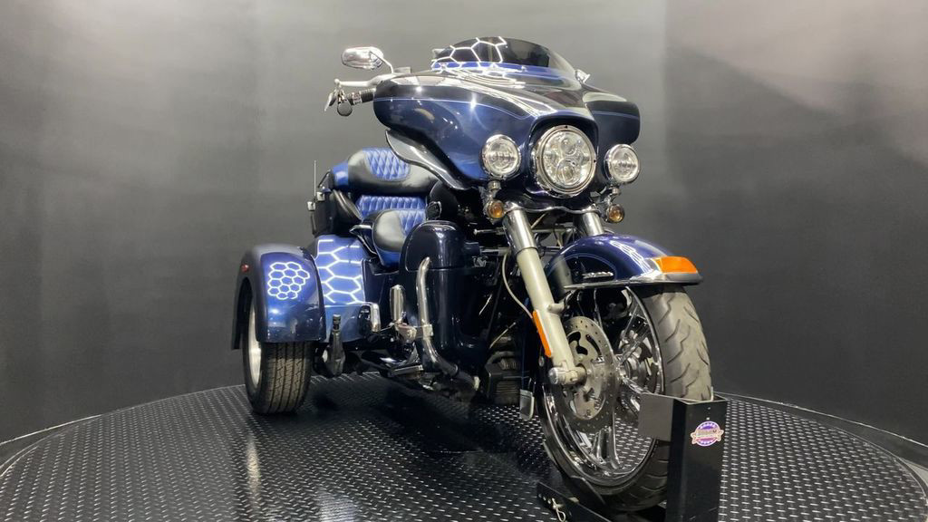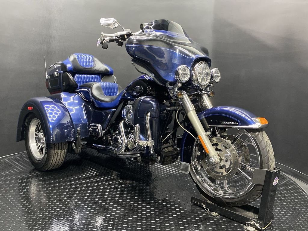 YOU ARE LOOKING AT A 2012 HARLEY DAVIDSON TRI-GLIDE ULTRA CLASSIC (FLHTCUTG) WITH 28,630 MILES ON IT. IT IS BIG BLUE PEARL AND VIVID BLACK IN COLOR AND POWERED BY A 1690CC (103") FUEL INJECTED ENGINE AND 6 SPEED TRANSMISSION WITH STARTER AIDED REVERSE. THE BIKE COMES WITH CRUISE CONTROL, 2 KEYS, 2 FOBS, AND FACTORY SECURITY SYSTEM. THERE ARE SOME EXTRAS ON THE BIKE WHICH INCLUDE RINEHART SLIP-ON MUFFLERS ($584.95), STAGE 1 AIR INTAKE ($139.95), LED HEADLIGHT ($399.95), LED PASSING LAMPS ($199.95), 3 POCKET WINDSHIELD POUCH ($67.95), CUSTOM UPHOLSTERED SEAT, 21" FRONT WHEELS ($999.95), FRONT AXLE BOLT COVER ($39.95), HIGHWAY PEGS ($179.95), TRUNK GUARD ($349.95), LUGGAGE RACK ($124.95), APE HANGER BARS ($1,500 INSTALLED), AND KAHUNA GRIPS ($139.95).THERE ARE NO DENTS OR DINGS THAT I CAN FIND. THERE ARE TOUCHUPS ON THE FRONT FENDER, REAR FENDERS, TOUR TRUNK, AND DISCOLORING ON THE FRONT FAIRING. THE CHROME AND ALUMINUM HAVE OXIDATION ON THE FORK LOWERS, RUST ON THE HEADLIGHT TRIM, AND SCRATCHES ON THE EXHAUST TIPS. THE TIRES HAVE GOOD TREAD LEFT ON THEM.