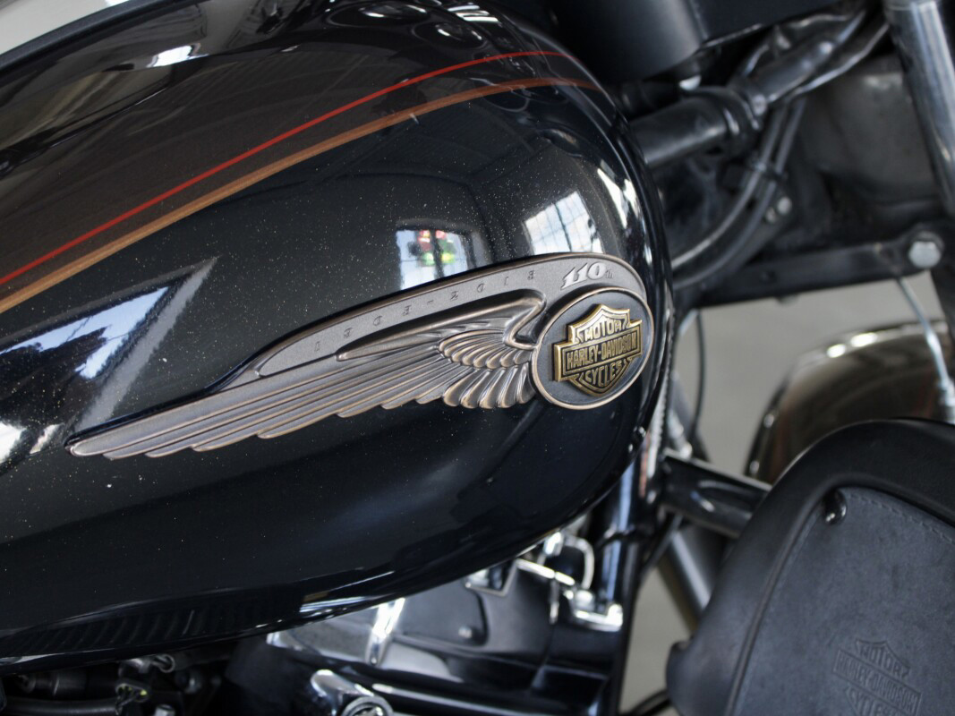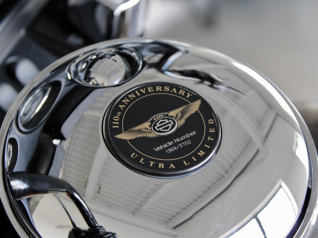 A highlight of each 110th Anniversary Edition model are solid bronze fuel tank badges, plated in black nickel and then distressed to highlight the bronze. A bright gold-tone Bar and Shield cloisonné is inserted in the main body of the single wing badge while each motorcycle will carry other model-specific anniversary badging, trim and a serialization badge.