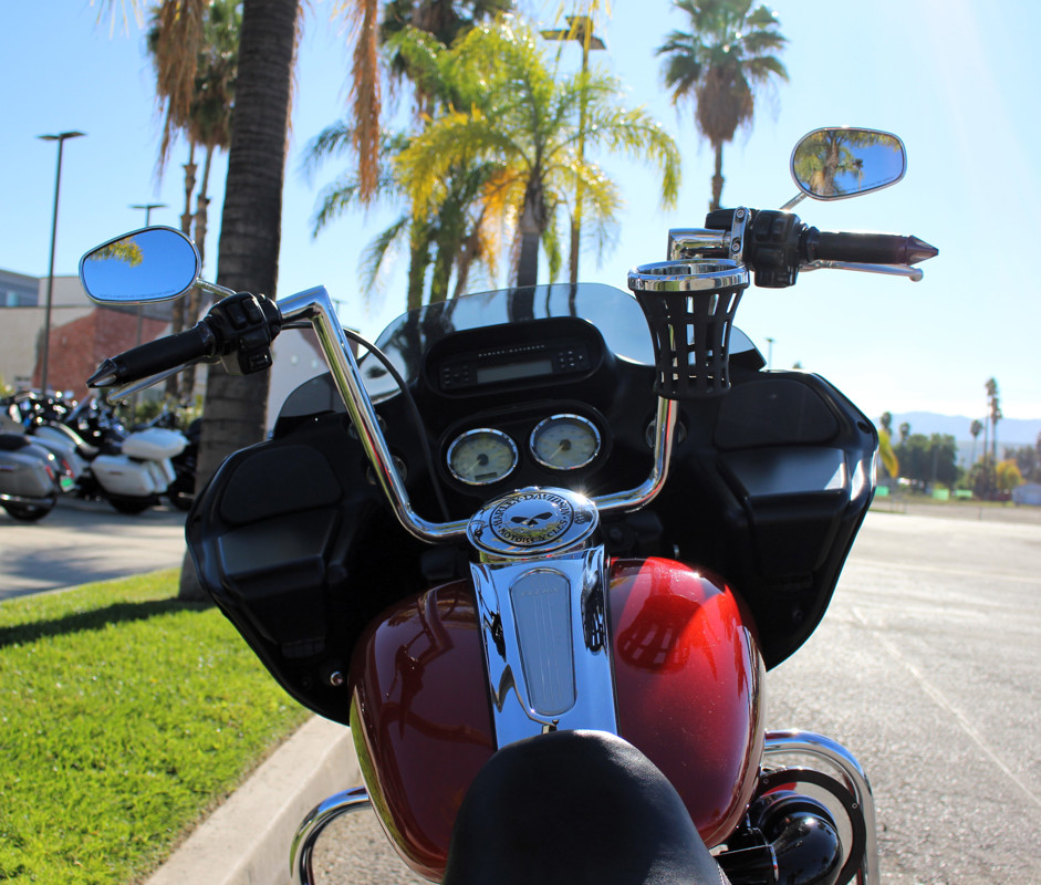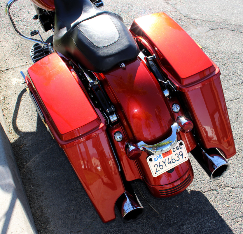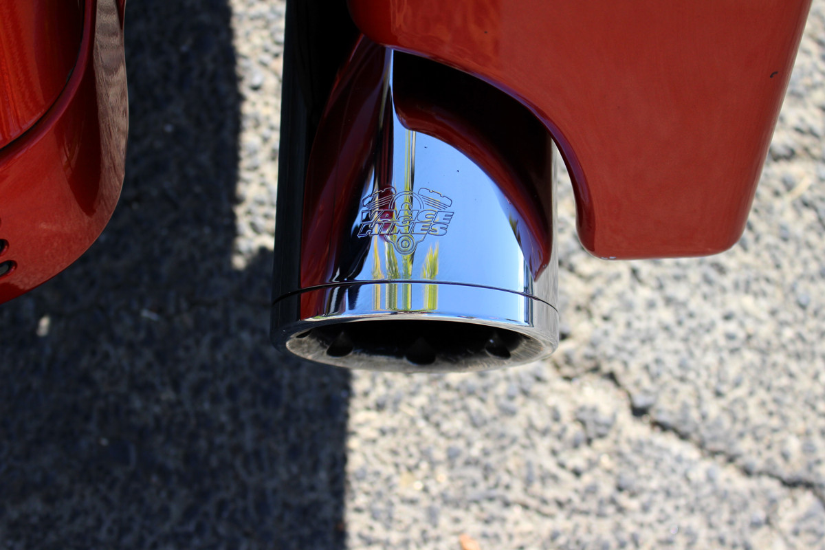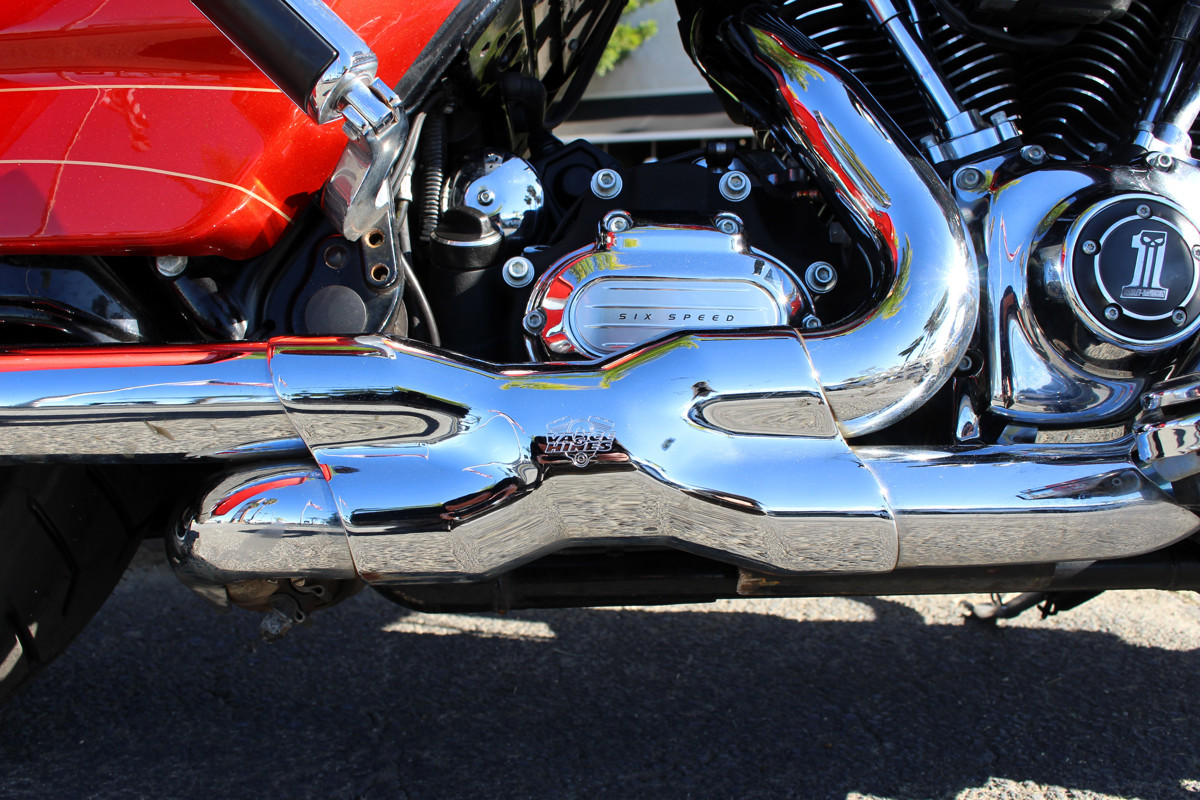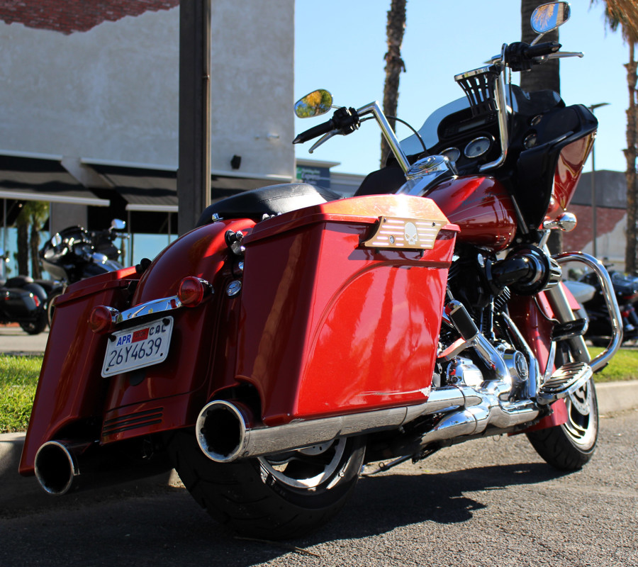 2013 Harley-Davidson® Road Glide — Candy Orange, Vance & Hines Power Duals, custom chrome bars, grips, and cup holder.