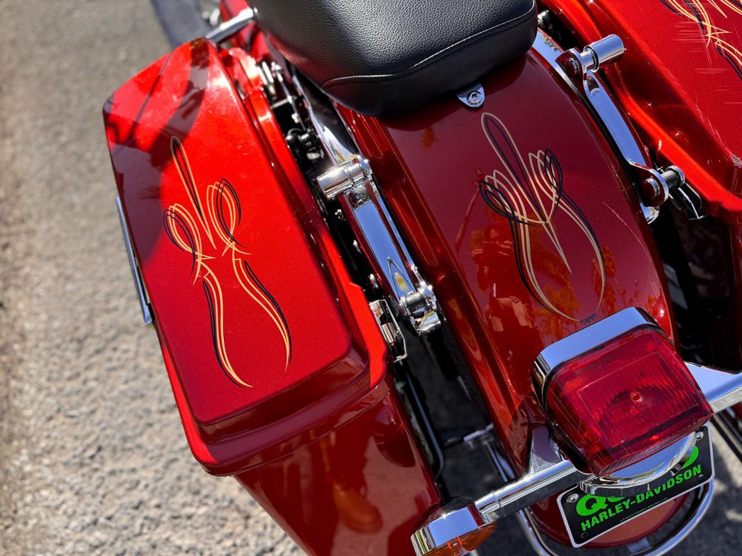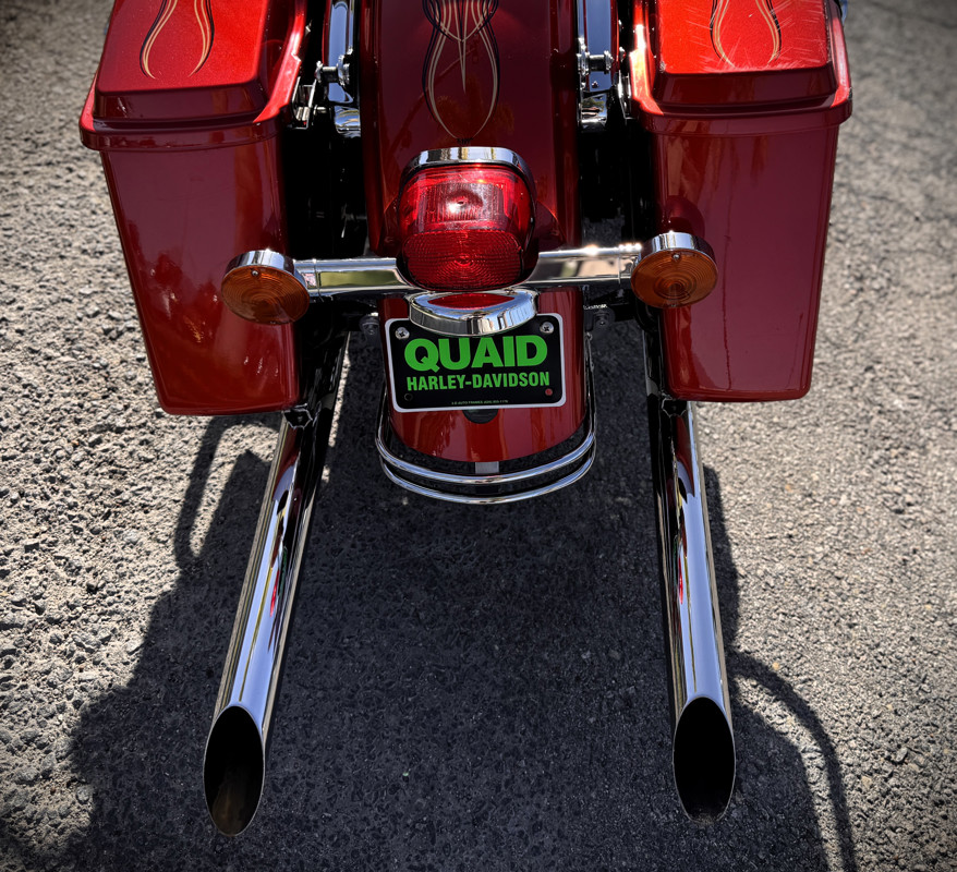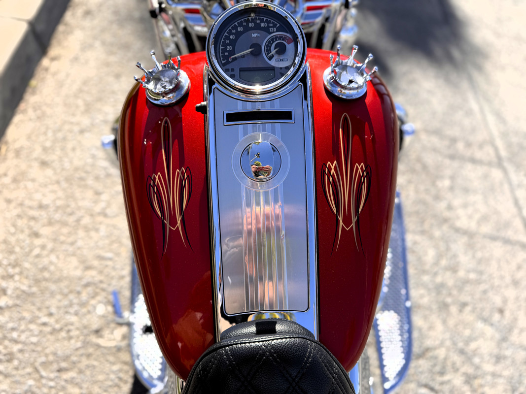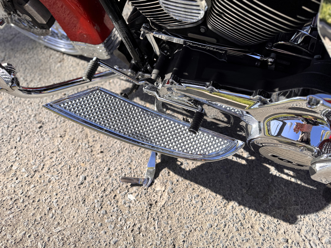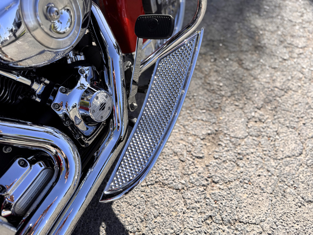 Twin Cam 103™, long custom exhaust, custom floorboards & levers, lowered mirrors, spoke front wheel, passenger docking hardware.