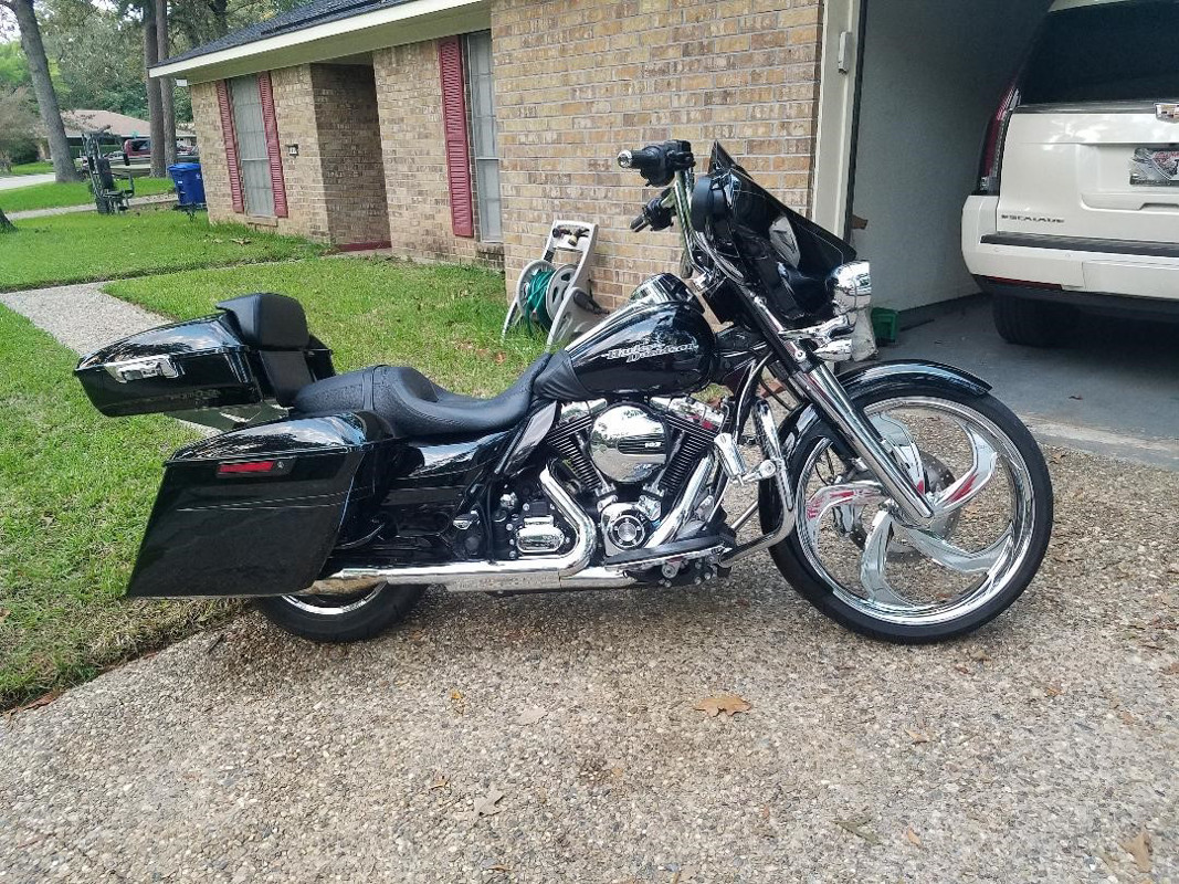 CUSTOM CHROME 23 INCH FRONT TIRE and CHROME REAR WHEEL, CUSTOM HANDLE BARS. HHI TRIPLE TREE, STRETCHED EXTENDED BAGS AND REAR FENDER and many extras