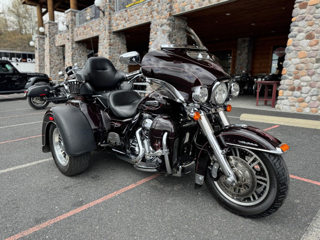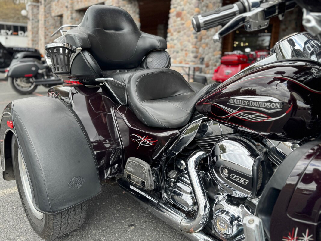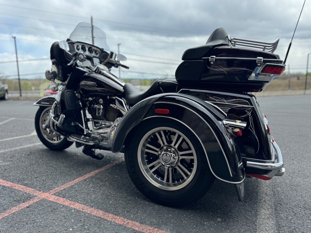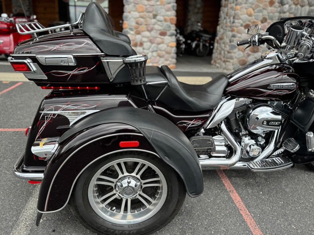 The new for 2014 Tri Glide Ultra Classic provides long-haul, 3-wheel touring comfort and confidence. As part of Project RUSHMORE, it features the new twin-cooled high output Twin Cam 103 engine, built to deliver more power for passing, climbing hills and carrying a passenger and luggage. This is combined with Six-Speed Cruise Drive transmission for low rpm at highway speeds.  The rear-to-front linked brakes offer maximum stopping power while the new Daymaker LED headlamp and LED fog lamps improve visibility. The new Boom Box 6.5 infotainment system features a 6.5 full-color touch screen and the loudest, clearest speakers ever in a Harley-Davidson motorcycle. The luggage spaces have been redesigned with more space inside, a sleek new look outside and new latches for one handed operation. The iconic batwing fairing minimises head buffeting without losing its distinctive, authentic Harley-Davidson style. Designed and built as a single unit with an integrated and seamless look, it is full of all the features that you could need and want in a Trike.