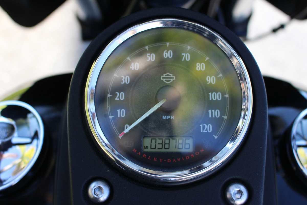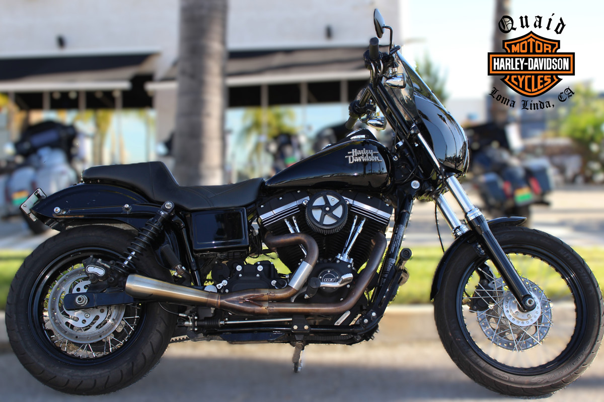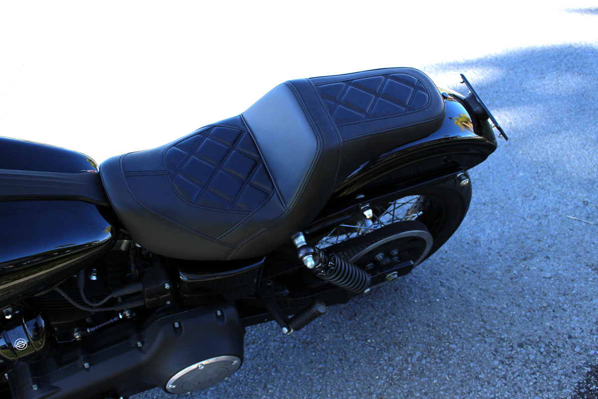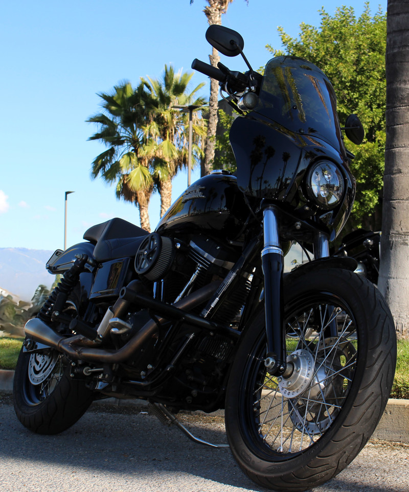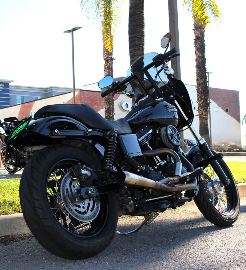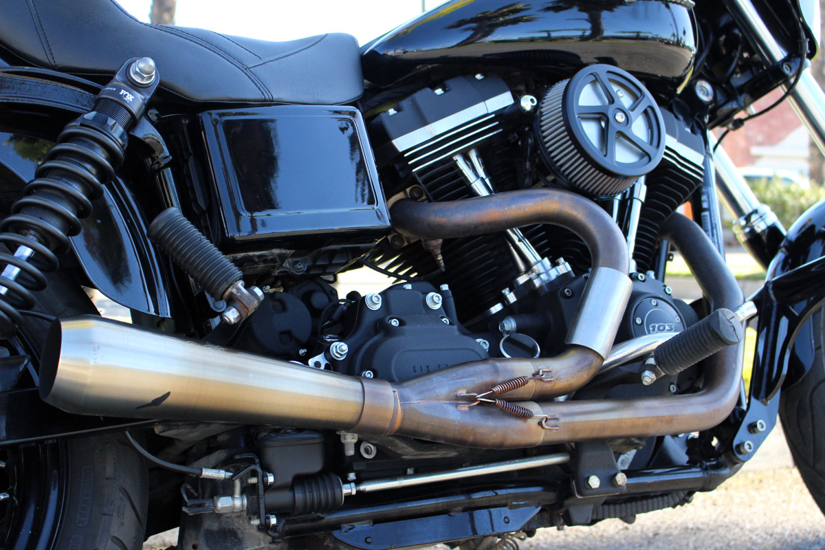 2016 Dyna Street Bob FXDB — Fab28 exhaust, custom air cleaner, Fox Street Performance rear shocks, custom front end with bars & tinted windshield, custom seat, and frame-wired lay-down plate.