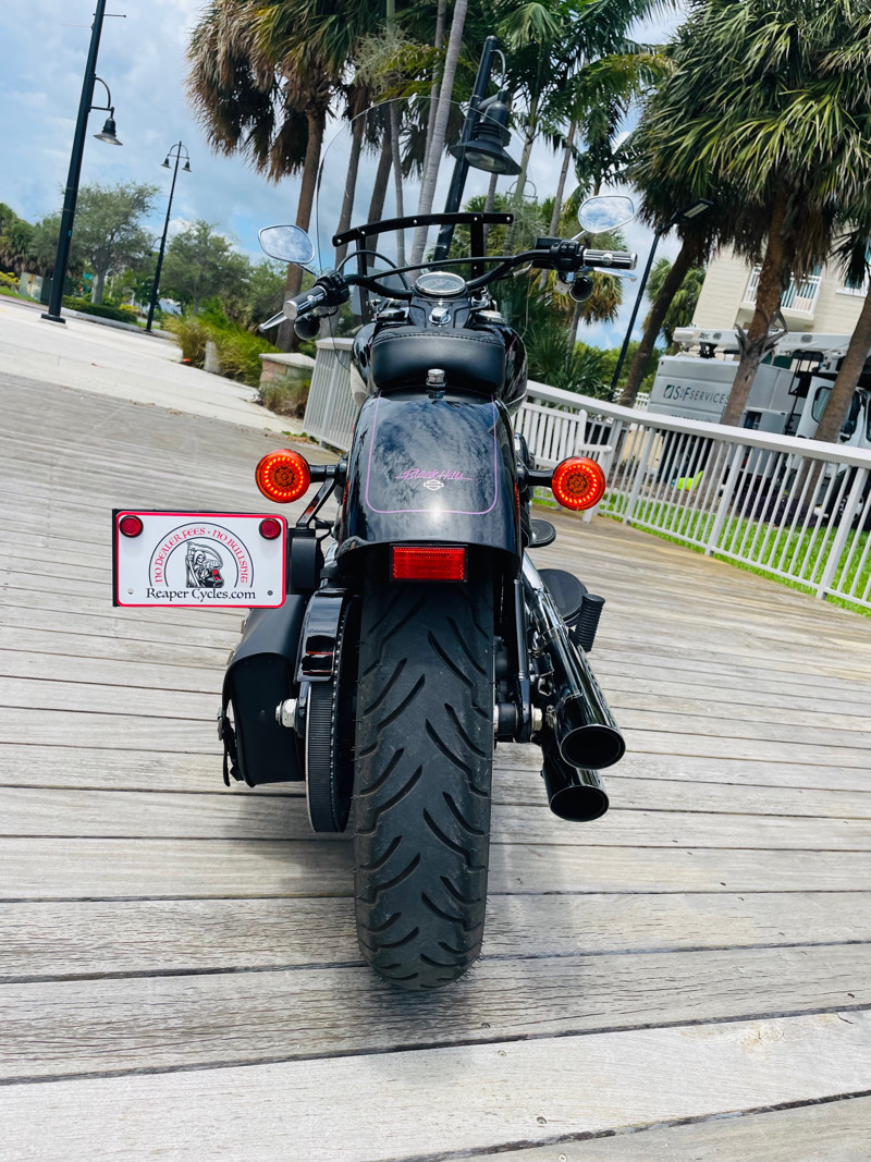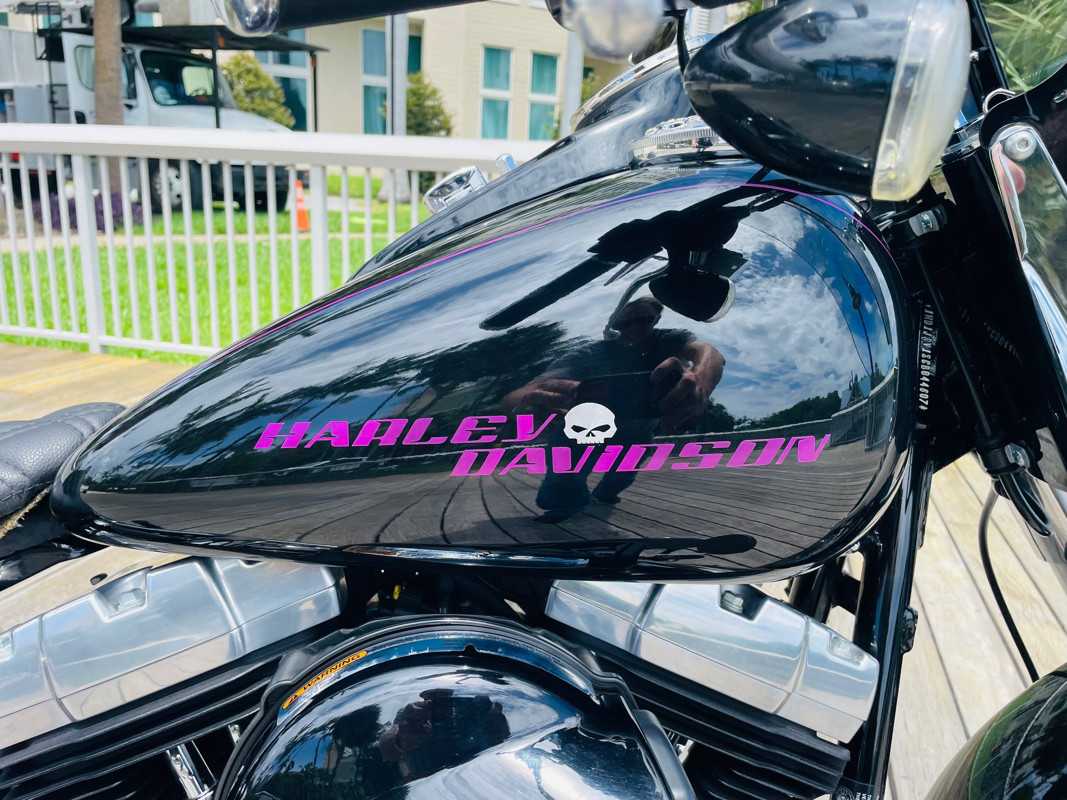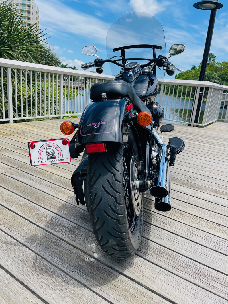 This bike received it custom paint by Black Hills HD in Rapid City SD, painted by “Brodie” with a custom light purple striping and lettering.