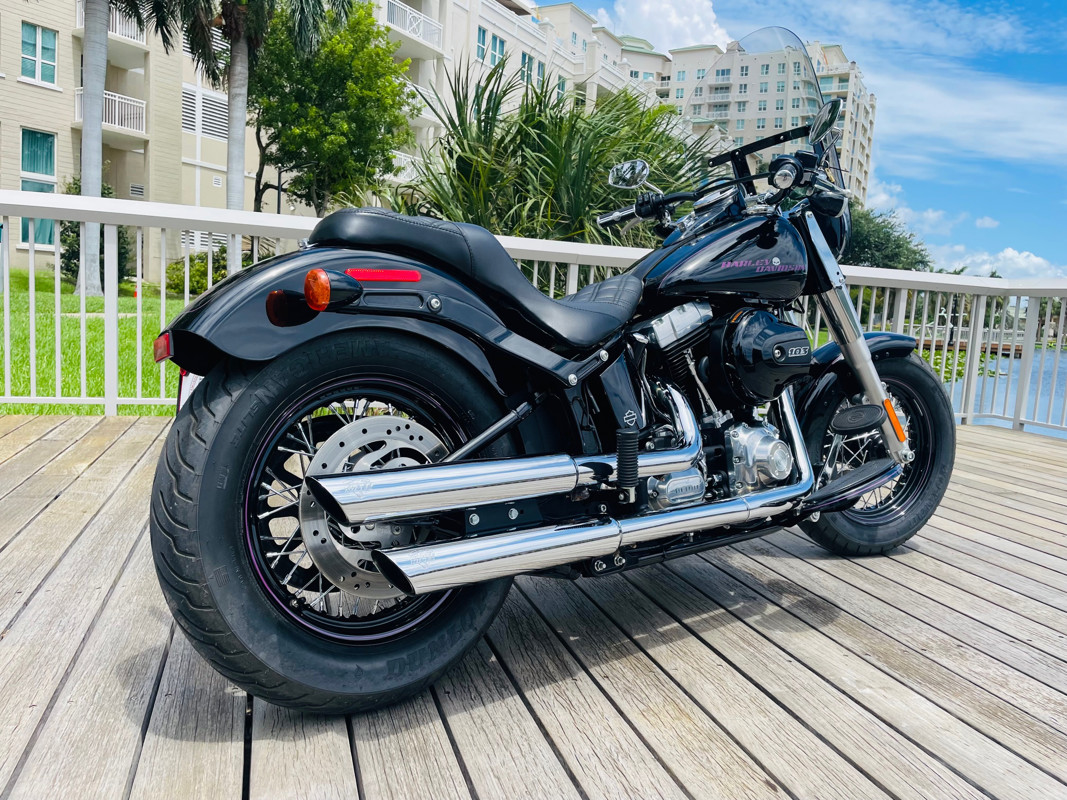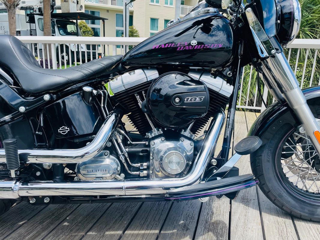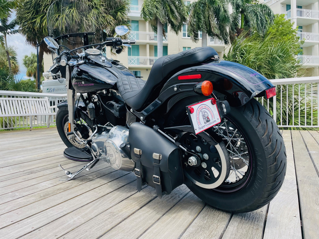 Beautiful “vivid black” paint with some nice option on the bike and in of course great overall condition. Garage kept, this bike shows almost no corrosion whatsoever. Fitted with the amazing 103ci engine and 6-speed transmission this bike will transform your riding. It has a Vance and Hines exhaust added for that special sound and the only real flaw is small damage to the rear fender and it has an unfortunate small dent in the left side of the tank. Fix it if you wanted to make it perfect or not worry about it. Cousin to the Fat Boy, “Slim” has a smaller rear tire and therefore nicer cornering abilities. Slim is just the sportier version of a Fat Boy. Tires are in good condition. Super low miles and already equipped with a passenger seat.