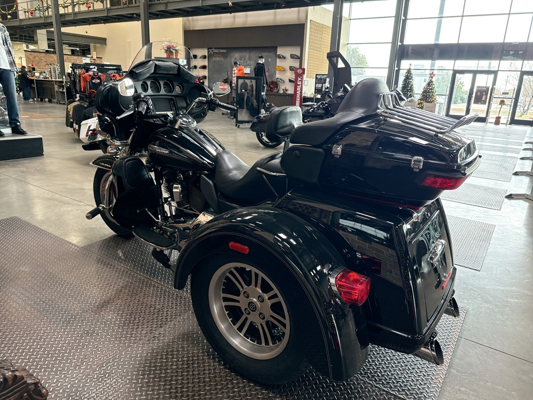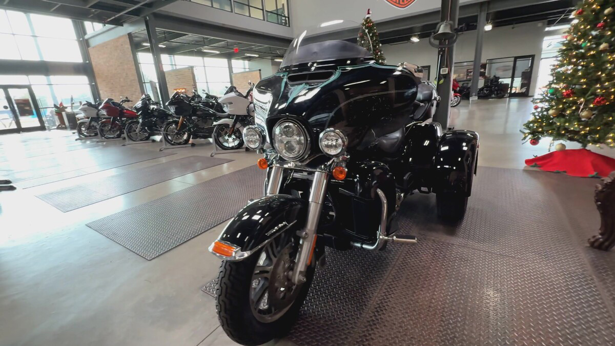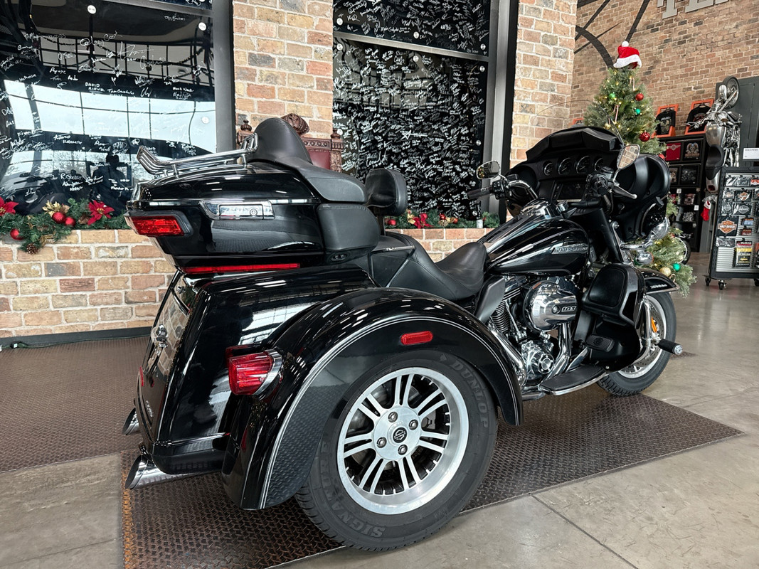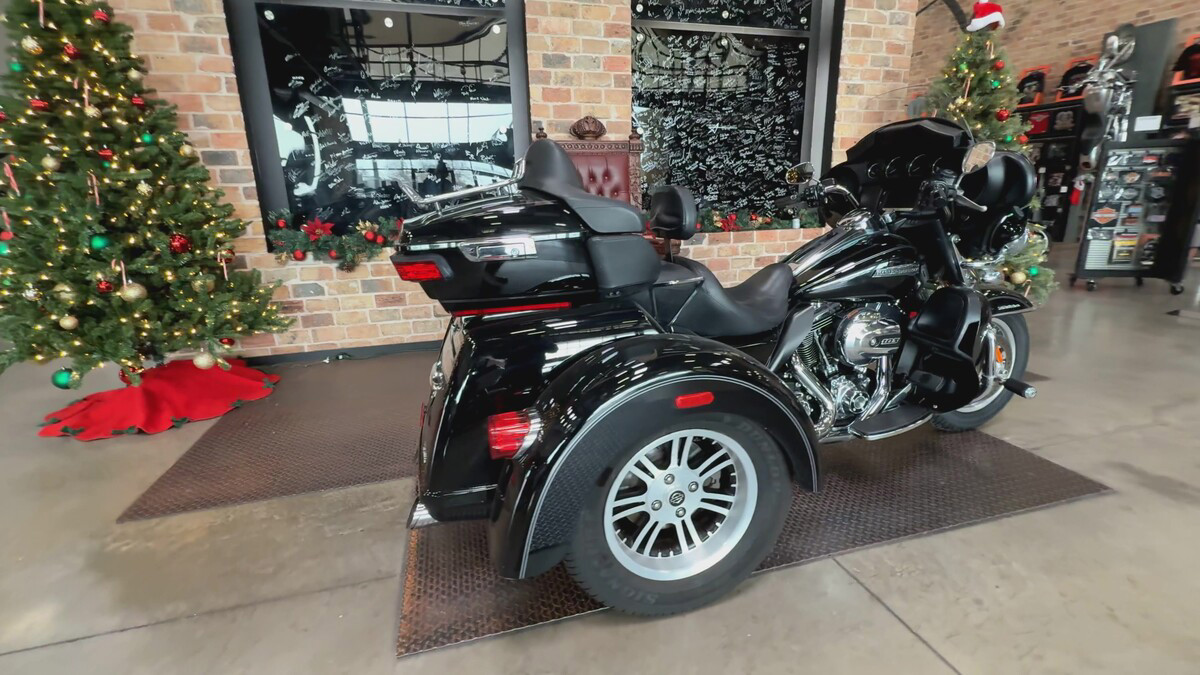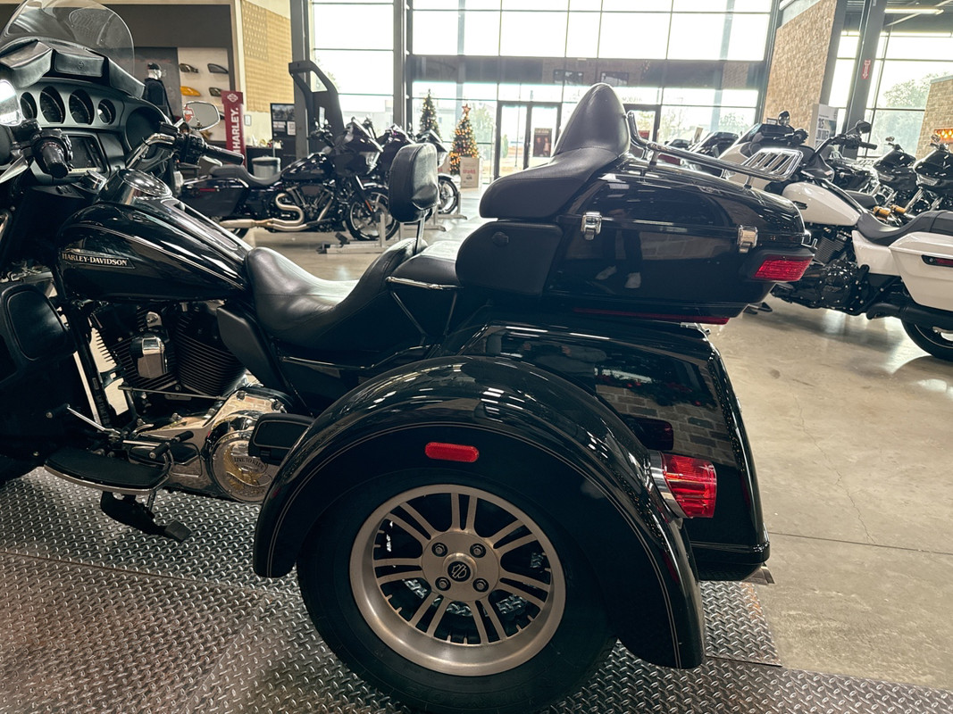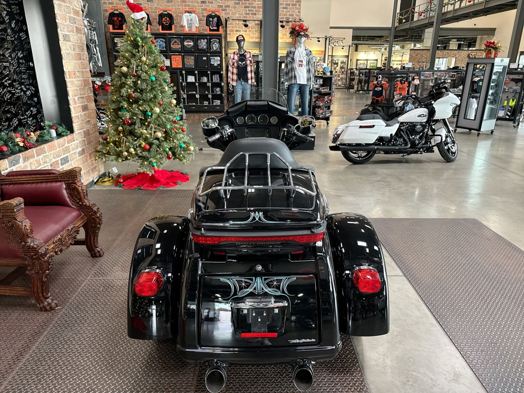 Dressed in a sleek black finish complemented by pinstripe accents, this trike commands attention whether parked or cruising down the highway. The iconic Harley-Davidson aesthetic shines through, resonating with the brand's deep-rooted heritage and spirit of individuality.