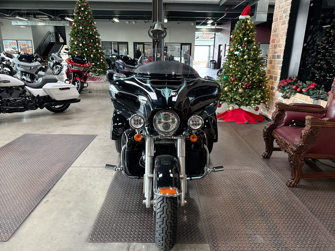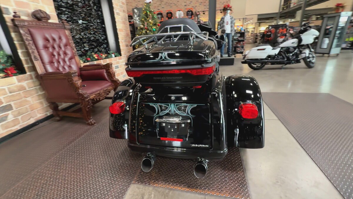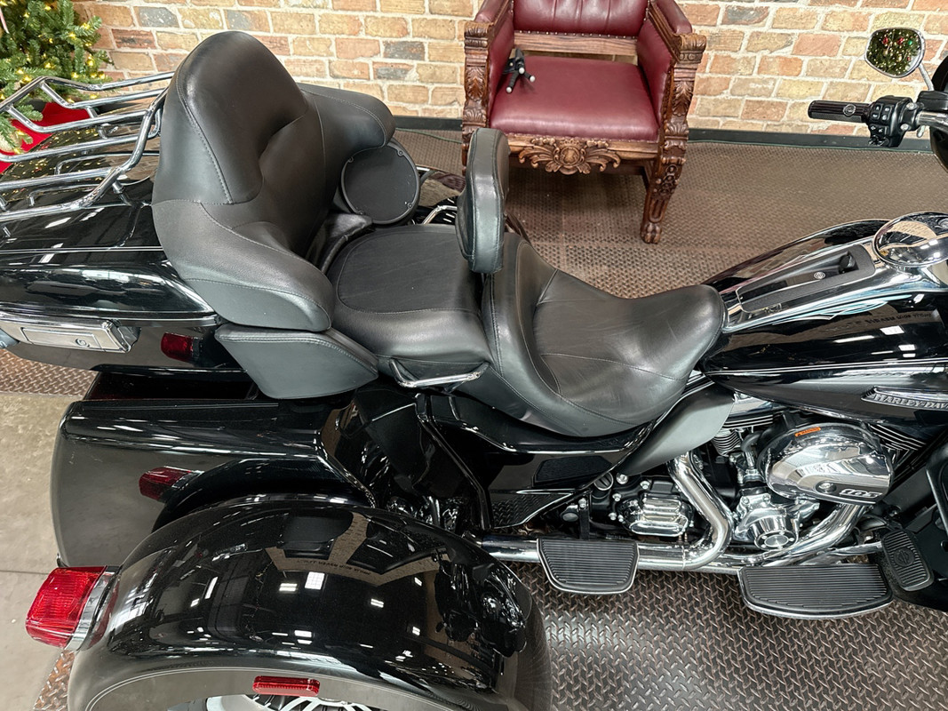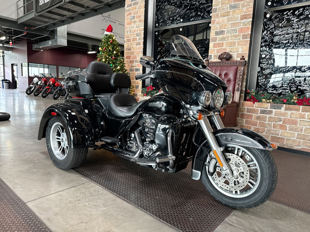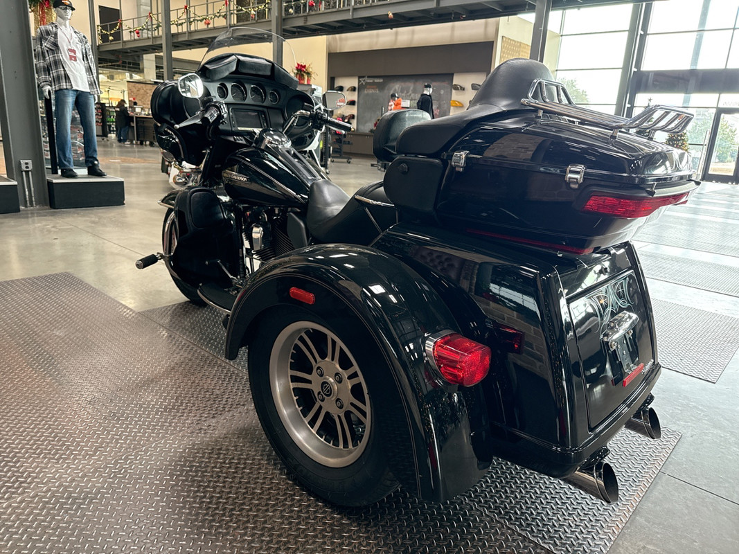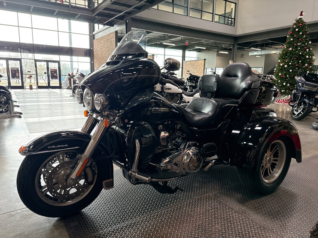 Dressed in a sleek black finish complemented by pinstripe accents, this trike commands attention whether parked or cruising down the highway. The iconic Harley-Davidson aesthetic shines through, resonating with the brand's deep-rooted heritage and spirit of individuality.