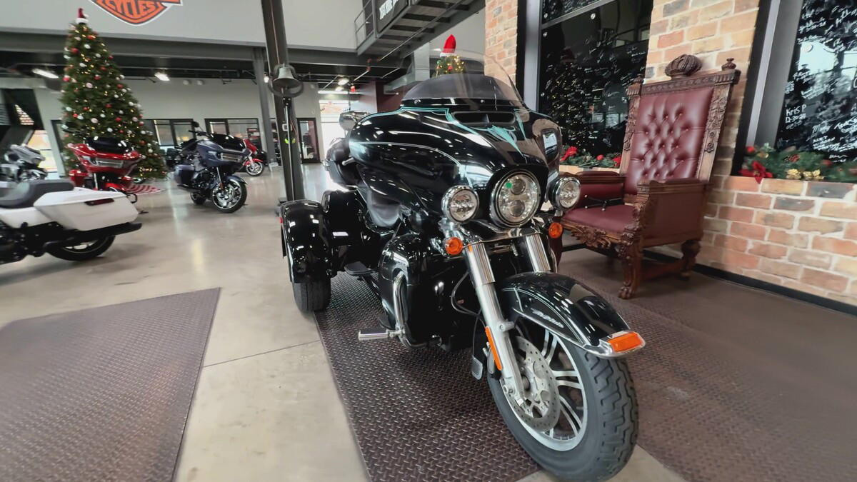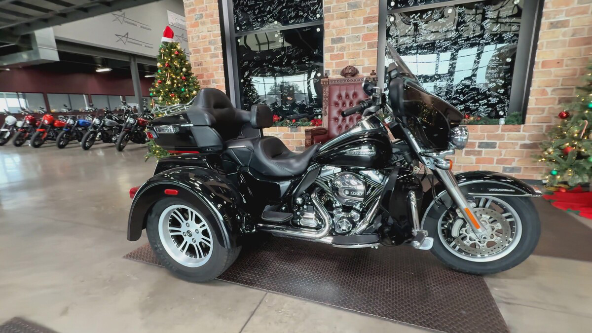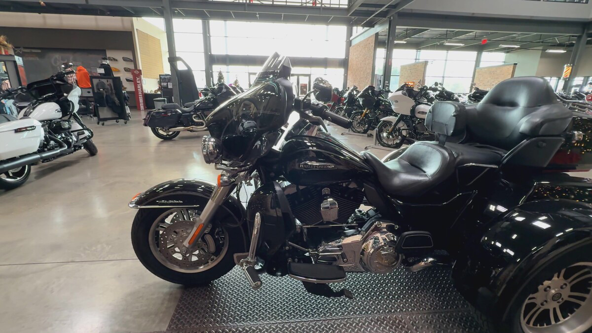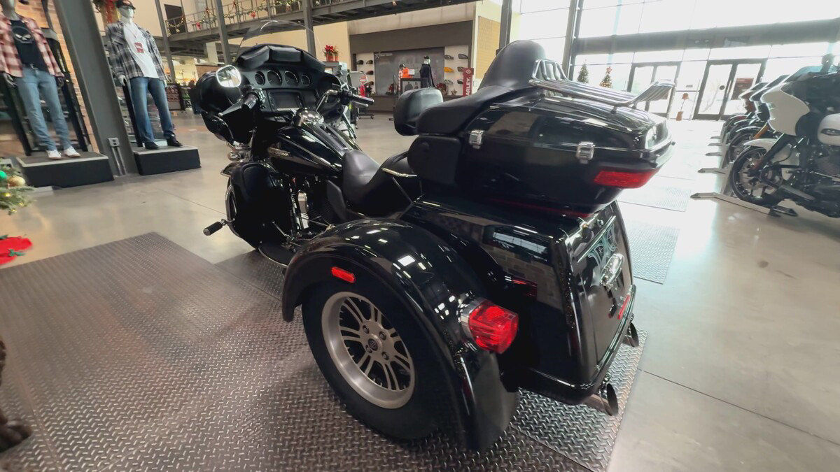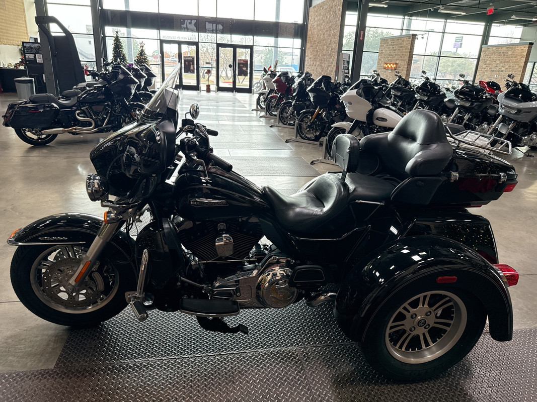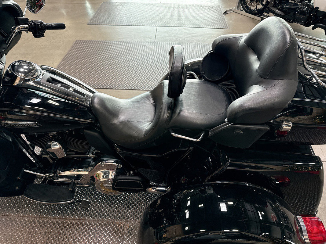 Dressed in a sleek black finish complemented by pinstripe accents, this trike commands attention whether parked or cruising down the highway. The iconic Harley-Davidson aesthetic shines through, resonating with the brand's deep-rooted heritage and spirit of individuality.