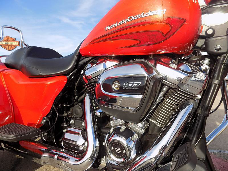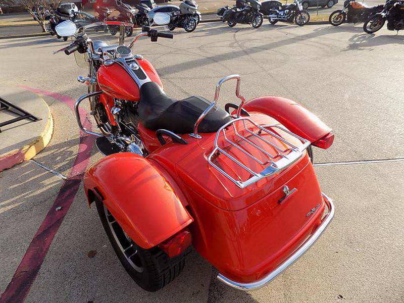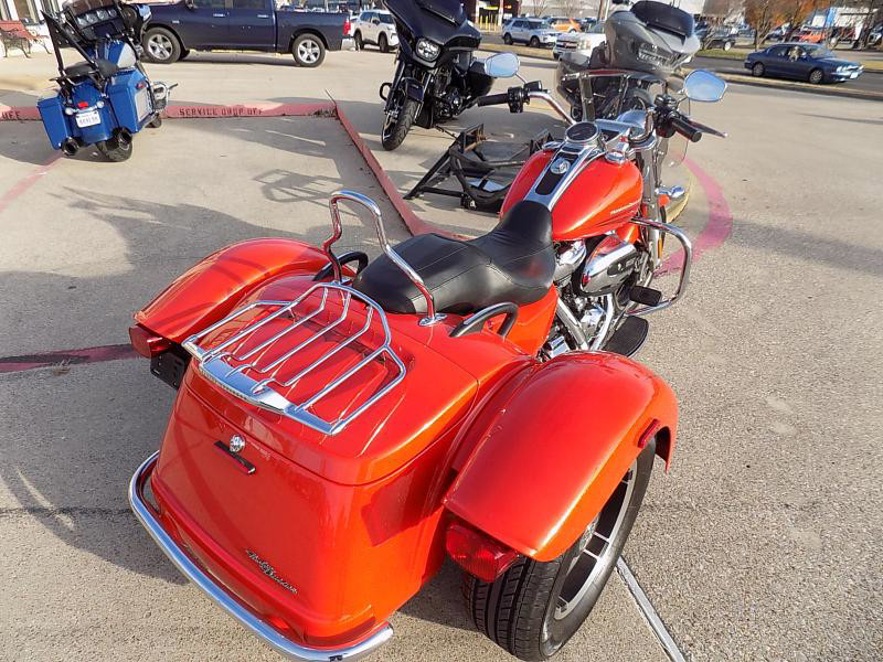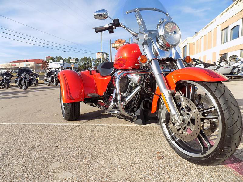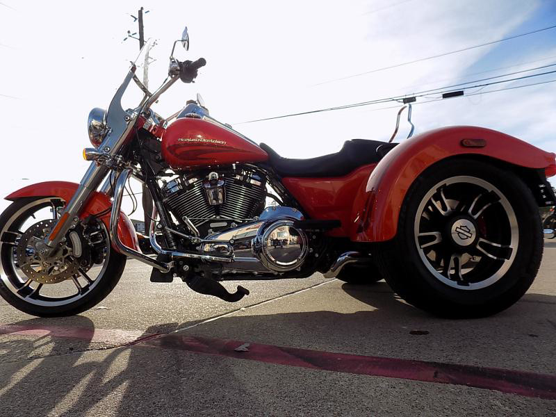 The 2017 Harley-Davidson Freewheeler is an eye-catching trike that combines classic Harley-Davidson charm with a vibrant, modern twist. This used model is adorned in a striking Laguna Orange exterior, turning heads wherever it rolls. The Freewheeler is a perfect blend of vintage aesthetics and cutting-edge engineering, designed for those who seek adventure with comfort and style.